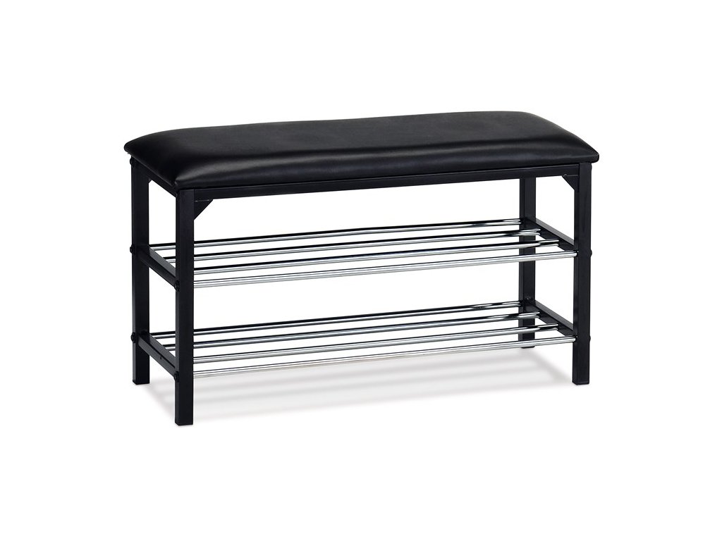 Botník s taburetem kombinuje praktické uspořádání s pohodlným posezením. Černý matný kovový rám je doplněn o dvě chromované police, které poskytují dostatek prostoru pro uložení obuvi. Sedák je potažen černou ekokůží, která se snadno udržuje a nabízí komfortní místo k sezení při obouvání. Kompaktní rozměry a minimalistický design umožňují snadné začlenění do různých interiérů, zejména předsíní a vstupních hal.