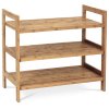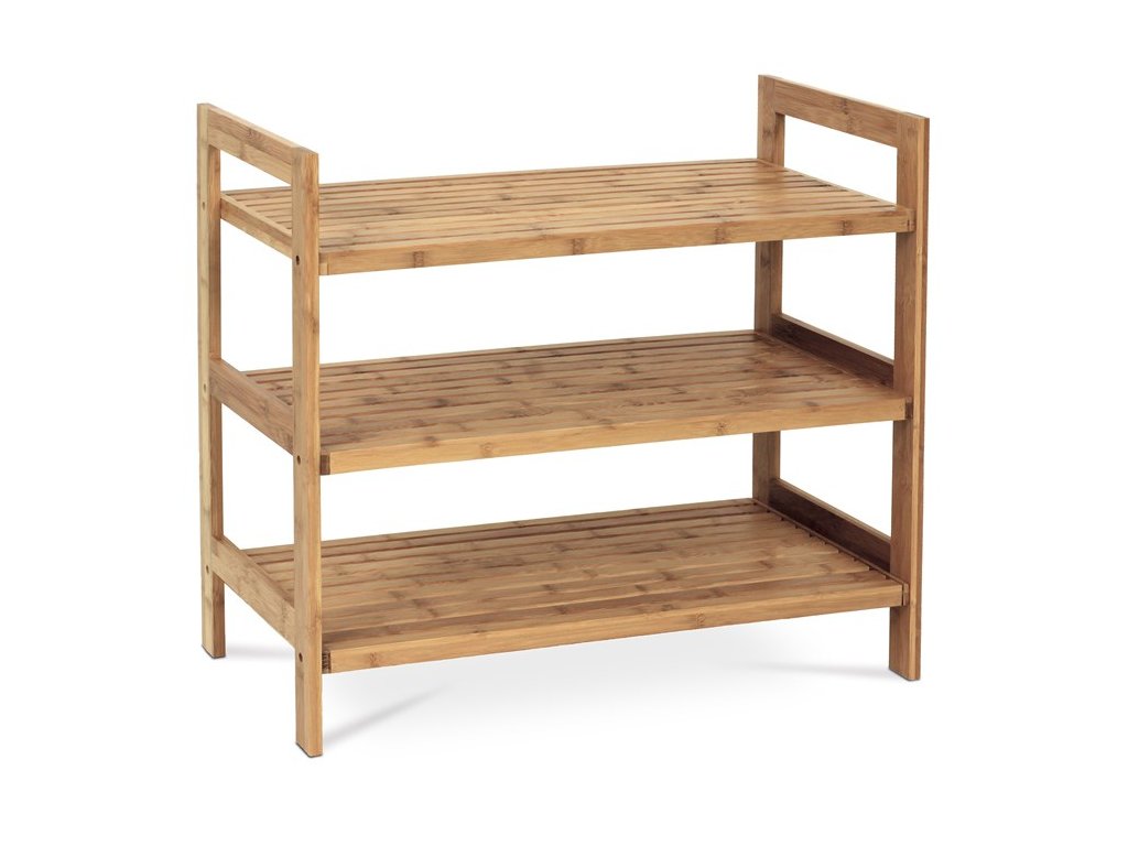 Botník s třemi policemi z masivního bambusu v přírodním odstínu nabízí praktické a estetické řešení pro uspořádání obuvi. Jeho pevné tělo z bambusového dřeva zajišťuje stabilitu a dlouhou životnost, přičemž přírodní textura materiálu přináší do interiéru příjemný a svěží vzhled. Police jsou tvořeny z bambusových lamel, které umožňují cirkulaci vzduchu a pomáhají udržovat obuv v suchu. Kompaktní rozměry botníku umožňují jeho umístění do předsíní i menších prostor. Díky jednoduchému designu se snadno kombinuje s různými styly vybavení.