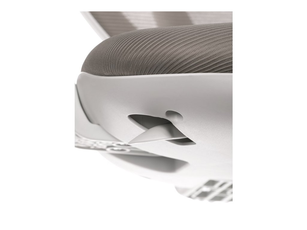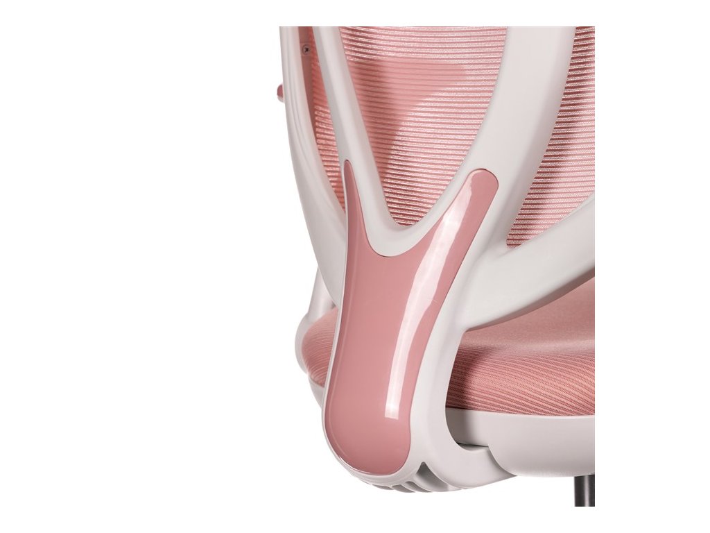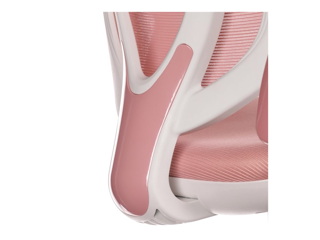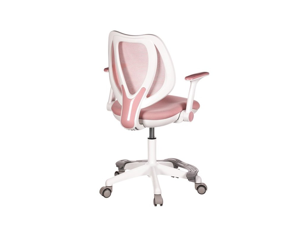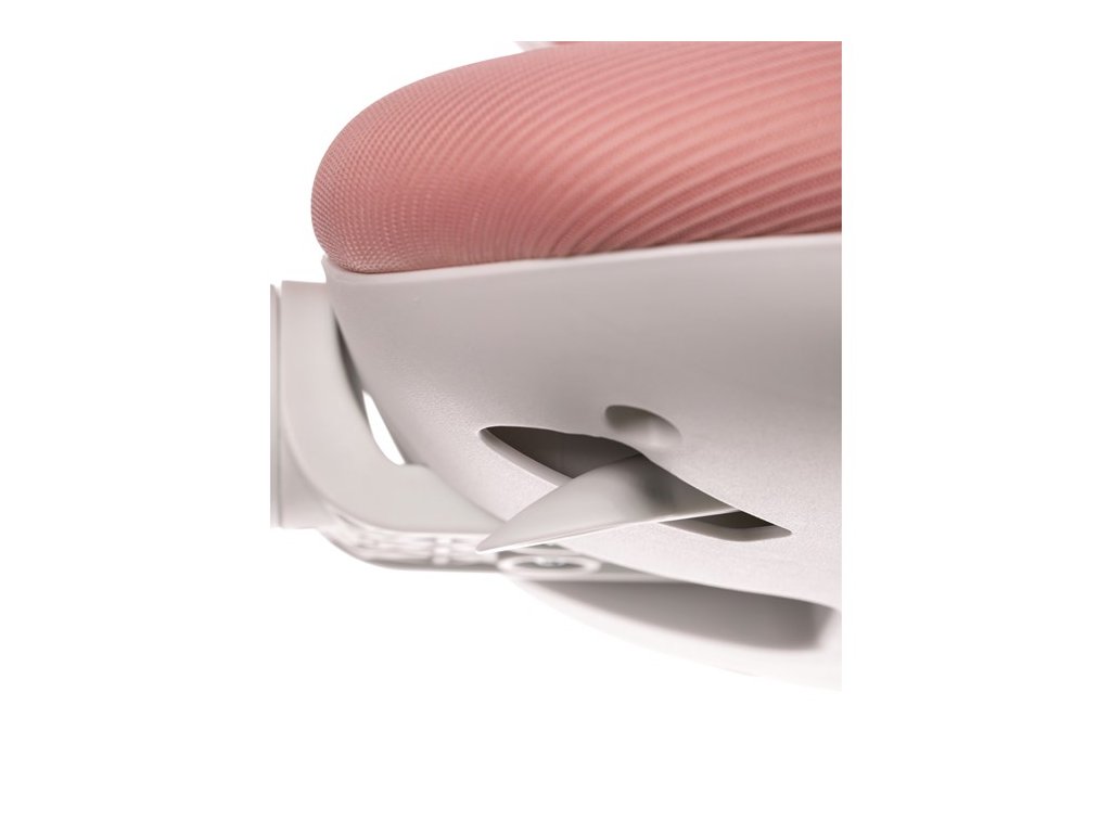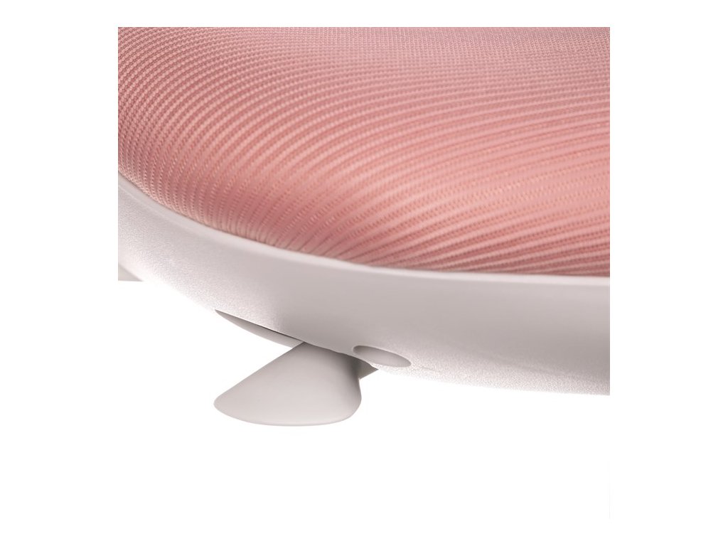 Dětská židle v příjemných pastelových barvách spolu s bílou kostrou nabízí jednoduchý a elegantní design. Židle má pevný opěrák potažený prodyšným síťovaným materiálem. Sedák ve stejném potahu poskytuje dostatek pohodlí díky svému vyměkčení. Pro pocit pohodlí slouží pevné područky, které jsou na své vrchní části opatřeny lesklým plastovým povrchem v barvě potahového materiálu. Důležitá je také integrovaná opěra nohou, která přispívá k pohodlnému sezení. Židle je opatřena speciálními funkčními kolečky, která se při zatížení automaticky zablokují, což zabraňuje nechtěným pohybům židle.