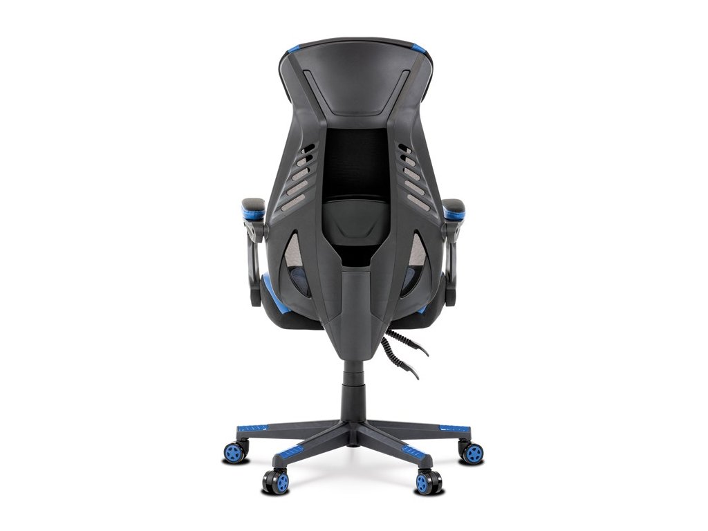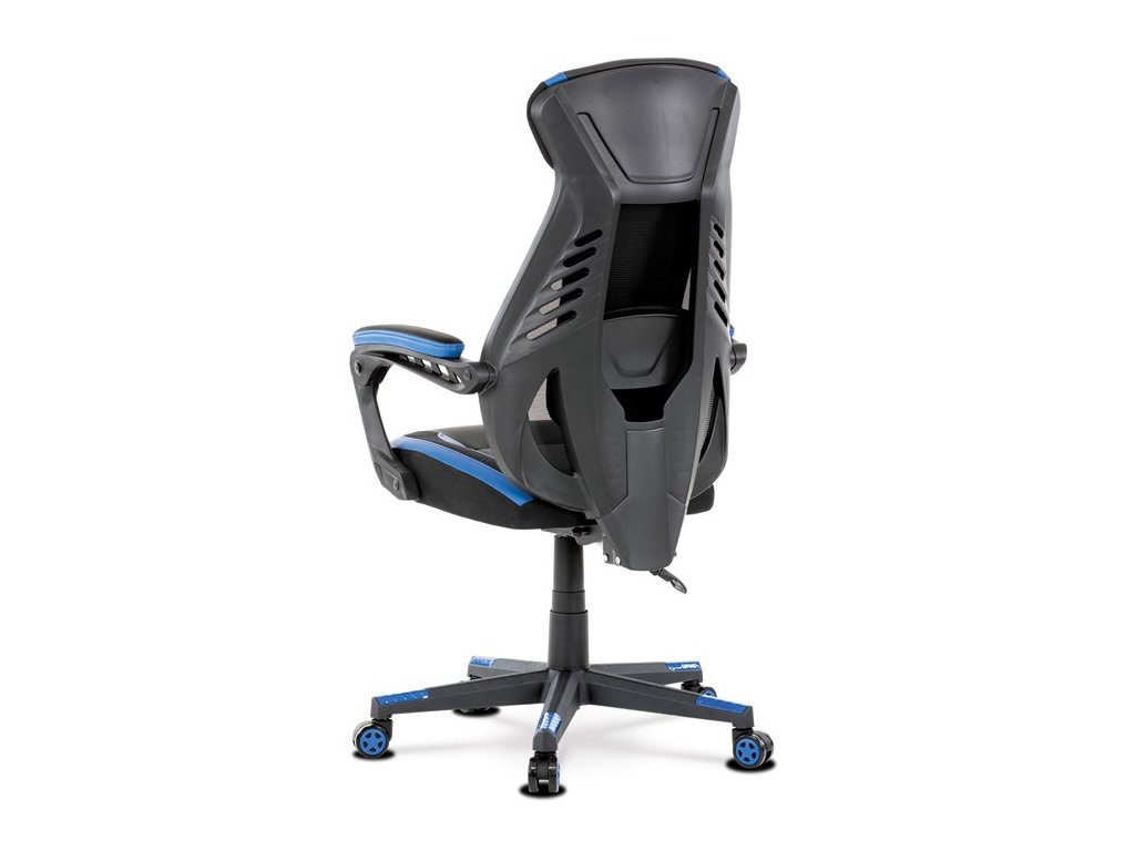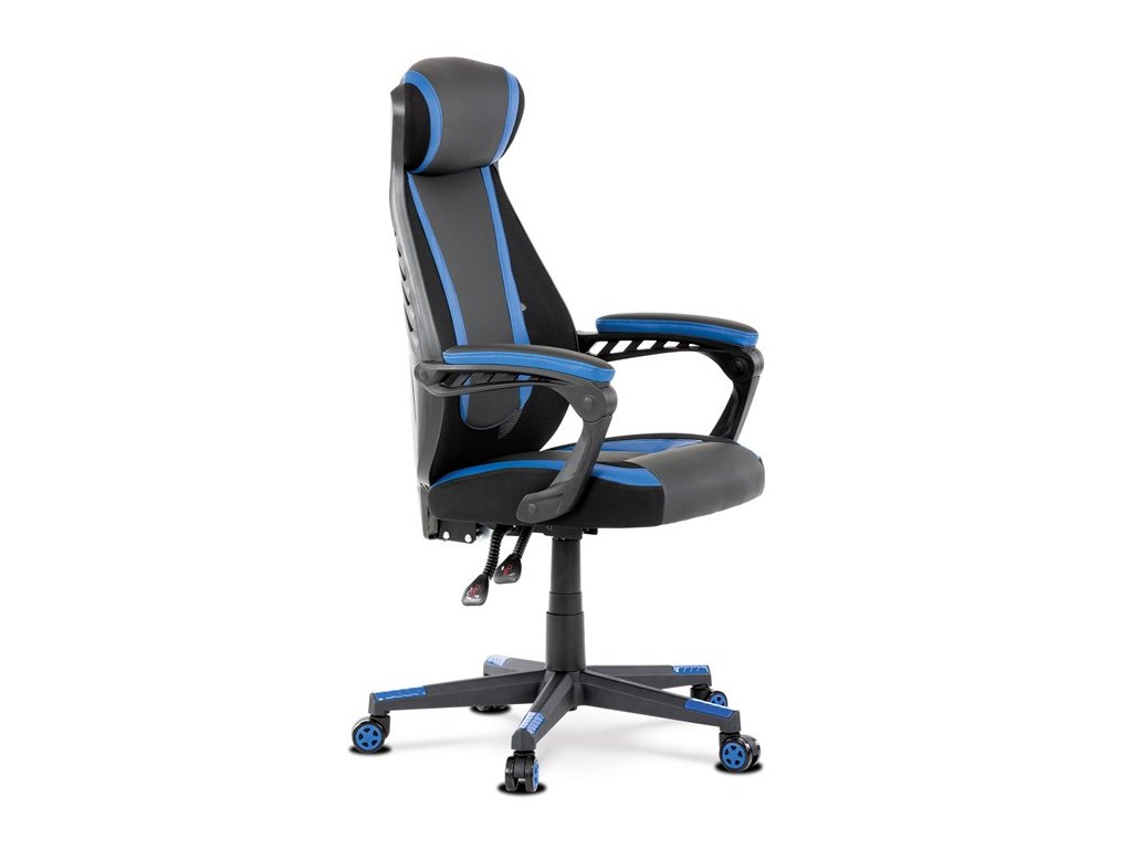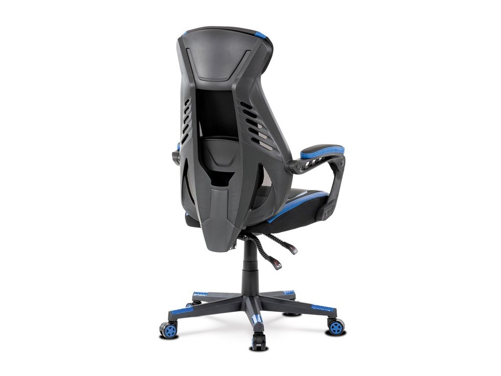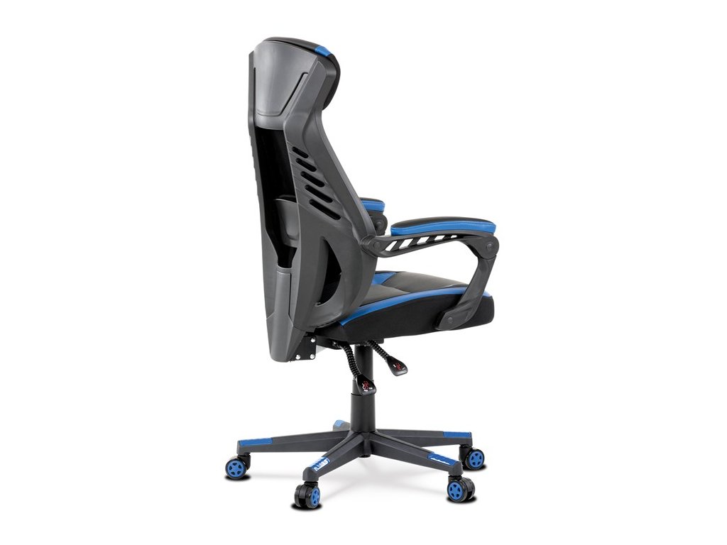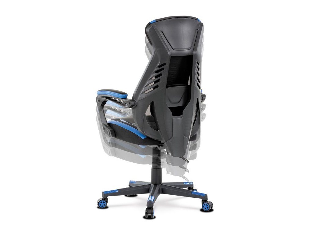 Luxusní herní a kancelářské křeslo z kolekce TOP racing. Jedná se o moderní designové křeslo, navržené nejen pro náročné požadavky PC hráčů, ale je uzpůsobené i pro standardní kancelářskou práci. To vše v maximálním pohodlí a při dokonalé ergonomii sezení. Potah je kombinací modré a černé perforované ekokůže na sedáku i opěráku, černé síťoviny MESH a černé, jemně hrubé látky látky na sedáku i bocích opěrky hlavy. Opěrák je černý plastový výlisek ve futuristickém designu. Výplň sedáku i hlavové opěrky je z velmi kvalitní a tuhé PU pěny, vyztužení a pružnost zajišťují látkové popruhy. Křeslo je vybaveno houpacím mechanismem s plynulou aretací. Při vypnutí je možné se s opěradlem volně pohupovat. Výška sezení se upravuje jednou páčkou na pravé straně přes kvalitní plynový píst. Poloha opěráku se nastavuje druhou páčkou, umístěnou rovněž na pravé straně křesla. Masivní černý plastový kříž s modrými protiskluzovými plastovými doplňky je osazen černými plastovými kolečky pr. 6 cm s modrým racing středem a gumovým obvodem ideálními na tvrdé podlahy. Se stabilitou celých 70 cm průměru kříže si můžete dovolit i ty nejnáročnější hry. Vysoký, prodyšný a ergonomicky navržený opěrák s integrovanou zesílenou opěrkou hlavy, polstrovanou a výškově nastavitelnou bederní opěrkou slouží nejen jako výborná opora celých zad a také podporuje správné držení páteře. Područky jsou plastové, polstrované a potažené modrou a černou ekokůží. Šíře je 7 cm, délka ložné plochy 33 cm a výška 3 cm. Při sklápění sedáku se pohybují a kopírují jeho pohyb a polohu. Nosnost židle je až 130 kg.