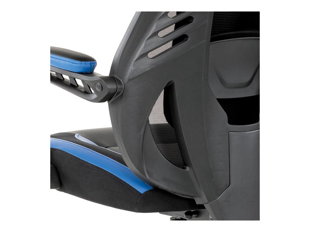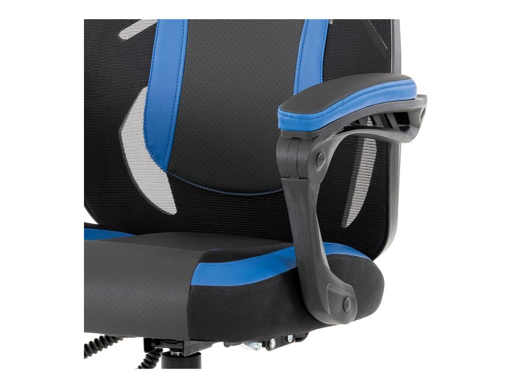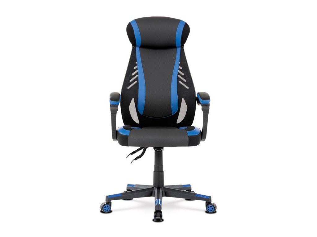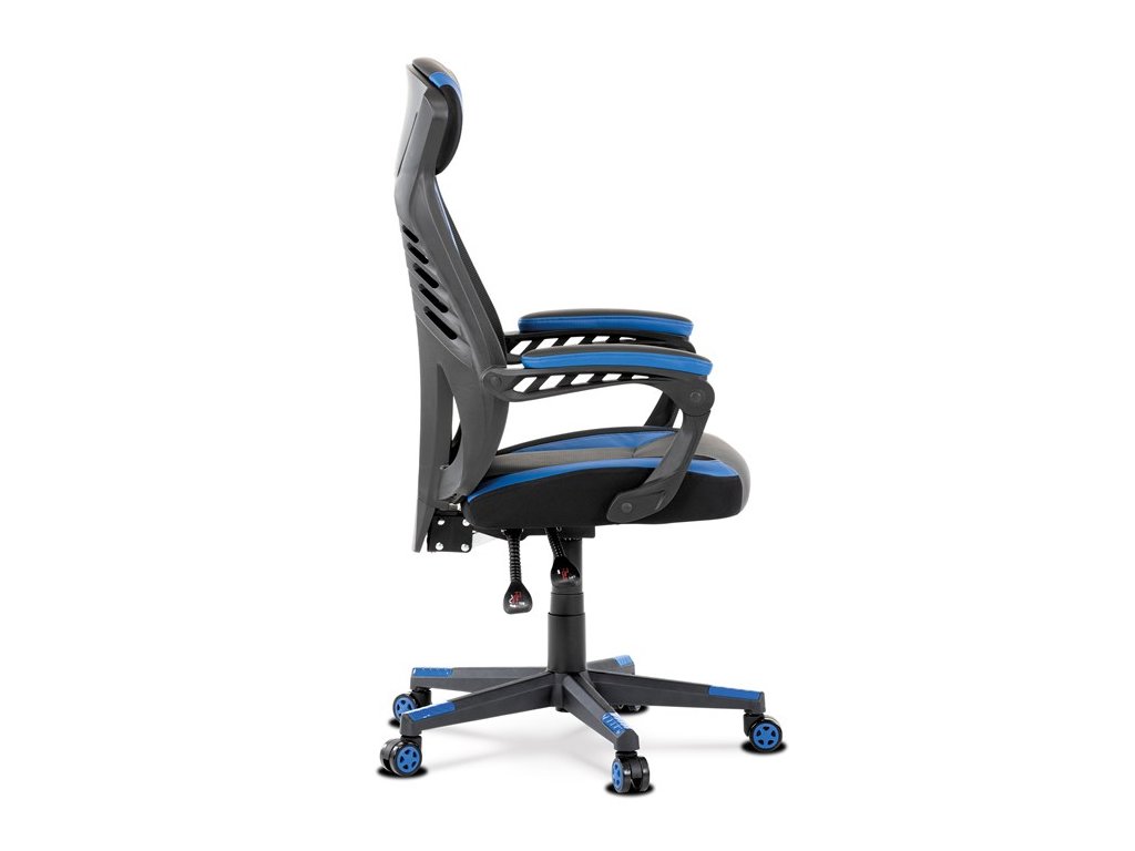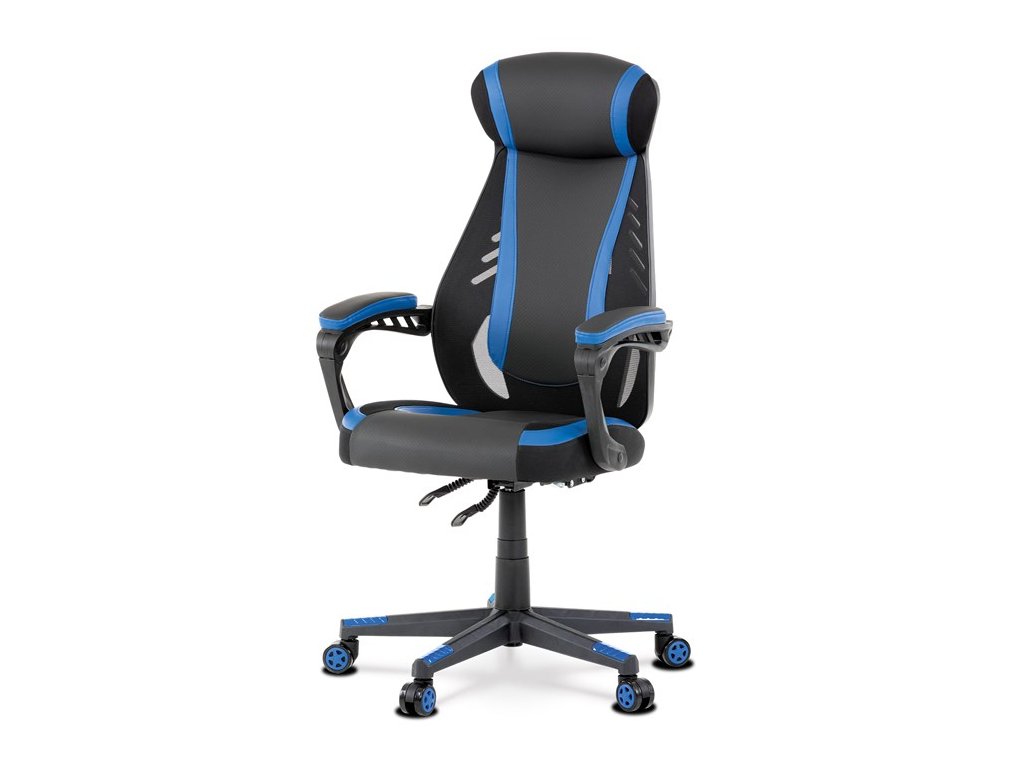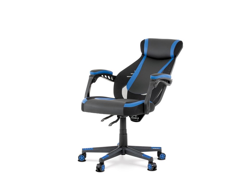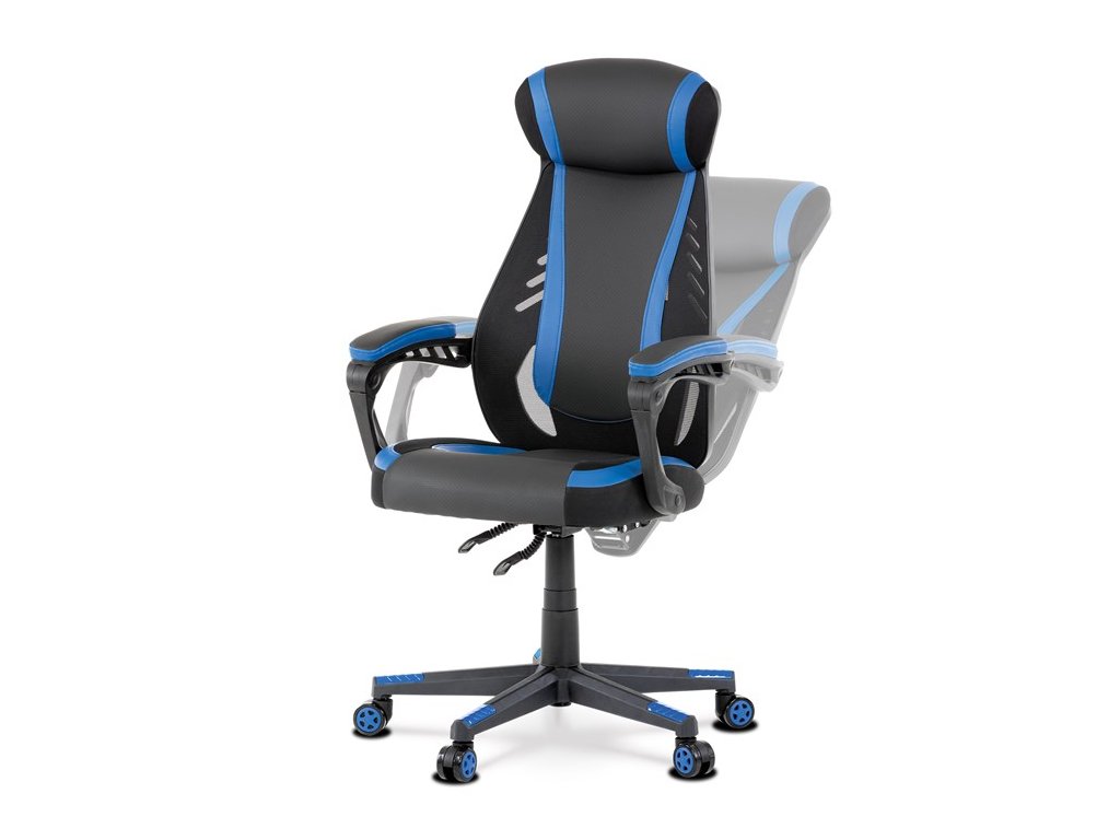 Luxusní herní a kancelářské křeslo z kolekce TOP racing. Jedná se o moderní designové křeslo, navržené nejen pro náročné požadavky PC hráčů, ale je uzpůsobené i pro standardní kancelářskou práci. To vše v maximálním pohodlí a při dokonalé ergonomii sezení. Potah je kombinací modré a černé perforované ekokůže na sedáku i opěráku, černé síťoviny MESH a černé, jemně hrubé látky látky na sedáku i bocích opěrky hlavy. Opěrák je černý plastový výlisek ve futuristickém designu. Výplň sedáku i hlavové opěrky je z velmi kvalitní a tuhé PU pěny, vyztužení a pružnost zajišťují látkové popruhy. Křeslo je vybaveno houpacím mechanismem s plynulou aretací. Při vypnutí je možné se s opěradlem volně pohupovat. Výška sezení se upravuje jednou páčkou na pravé straně přes kvalitní plynový píst. Poloha opěráku se nastavuje druhou páčkou, umístěnou rovněž na pravé straně křesla. Masivní černý plastový kříž s modrými protiskluzovými plastovými doplňky je osazen černými plastovými kolečky pr. 6 cm s modrým racing středem a gumovým obvodem ideálními na tvrdé podlahy. Se stabilitou celých 70 cm průměru kříže si můžete dovolit i ty nejnáročnější hry. Vysoký, prodyšný a ergonomicky navržený opěrák s integrovanou zesílenou opěrkou hlavy, polstrovanou a výškově nastavitelnou bederní opěrkou slouží nejen jako výborná opora celých zad a také podporuje správné držení páteře. Područky jsou plastové, polstrované a potažené modrou a černou ekokůží. Šíře je 7 cm, délka ložné plochy 33 cm a výška 3 cm. Při sklápění sedáku se pohybují a kopírují jeho pohyb a polohu. Nosnost židle je až 130 kg.
