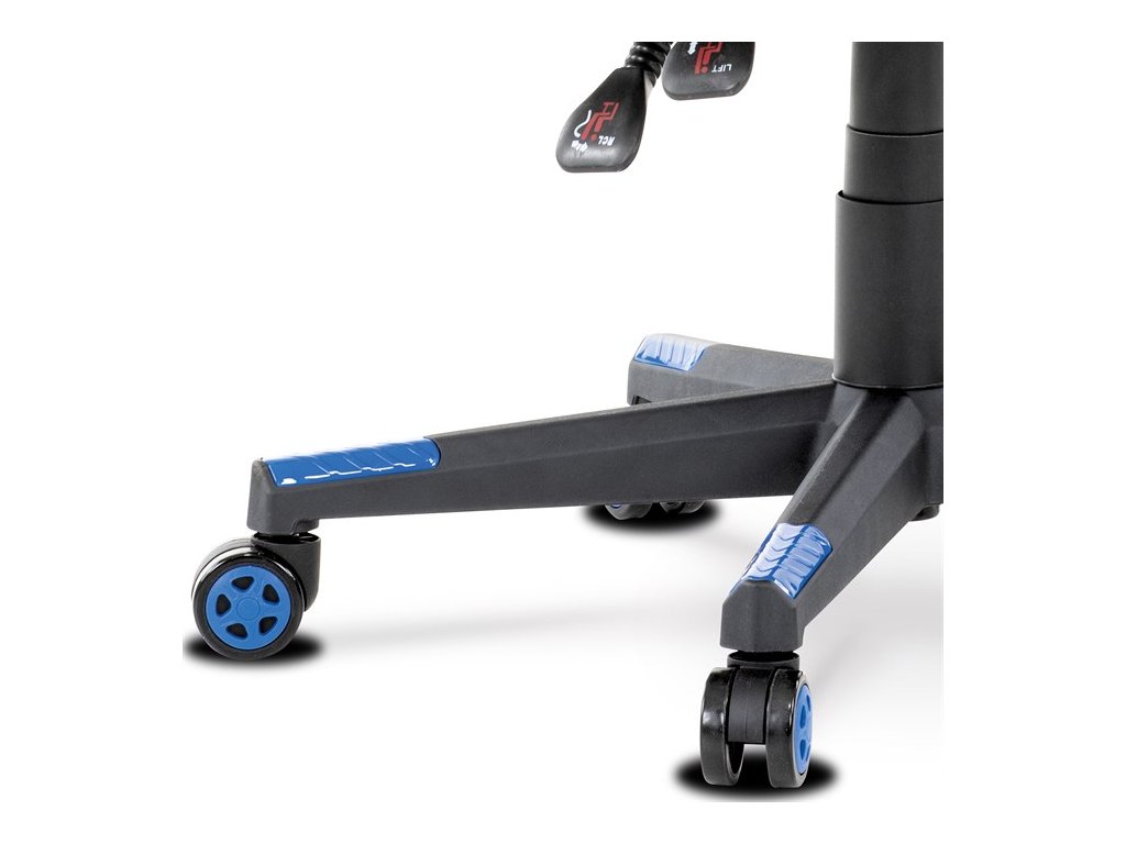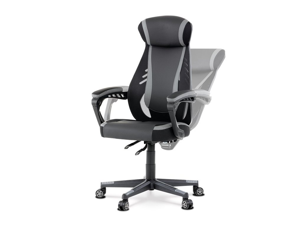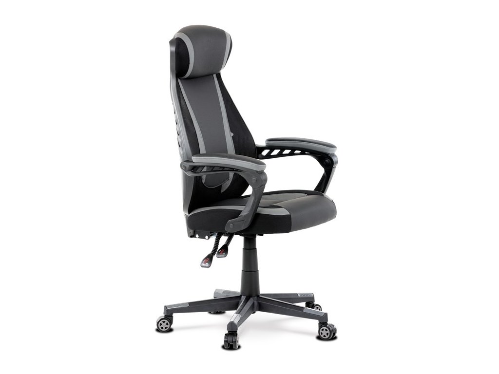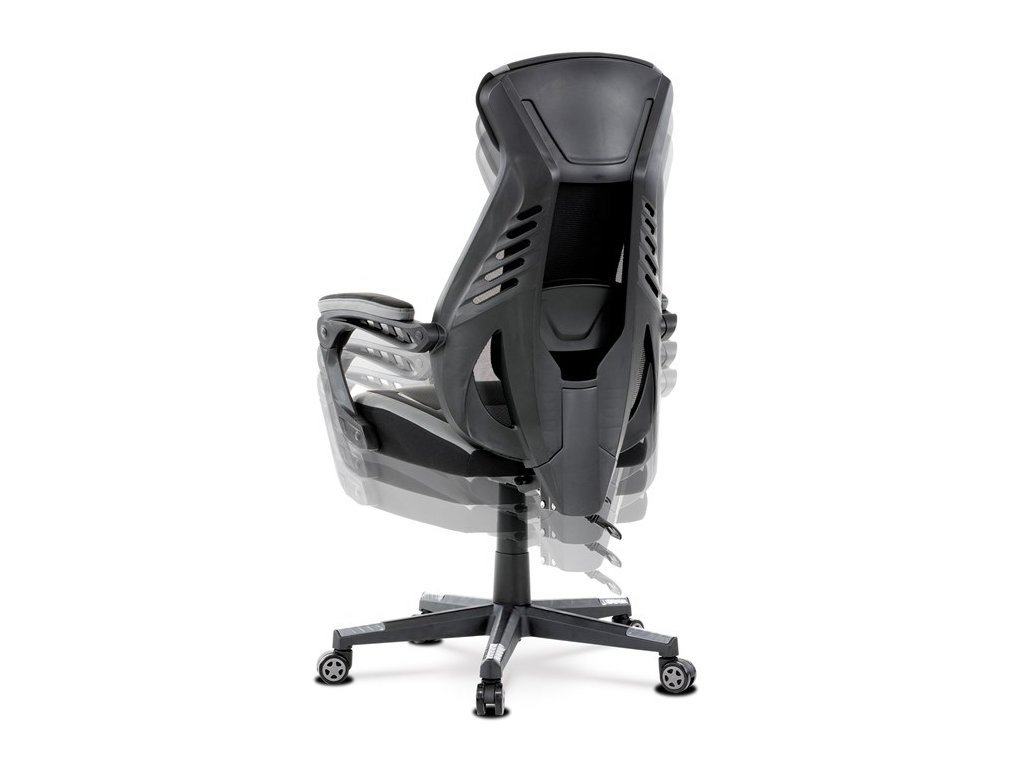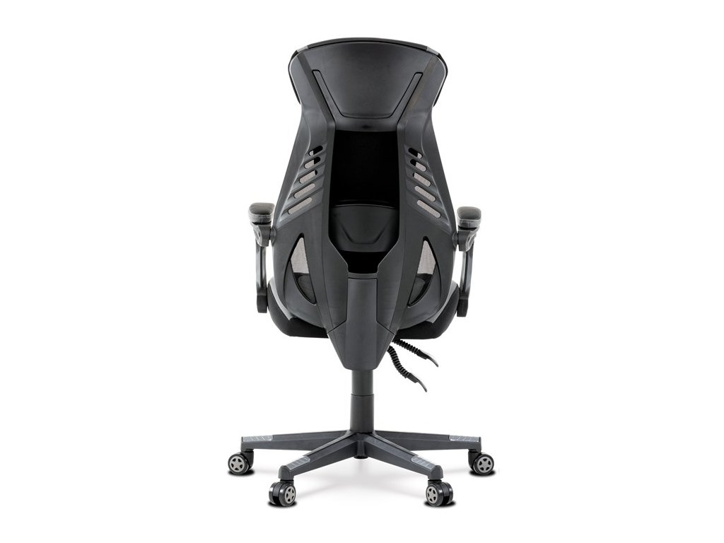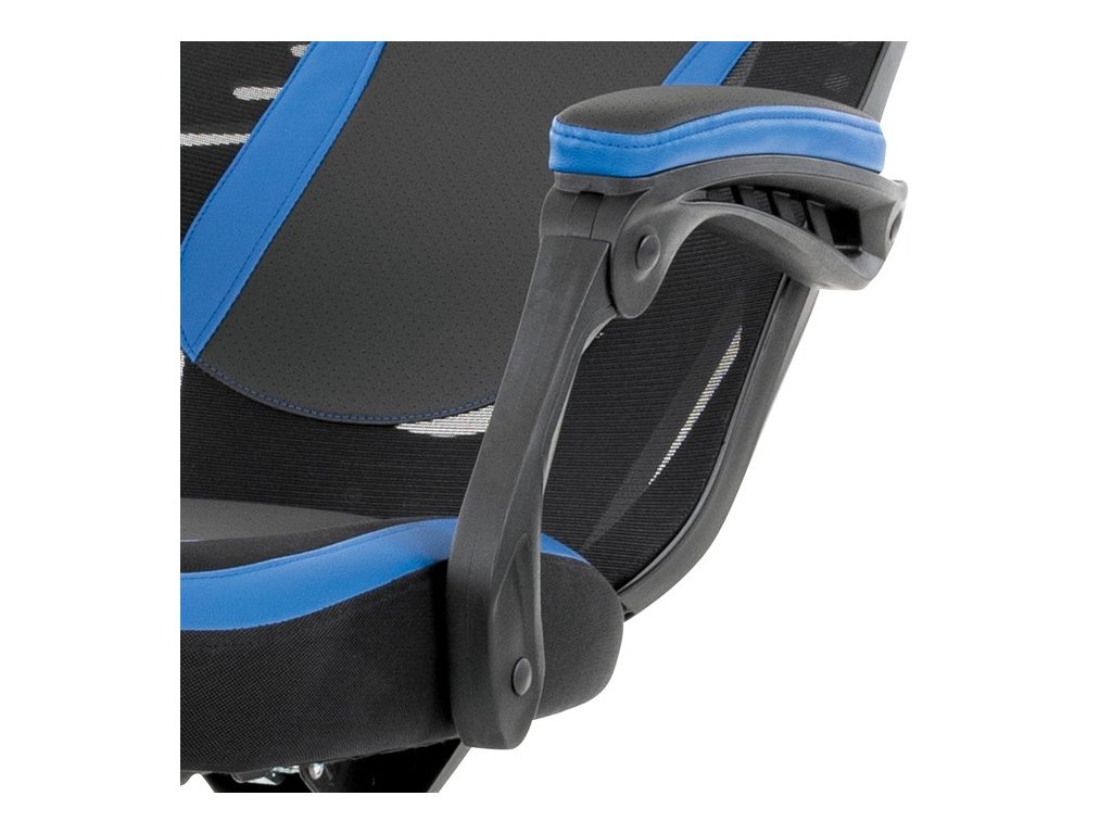 Luxusní herní a kancelářské křeslo z kolekce TOP racing. Jedná se o moderní designové křeslo, navržené nejen pro náročné požadavky PC hráčů, ale je uzpůsobené i pro standardní kancelářskou práci. To vše v maximálním pohodlí a při dokonalé ergonomii sezení. Potah je kombinací modré a černé perforované ekokůže na sedáku i opěráku, černé síťoviny MESH a černé, jemně hrubé látky látky na sedáku i bocích opěrky hlavy. Opěrák je černý plastový výlisek ve futuristickém designu. Výplň sedáku i hlavové opěrky je z velmi kvalitní a tuhé PU pěny, vyztužení a pružnost zajišťují látkové popruhy. Křeslo je vybaveno houpacím mechanismem s plynulou aretací. Při vypnutí je možné se s opěradlem volně pohupovat. Výška sezení se upravuje jednou páčkou na pravé straně přes kvalitní plynový píst. Poloha opěráku se nastavuje druhou páčkou, umístěnou rovněž na pravé straně křesla. Masivní černý plastový kříž s modrými protiskluzovými plastovými doplňky je osazen černými plastovými kolečky pr. 6 cm s modrým racing středem a gumovým obvodem ideálními na tvrdé podlahy. Se stabilitou celých 70 cm průměru kříže si můžete dovolit i ty nejnáročnější hry. Vysoký, prodyšný a ergonomicky navržený opěrák s integrovanou zesílenou opěrkou hlavy, polstrovanou a výškově nastavitelnou bederní opěrkou slouží nejen jako výborná opora celých zad a také podporuje správné držení páteře. Područky jsou plastové, polstrované a potažené modrou a černou ekokůží. Šíře je 7 cm, délka ložné plochy 33 cm a výška 3 cm. Při sklápění sedáku se pohybují a kopírují jeho pohyb a polohu. Nosnost židle je až 130 kg.