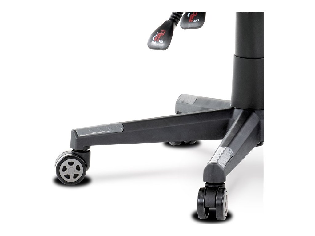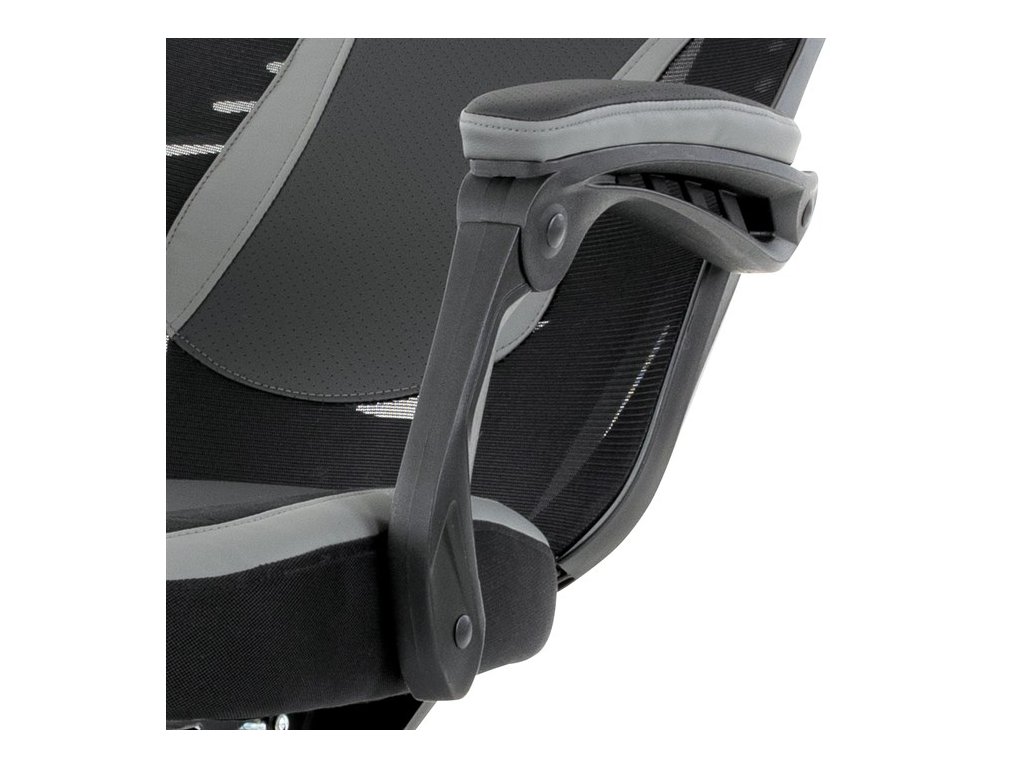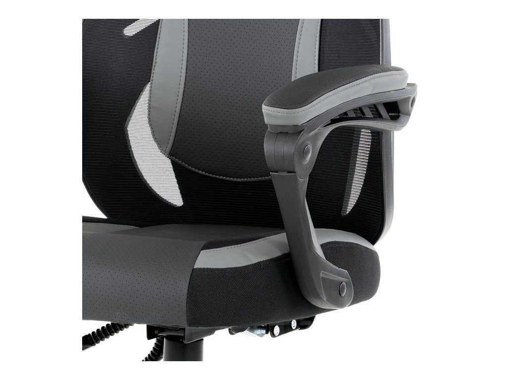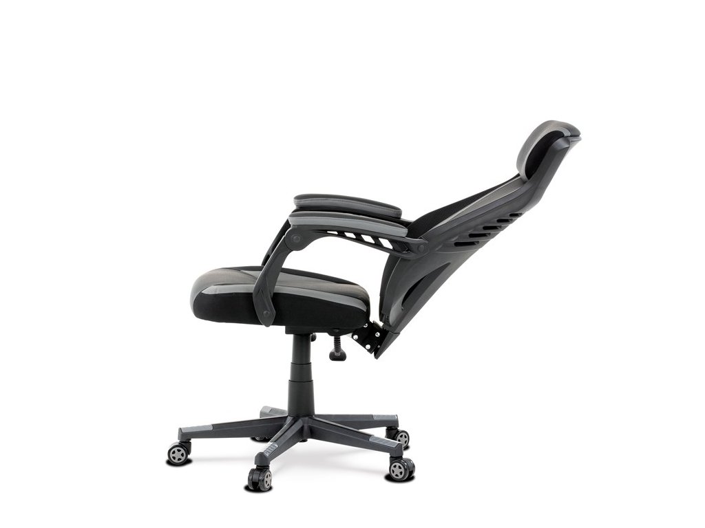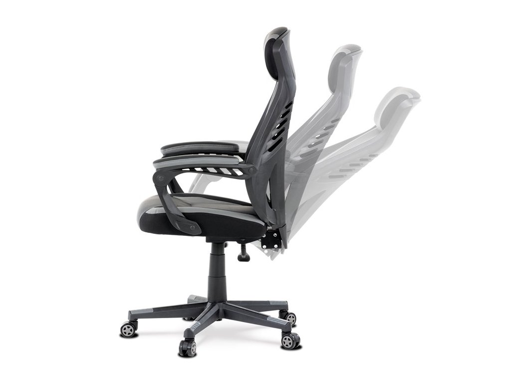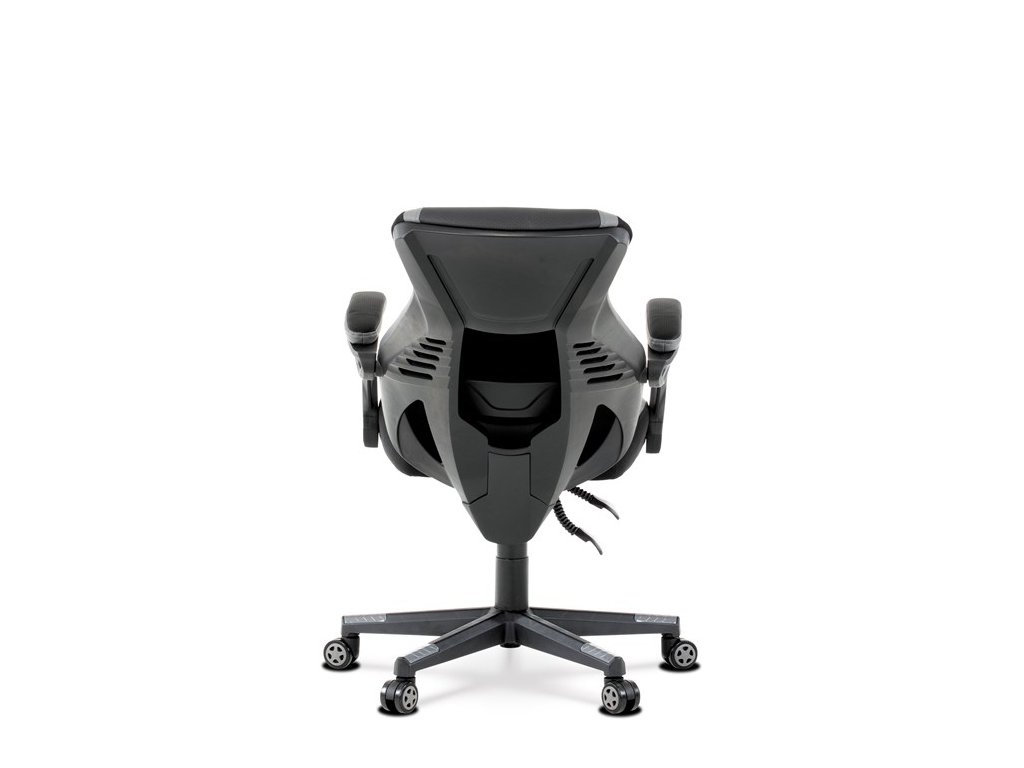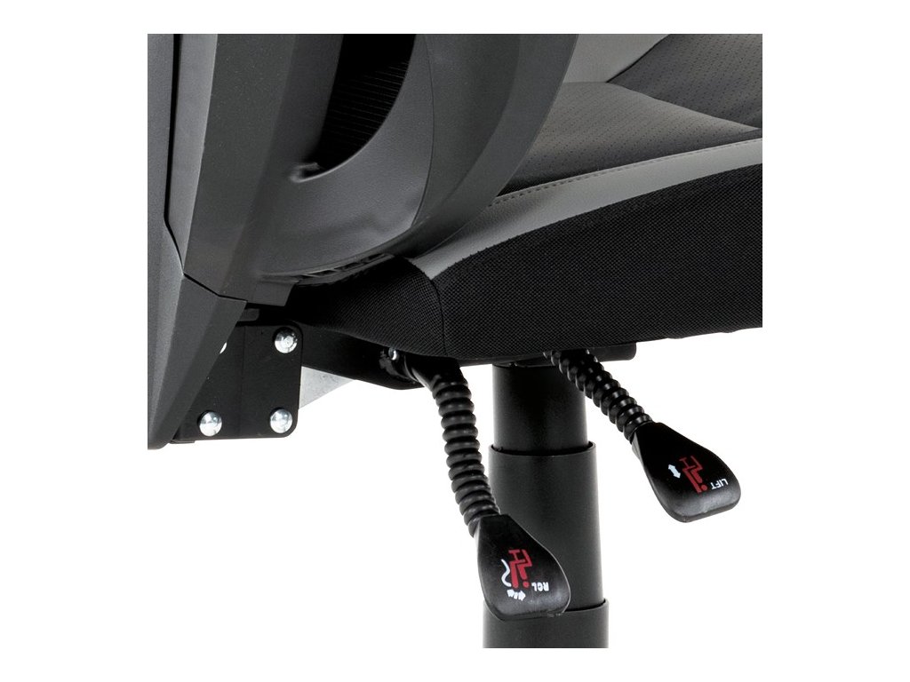 Luxusní herní a kancelářské křeslo z kolekce TOP racing. Jedná se o moderní designové křeslo, navržené nejen pro náročné požadavky PC hráčů, ale je uzpůsobené i pro standardní kancelářskou práci. To vše v maximálním pohodlí a při dokonalé ergonomii sezení. Potah je kombinací modré a černé perforované ekokůže na sedáku i opěráku, černé síťoviny MESH a černé, jemně hrubé látky látky na sedáku i bocích opěrky hlavy. Opěrák je černý plastový výlisek ve futuristickém designu. Výplň sedáku i hlavové opěrky je z velmi kvalitní a tuhé PU pěny, vyztužení a pružnost zajišťují látkové popruhy. Křeslo je vybaveno houpacím mechanismem s plynulou aretací. Při vypnutí je možné se s opěradlem volně pohupovat. Výška sezení se upravuje jednou páčkou na pravé straně přes kvalitní plynový píst. Poloha opěráku se nastavuje druhou páčkou, umístěnou rovněž na pravé straně křesla. Masivní černý plastový kříž s modrými protiskluzovými plastovými doplňky je osazen černými plastovými kolečky pr. 6 cm s modrým racing středem a gumovým obvodem ideálními na tvrdé podlahy. Se stabilitou celých 70 cm průměru kříže si můžete dovolit i ty nejnáročnější hry. Vysoký, prodyšný a ergonomicky navržený opěrák s integrovanou zesílenou opěrkou hlavy, polstrovanou a výškově nastavitelnou bederní opěrkou slouží nejen jako výborná opora celých zad a také podporuje správné držení páteře. Područky jsou plastové, polstrované a potažené modrou a černou ekokůží. Šíře je 7 cm, délka ložné plochy 33 cm a výška 3 cm. Při sklápění sedáku se pohybují a kopírují jeho pohyb a polohu. Nosnost židle je až 130 kg.