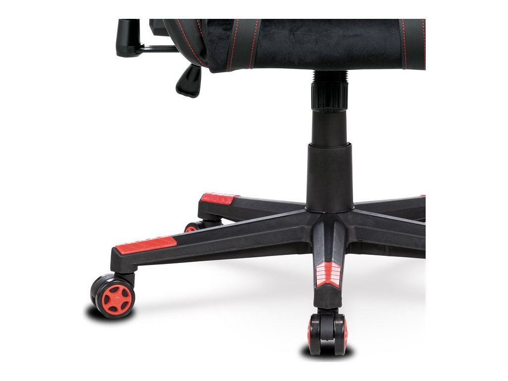 Herní křeslo E-racer v černé barvě kombinuje sametovou látku s ekokůží, což zajišťuje příjemný dotek a snadnou údržbu. Pevná plastová podnož je vybavena pěti kolečky pro snadnou mobilitu a stabilitu. Křeslo disponuje houpacím mechanismem umožňujícím nastavení opěradla až do polohy 180°, což přispívá k maximálnímu pohodlí během dlouhých herních sezení. Výškově nastavitelné sedadlo a jednosměrné 1D područky umožňují přizpůsobení podle individuálních potřeb uživatele. Celkový design s výrazným červeným prošitím a ergonomickým tvarem opěradla podporuje správné držení těla a komfort při práci i hraní.