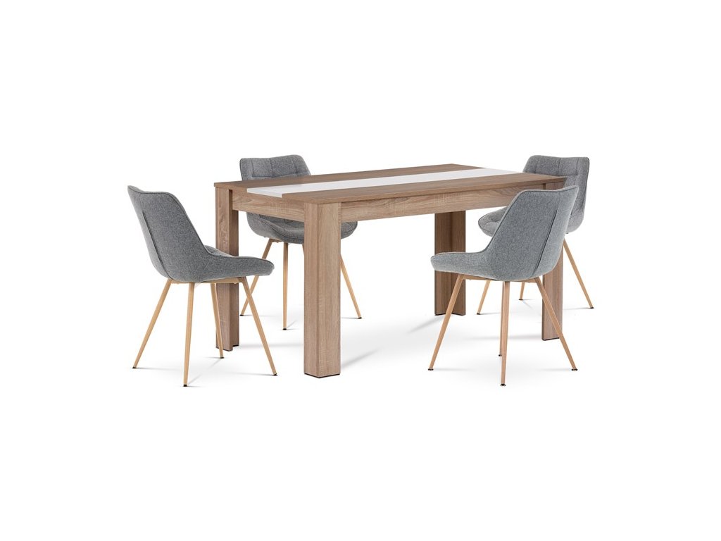 Jídelní set 1+4 s přírodním dekorem dub sonoma kombinuje praktický stůl o rozměrech 138 × 80 cm s čtyřmi židlemi potaženými šedou látkou. Stůl je vyroben z MDF desky s povrchovou úpravou v dekoru dub sonoma, která zajišťuje snadnou údržbu a odolnost proti běžnému opotřebení. Robustní nohy stolu jsou rovněž z MDF, což přispívá k jeho stabilitě a pevnosti. Židle mají ergonomicky tvarované sedáky a opěradla čalouněné příjemnou šedou látkou, která nabízí komfort při sezení. Celý set je navržen pro pohodlné stolování až pro čtyři osoby a díky neutrálnímu barevnému provedení se hodí do různých interiérových stylů.