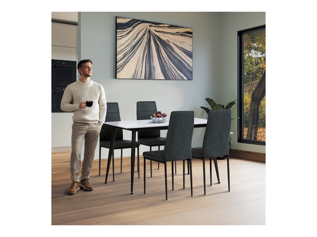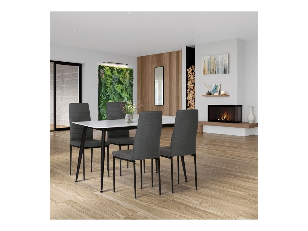 Moderní jídelní set Autronic v industriálním stylu je skvělou volbou pro vaši jídelnu. Obdélníkový stůl s deskou ze slinuté keramiky v bílém mramorovém dekoru působí elegantně a je odolný vůči poškrábání. Stabilitu zajišťují černé kovové nohy s jemně kónickým tvarem. Pohodlné židle mají čalounění z hladké černé látky a ergonomicky tvarovanou opěrku pro maximální komfort. Černé kovové nohy ladí se stolem a dodávají celku jednotný vzhled. Ideální volba pro stylové a funkční stolování.