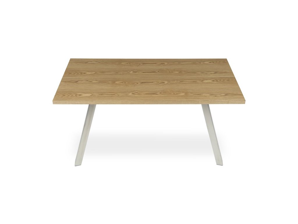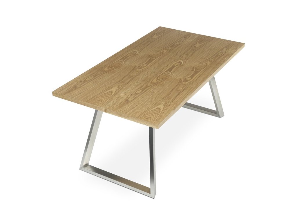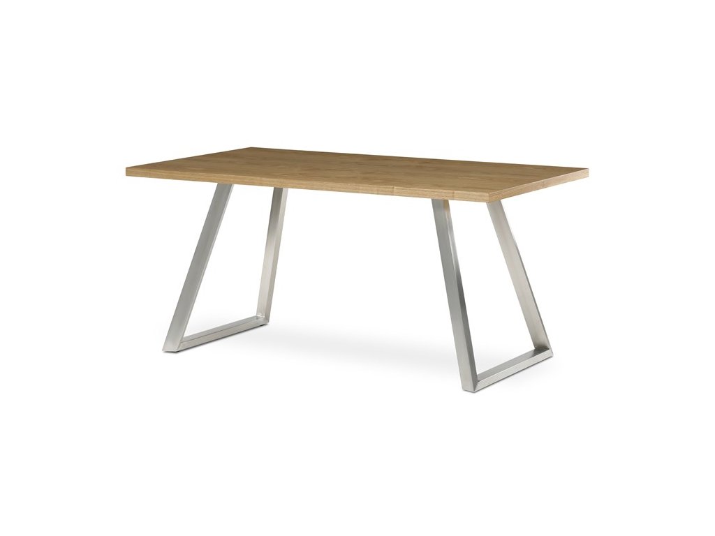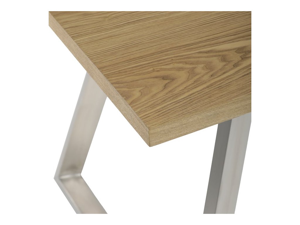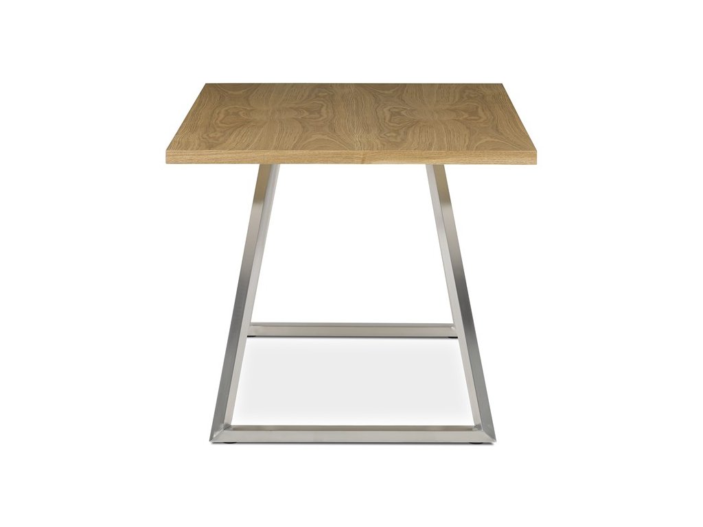 Jídelní stůl HT-W1515 OAK kombinuje přírodní vzhled dubové dýhy s moderním provedením broušeného nerezu, který tvoří stabilní kovovou podnož. Deska stolu o rozměrech 160 × 90 cm je vyrobena z MDF s vrchní vrstvou dýhy v matném hnědém odstínu, což zajišťuje příjemnou strukturu a snadnou údržbu povrchu. Pevná kovová podnož v designu lichoběžníkových rámů poskytuje vysokou stabilitu a odolnost při každodenním používání. Výška 75 cm odpovídá standardním ergonomickým parametrům pro pohodlné stolování. Celkově je stůl navržen tak, aby spojil estetiku přírodního dřeva s funkčností moderního kovového základu.