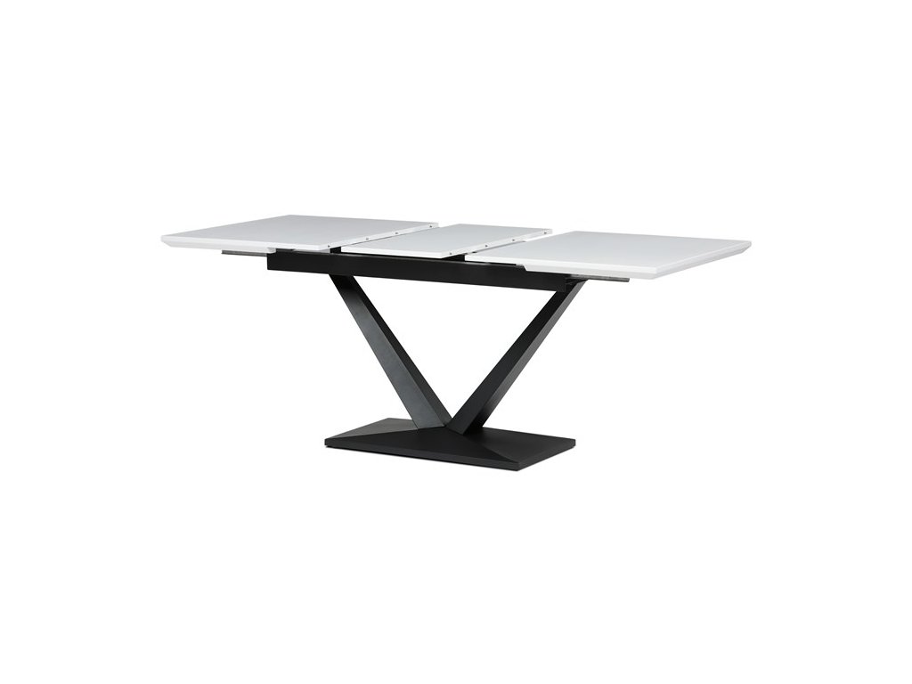 Rozkládací jídelní stůl značky Autronic vyniká svou robustní centrální nohou ve tvaru V. Bílá matná deska z MDF materiálu nabízí odolný a snadno udržovatelný povrch, ideální pro každodenní stolování. Díky rozkládacímu mechanismu snadno přizpůsobíte velikost stolu aktuálním potřebám, což je skvělé pro rodinná setkání nebo hosty.Tento stůl bude stylovým a funkčním doplňkem každé jídelny, který zaujme na první pohled.