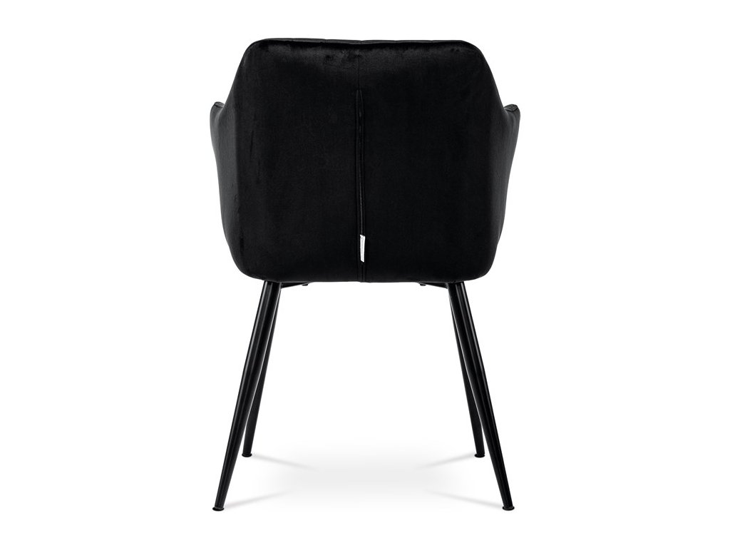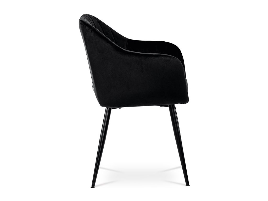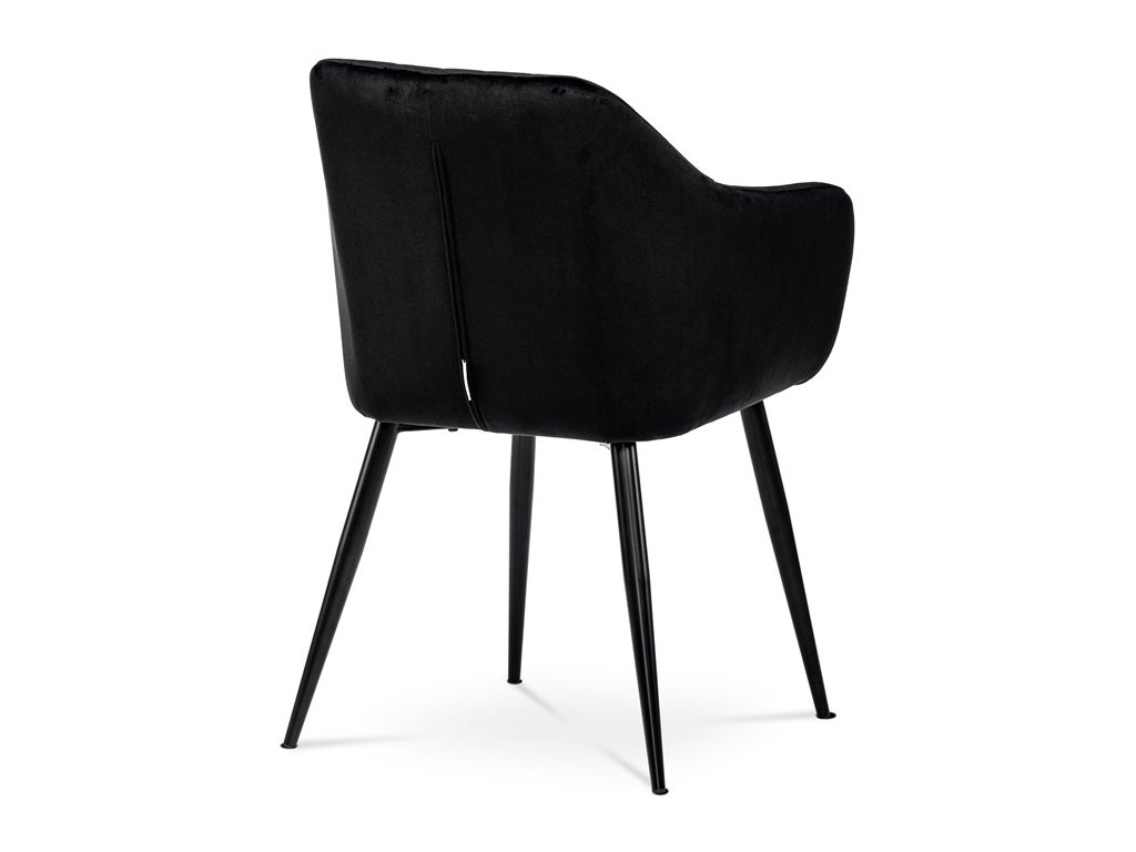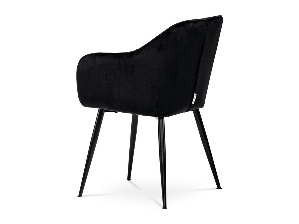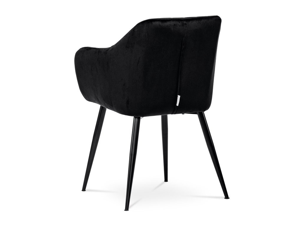 Dokonalý design, industriální styl a perfektní pohodlí je pro tuto židli samozřejmostí. Skořepina sedáku i opěradla má pevnou kovovou kostru, potah z velmi kvalitní sametové látky v matném provedení a nadčasovém a luxusním odstínu černé. Polstrování je z PU pěny. Bonusem ke zvýšení pohodlí posedu je 8 cm zvýšený a extra polstrovaný sedák a praktické pohodlné opěrky s opěrnou plochou ve výšce 69 cm od podlahy. Příjemný dekorativní prvek vytvářejí svislá prošití vnitřních částí opěradla i boků. Použitá látka je velmi odolná a perfektně se čistí. Stabilitu židle zajišťují čtyři kónické kovové nohy s kvalitním práškovým nástřikem v černé matné barvě. Ukončené jsou černými plastovými kluzáky, zabraňující poškození tvrdých povrchů podlah. Nohy mají kruhový průřez o průměru od 2 do 3,5 cm v horní části. Všechna tato plus produkují z tohoto modelu skvělou volbu pro Váš výběr zařízení jídelních a nebo obývacích prostor, ale skvěle se hodí i jako konferenční židle do zasedacích místností. Nosnost židle je až 120 kg. Základní rozměry jsou – celková šíře 58 cm, celková hloubka 57 cm, celková výška 84 cm, výška sedu 52 cm a hloubka sedu 43 cm.