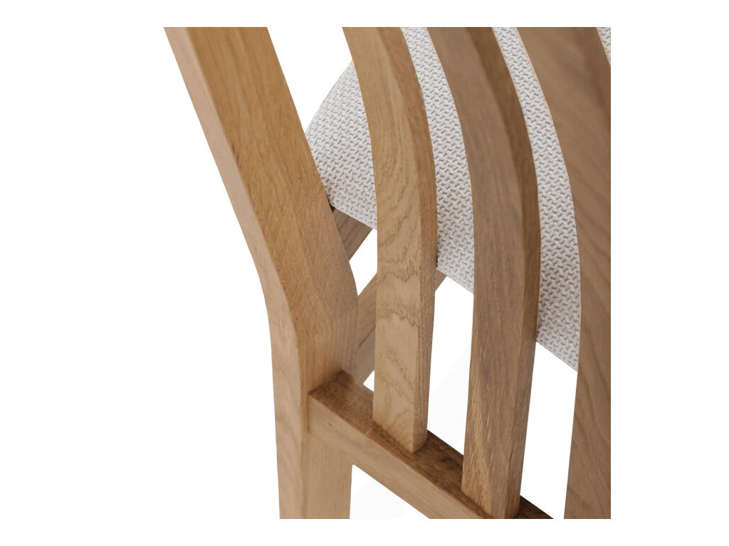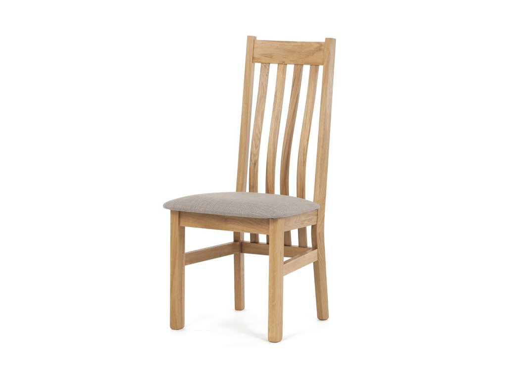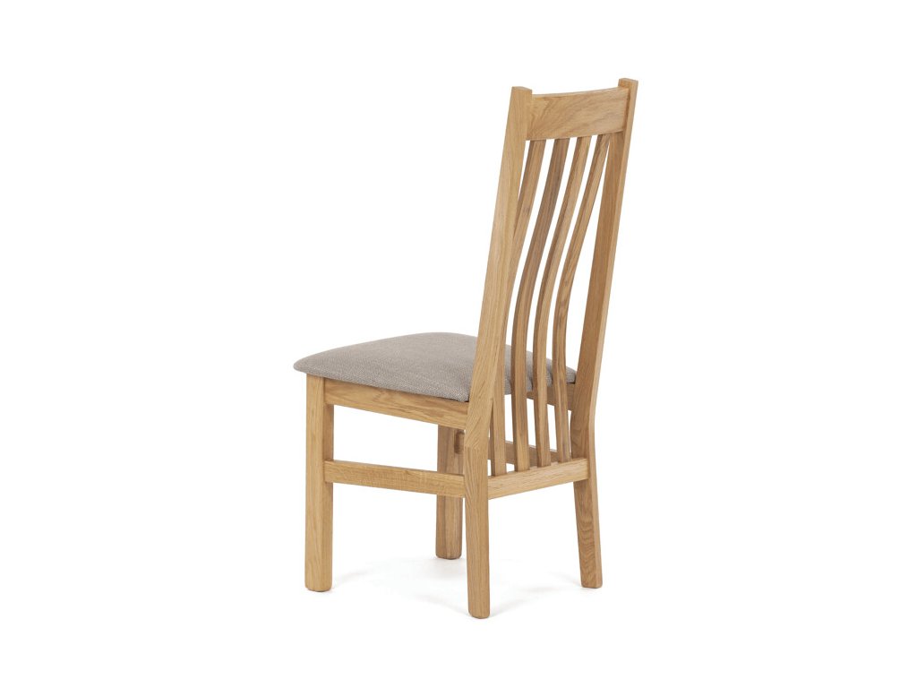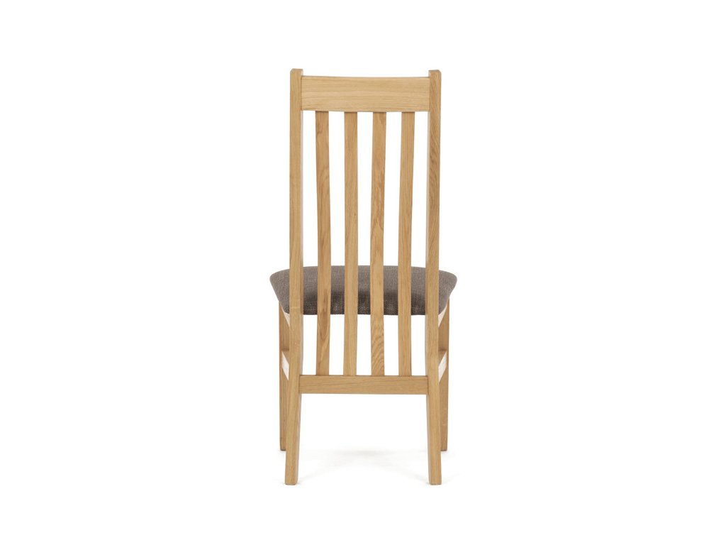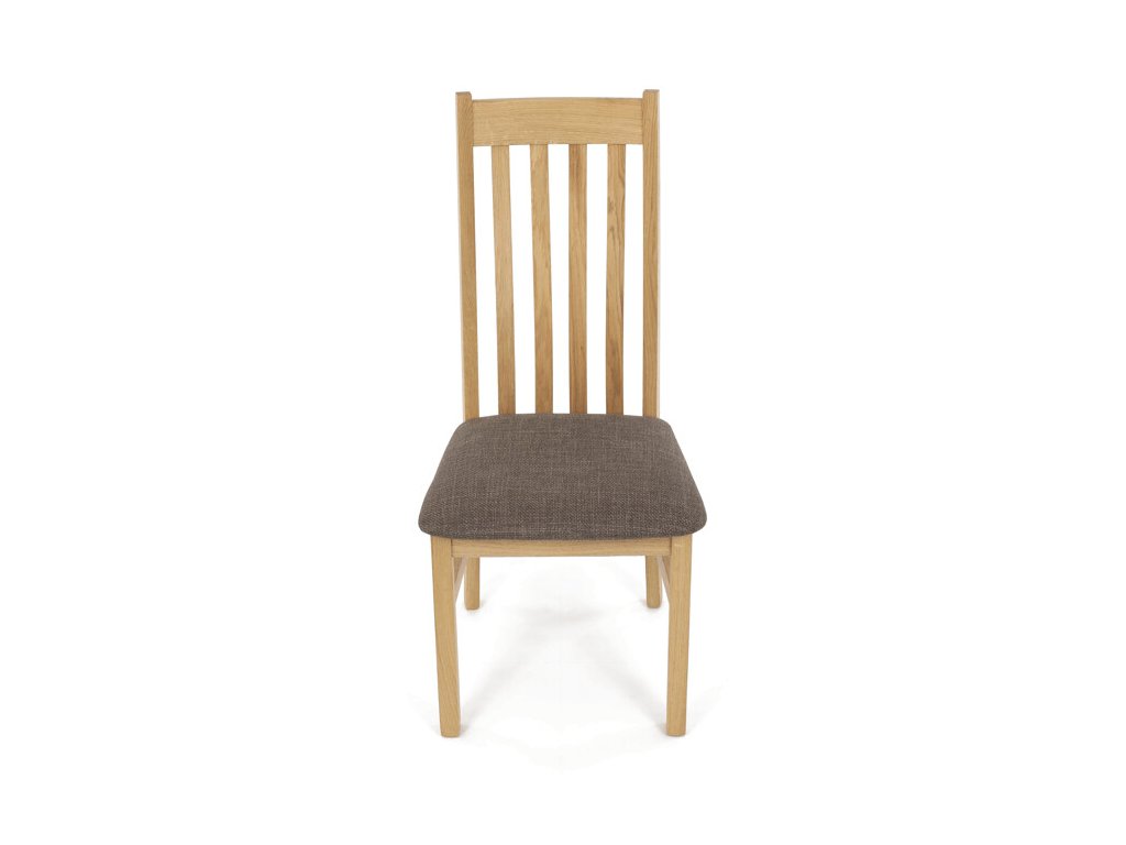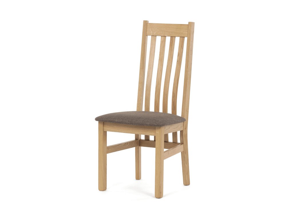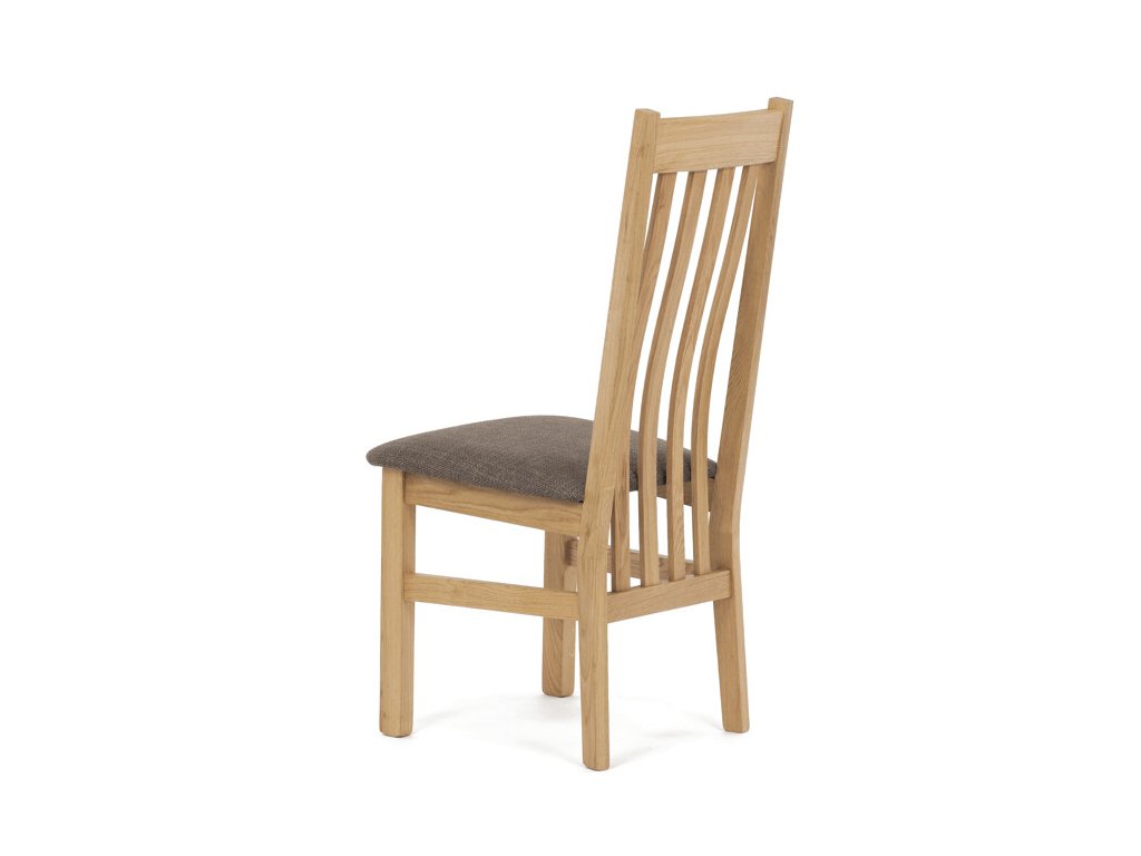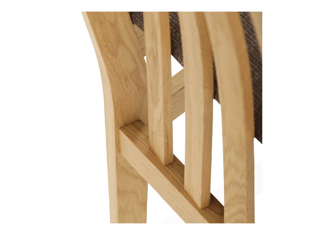 Jídelní židle z masivního dubu nabízí pevnou a stabilní konstrukci, která je navržena pro dlouhodobé používání. Vysoce ergonomicky tvarovaný opěrák svislých lamel poskytuje pohodlnou oporu zad a přispívá k lepšímu držení těla při sezení. Sedák je čalouněný hnědou látkou, která zajišťuje příjemný komfort a snadnou údržbu. Židle nemá područky ani otočný mechanismus, což ji činí vhodnou pro různé typy jídelních prostor. Přírodní odstíny dubového dřeva podtrhují tradiční i moderní styl interiéru.
