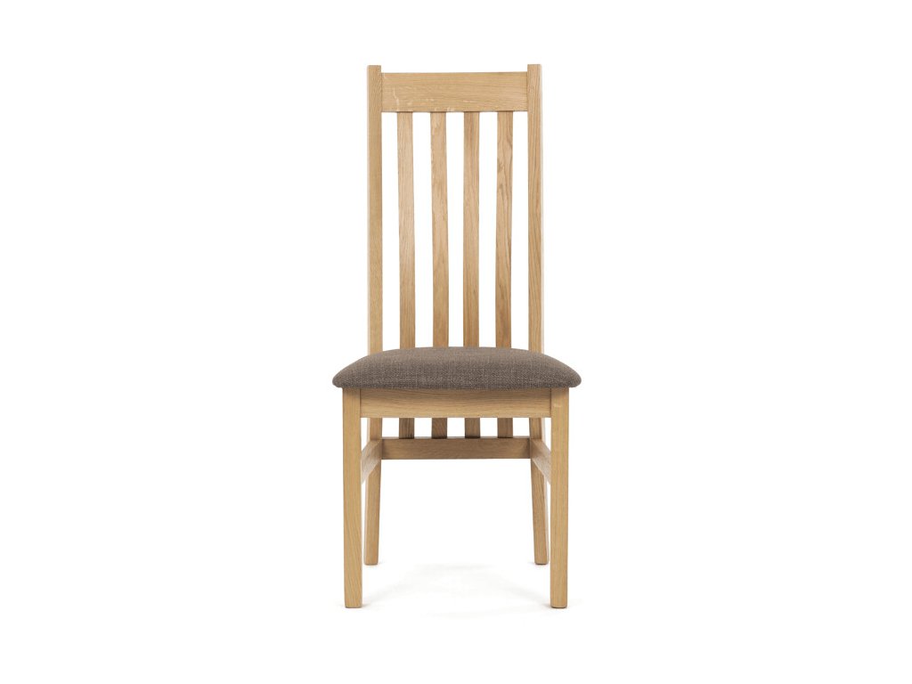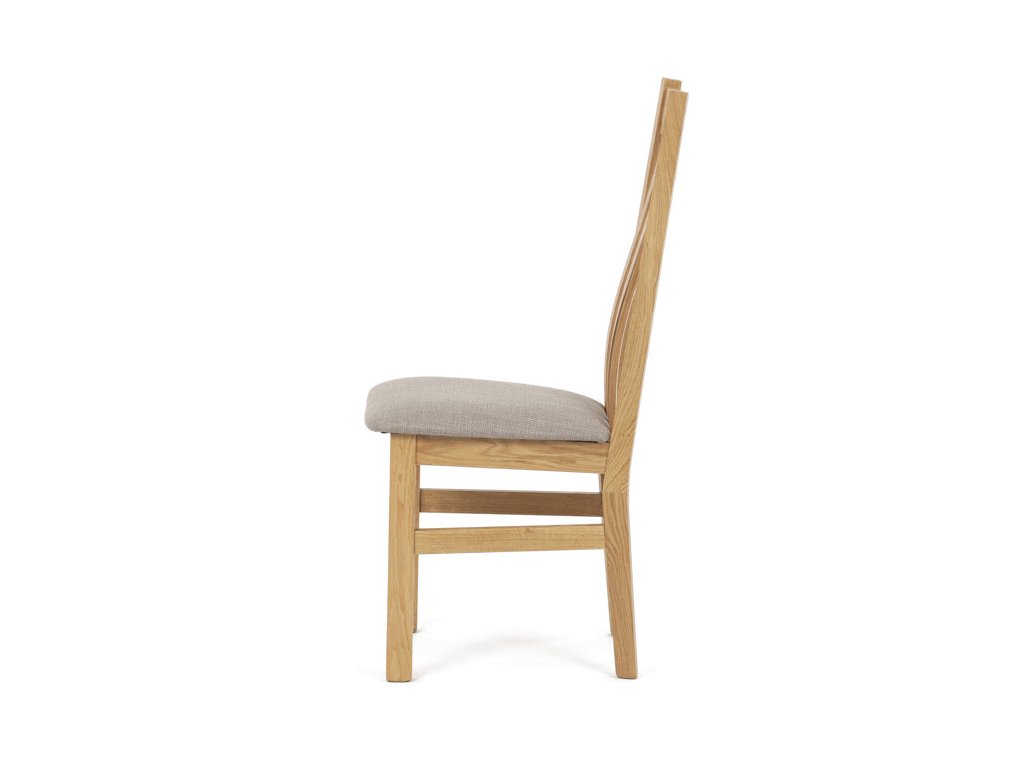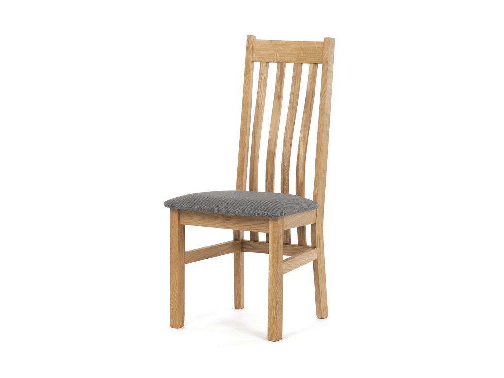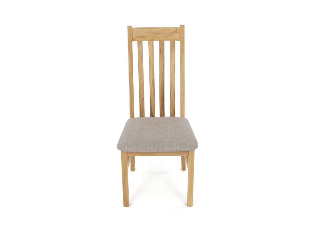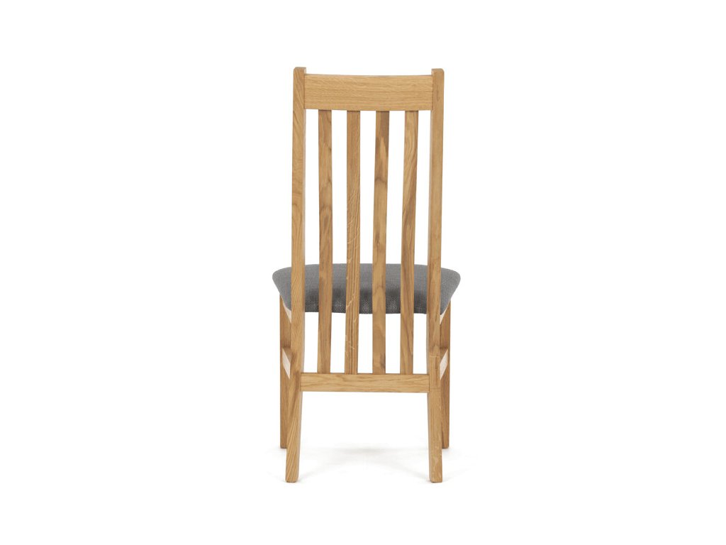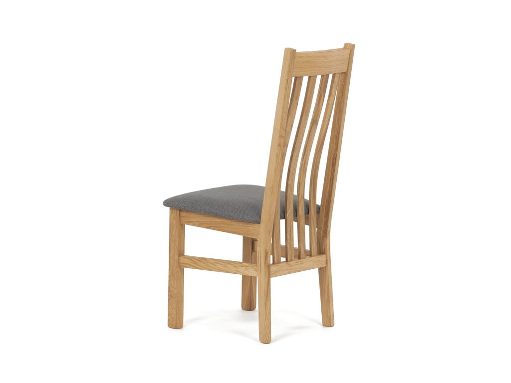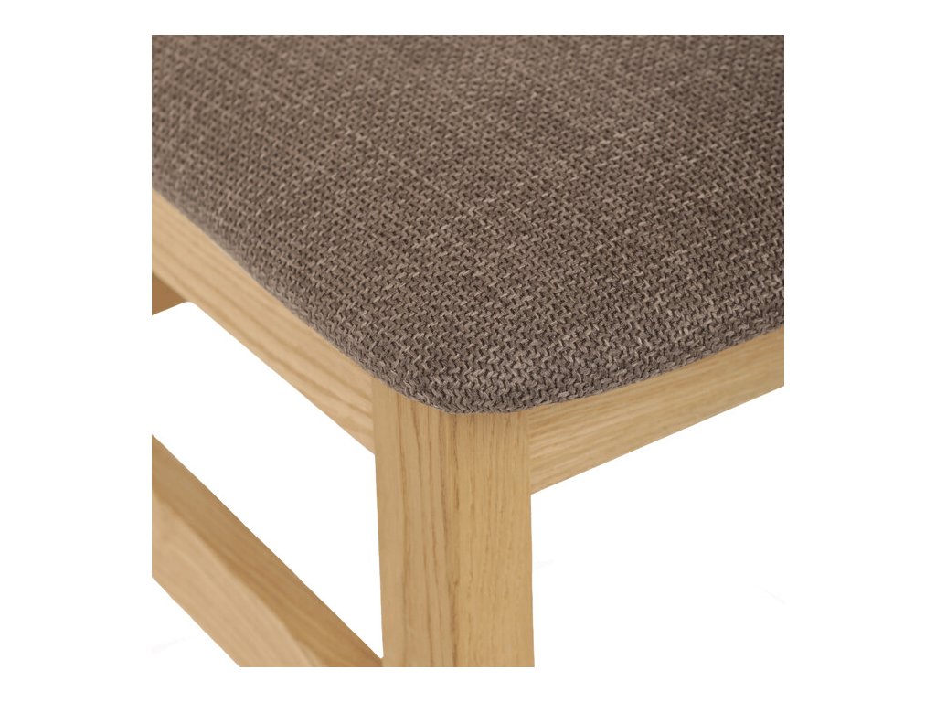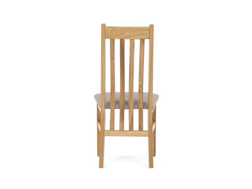 Jídelní židle z masivního dubu nabízí pevnou a stabilní konstrukci, která je navržena pro dlouhodobé používání. Vysoce ergonomicky tvarovaný opěrák svislých lamel poskytuje pohodlnou oporu zad a přispívá k lepšímu držení těla při sezení. Sedák je čalouněný hnědou látkou, která zajišťuje příjemný komfort a snadnou údržbu. Židle nemá područky ani otočný mechanismus, což ji činí vhodnou pro různé typy jídelních prostor. Přírodní odstíny dubového dřeva podtrhují tradiční i moderní styl interiéru.