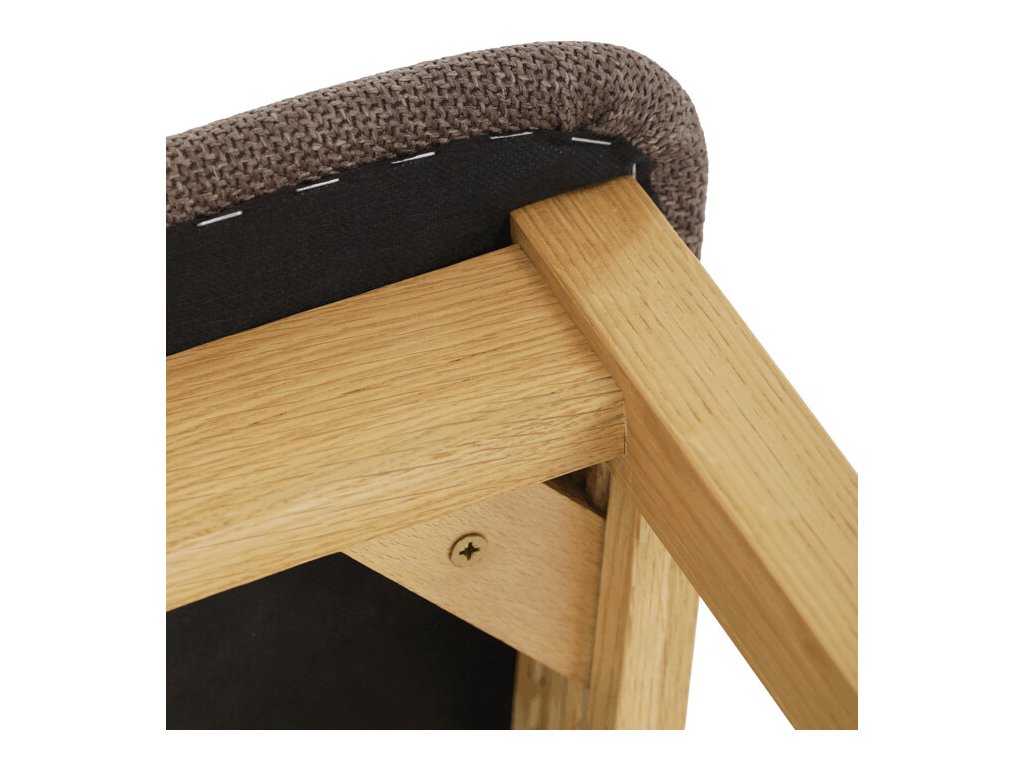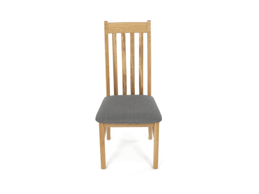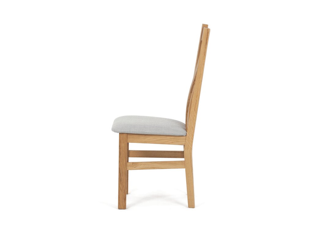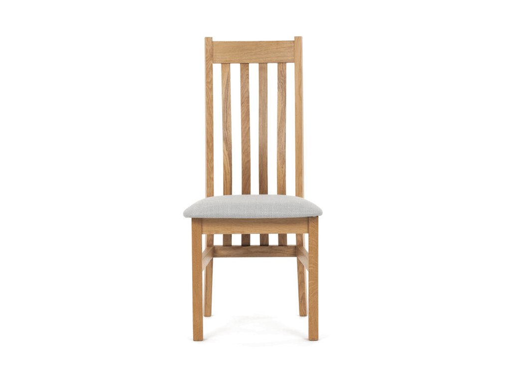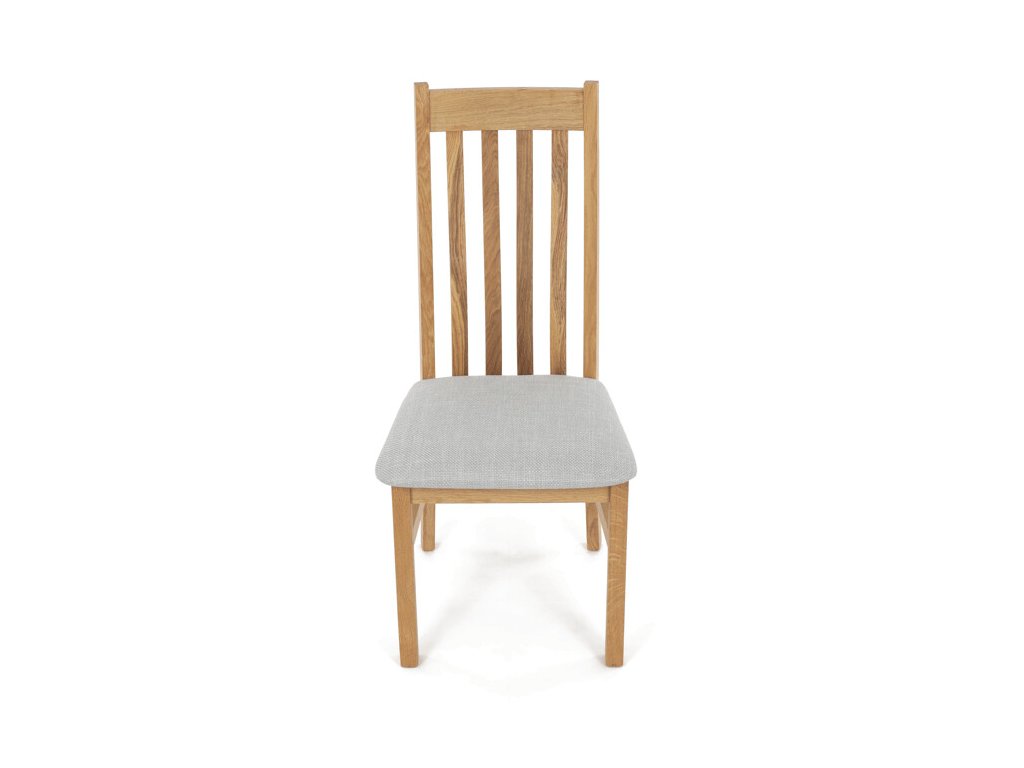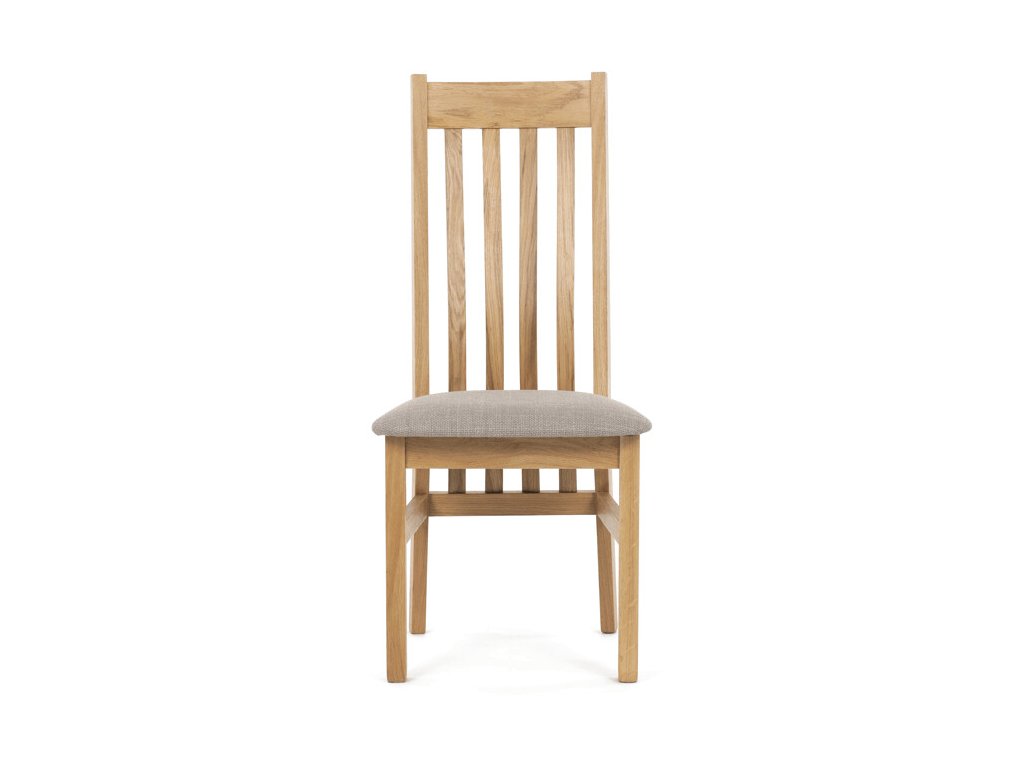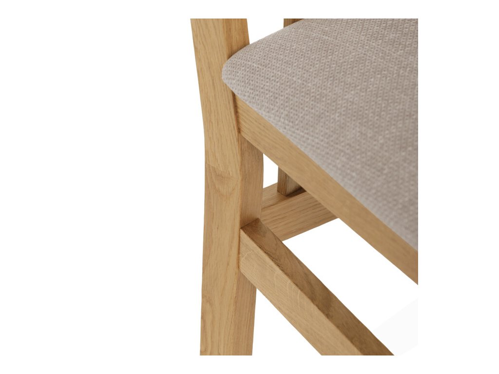 Jídelní židle z masivního dubu nabízí pevnou a stabilní konstrukci, která je navržena pro dlouhodobé používání. Vysoce ergonomicky tvarovaný opěrák svislých lamel poskytuje pohodlnou oporu zad a přispívá k lepšímu držení těla při sezení. Sedák je čalouněný hnědou látkou, která zajišťuje příjemný komfort a snadnou údržbu. Židle nemá područky ani otočný mechanismus, což ji činí vhodnou pro různé typy jídelních prostor. Přírodní odstíny dubového dřeva podtrhují tradiční i moderní styl interiéru.