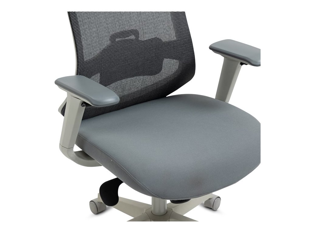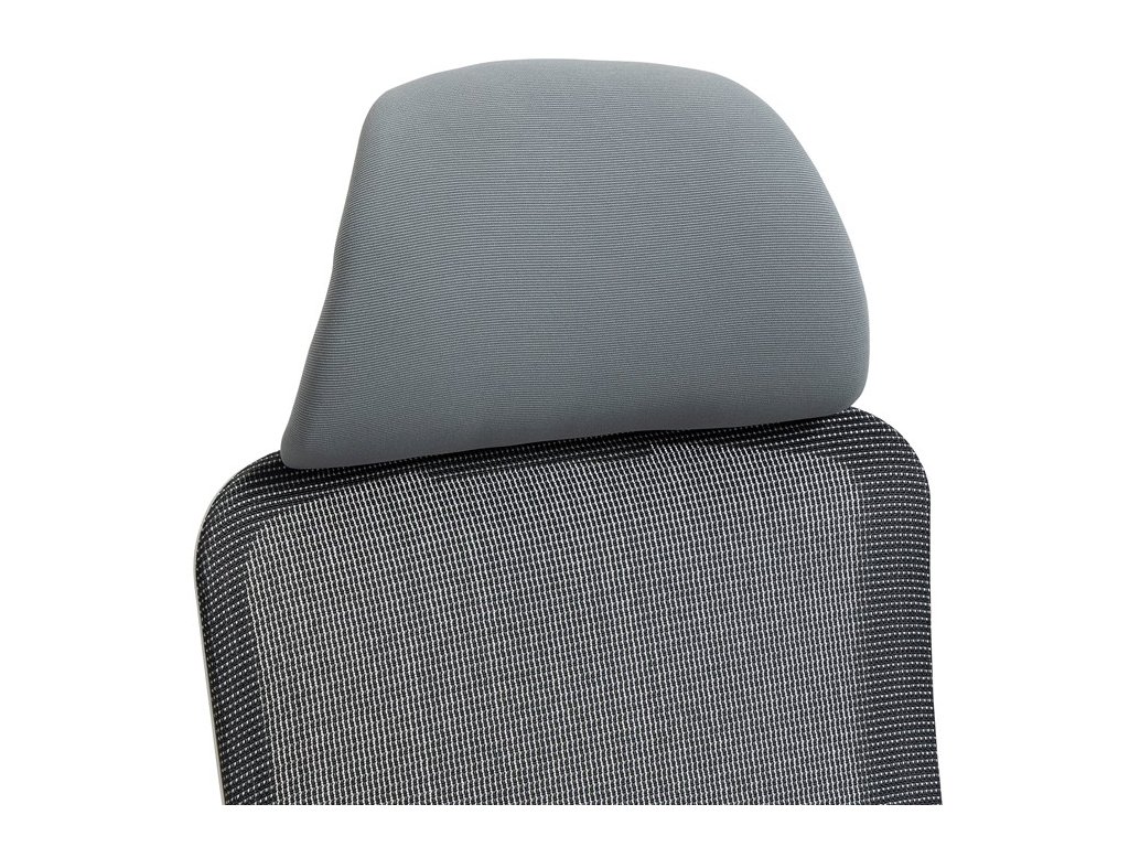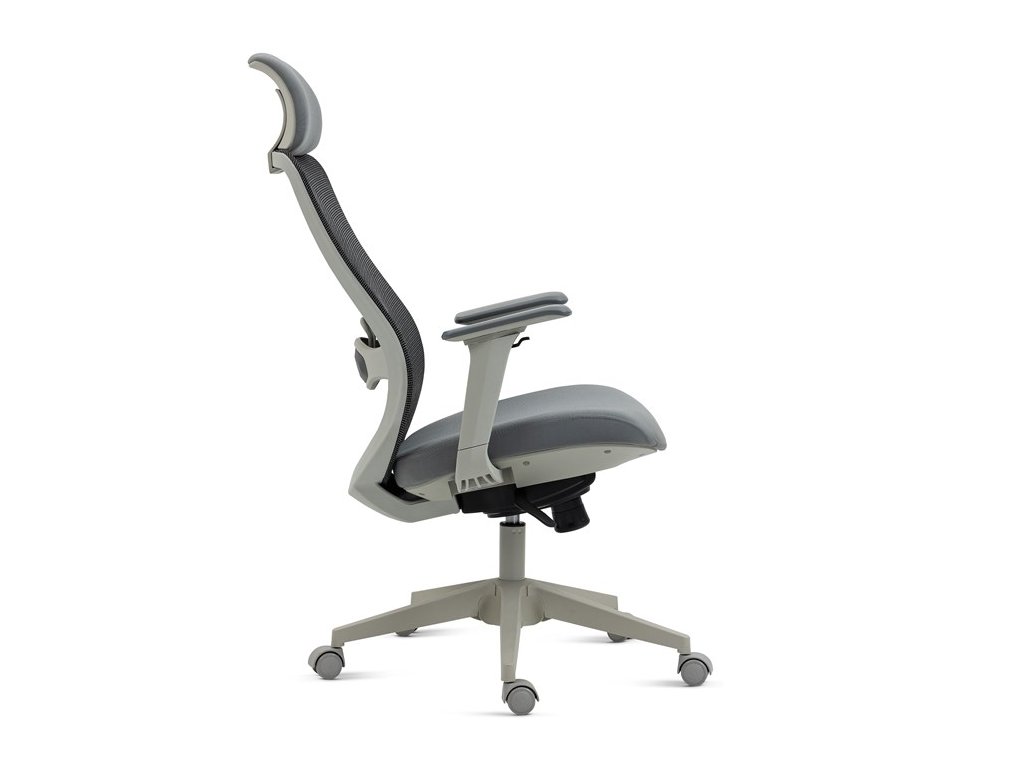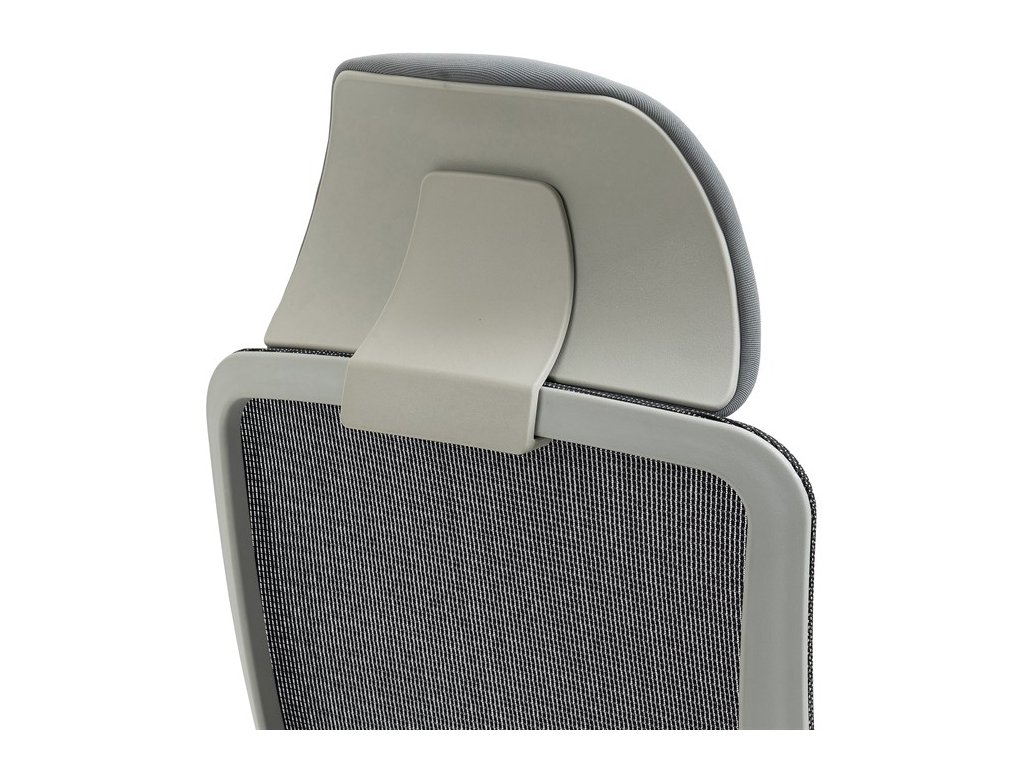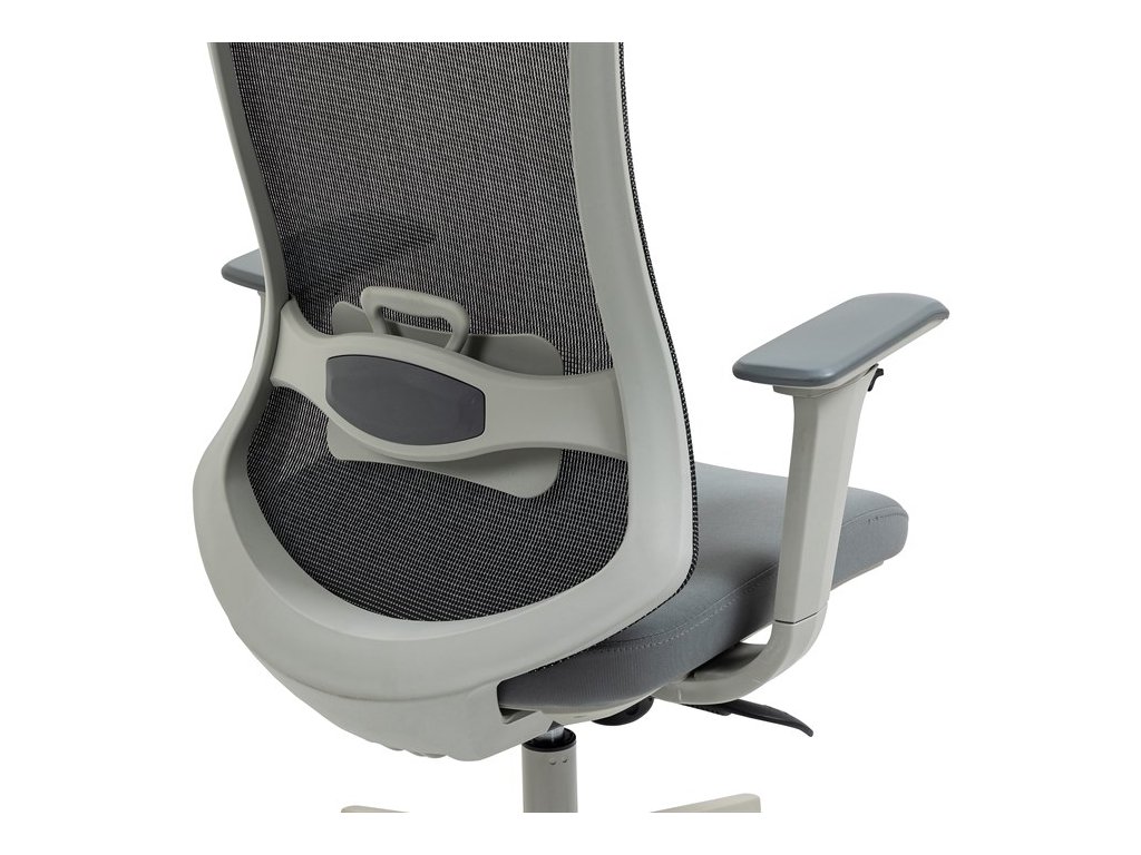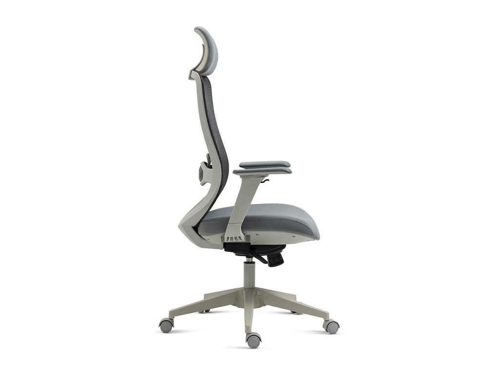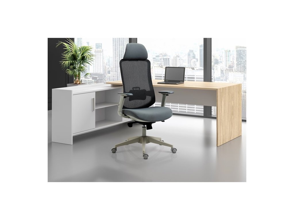 Kancelářská židle s vysokým opěrákem, čalouněným v prodyšném materiálu MESH, s nastavitelnou bederní opěrkou. Sedák je vyměkčený, s potahem v šedé látce. Pro větší pohodlí je židle opatřena synchronní mechanikou s polohovací aretací, podhlavníkem a 4D područkami z vrchní části z PU pěny. Kříž z odolného plastu je opatřen kolečky na tvrdé povrchy.
