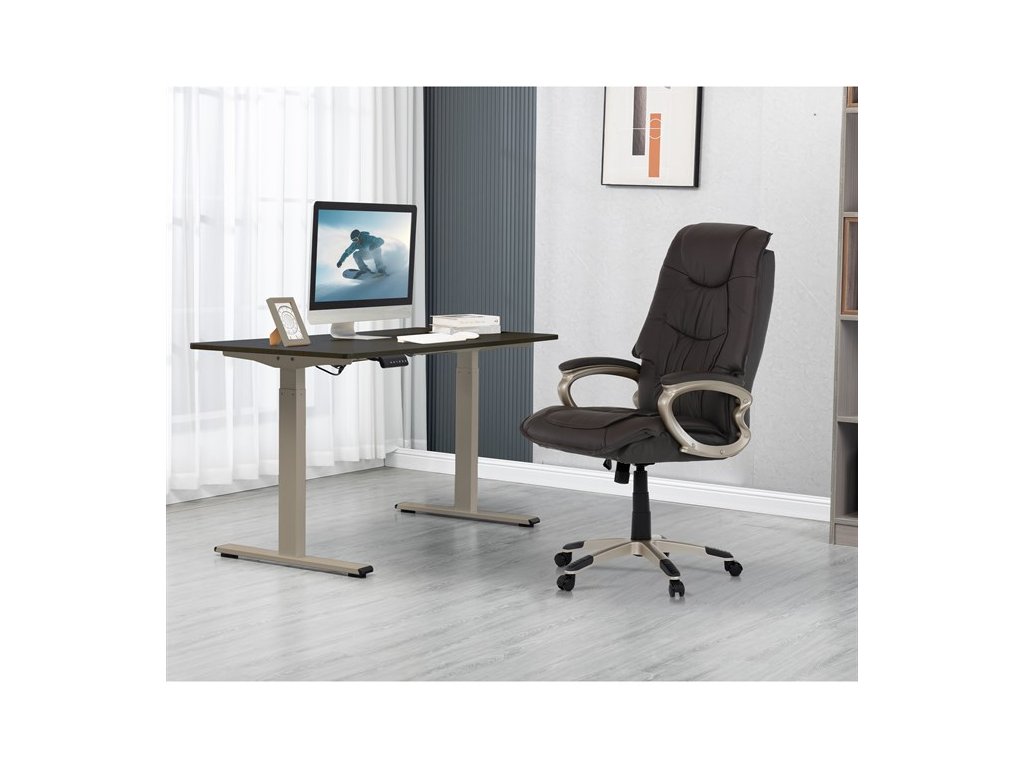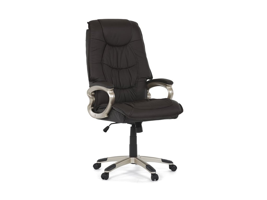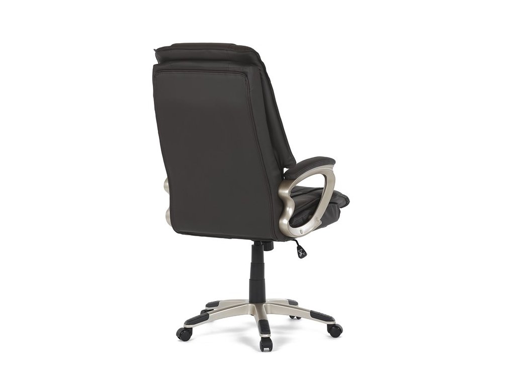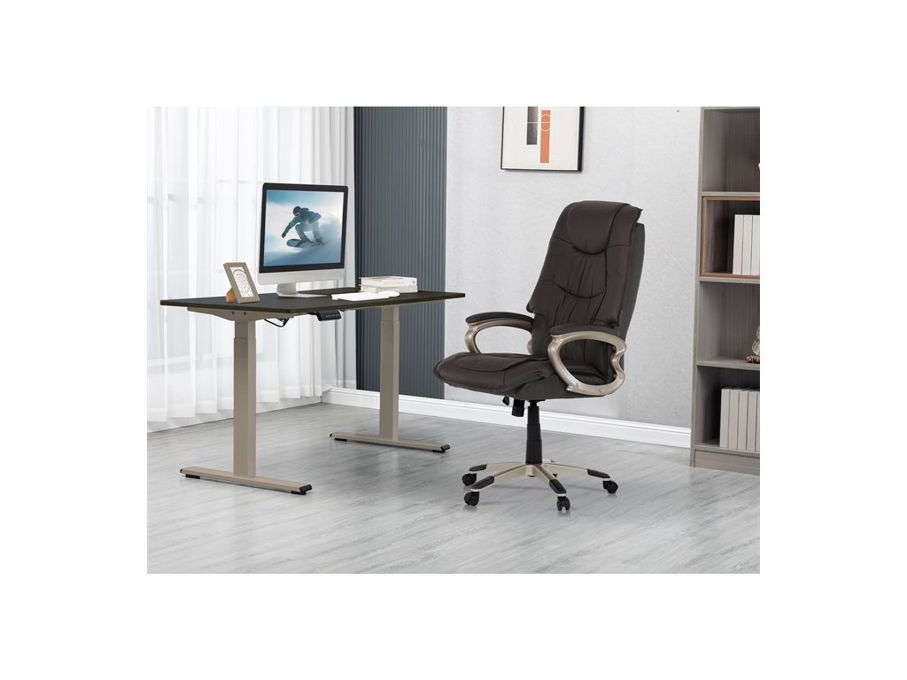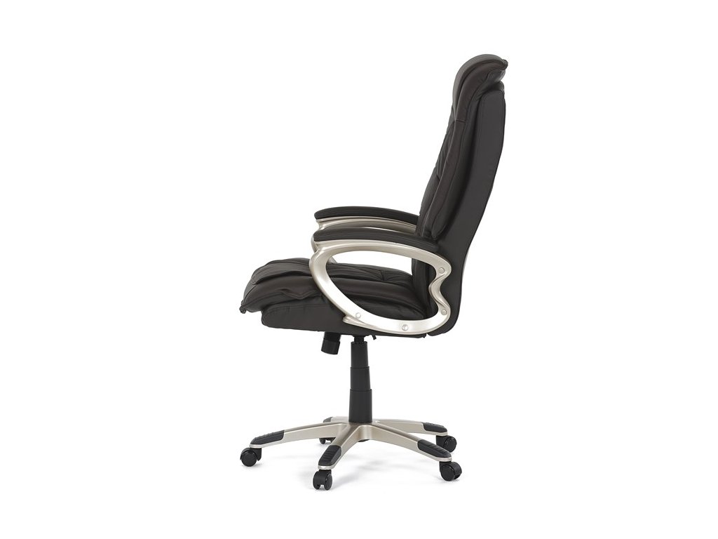 Kancelářská židle v tmavě hnědém koženém čalounění nabízí ergonomicky tvarovaný design s vysokým polstrováním sedáku i opěradla pro pohodlné sezení během dlouhých pracovních hodin. Pevné područky jsou čalouněné stejným materiálem a doplněné o plastové prvky v barvě champagne, které ladí s plastovým křížem židle. Houpací mechanismus umožňuje plynulé naklápění a nastavení výšky sedáku podle individuálních potřeb uživatele. Kolečka jsou určena pro tvrdé podlahy, což zajišťuje snadnou mobilitu bez poškození povrchu. Celkově je židle navržena s důrazem na komfort, stabilitu a kvalitní zpracování vhodné do kancelářského prostředí.