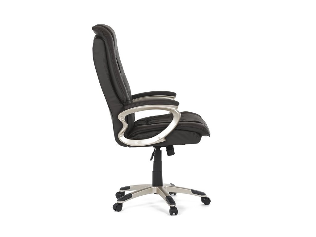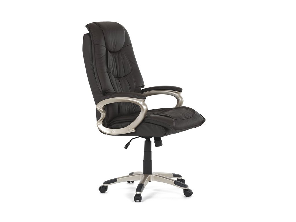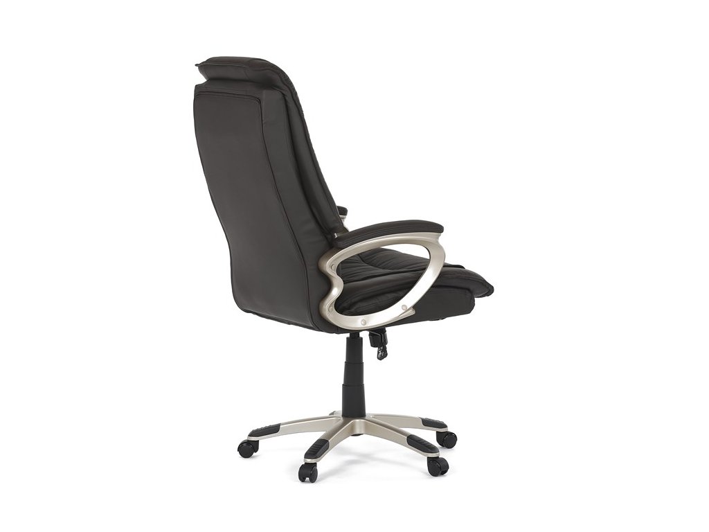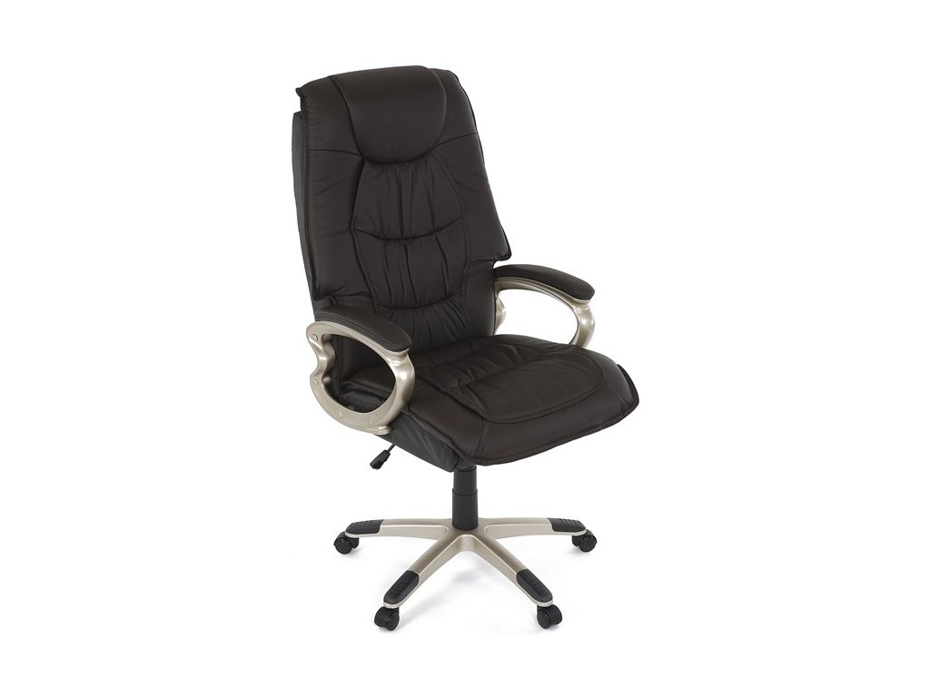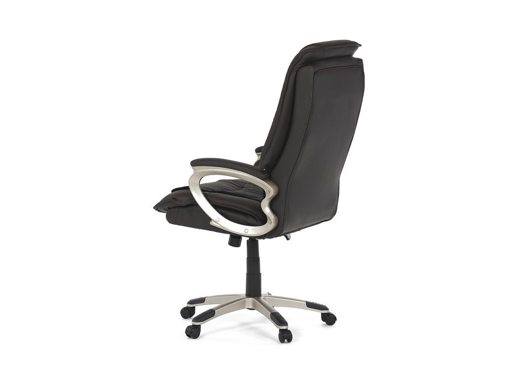 Kancelářská židle v tmavě hnědém koženém čalounění nabízí ergonomicky tvarovaný design s vysokým polstrováním sedáku i opěradla pro pohodlné sezení během dlouhých pracovních hodin. Pevné područky jsou čalouněné stejným materiálem a doplněné o plastové prvky v barvě champagne, které ladí s plastovým křížem židle. Houpací mechanismus umožňuje plynulé naklápění a nastavení výšky sedáku podle individuálních potřeb uživatele. Kolečka jsou určena pro tvrdé podlahy, což zajišťuje snadnou mobilitu bez poškození povrchu. Celkově je židle navržena s důrazem na komfort, stabilitu a kvalitní zpracování vhodné do kancelářského prostředí.