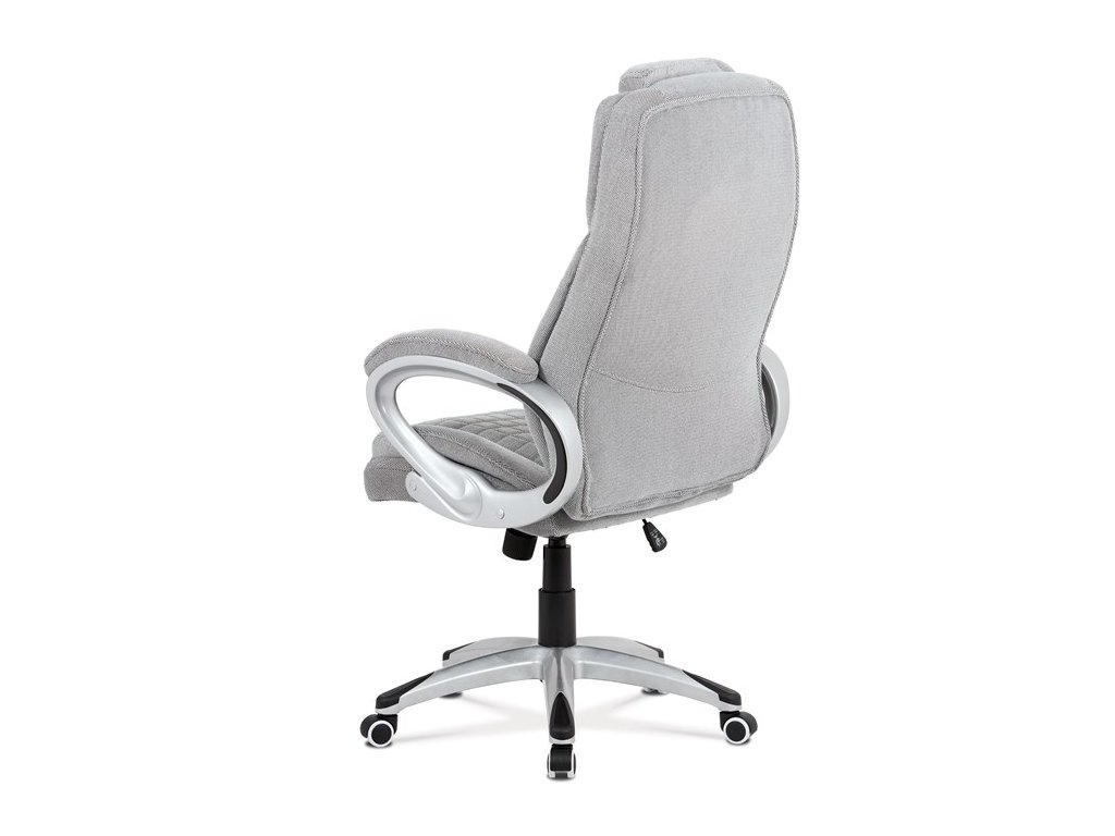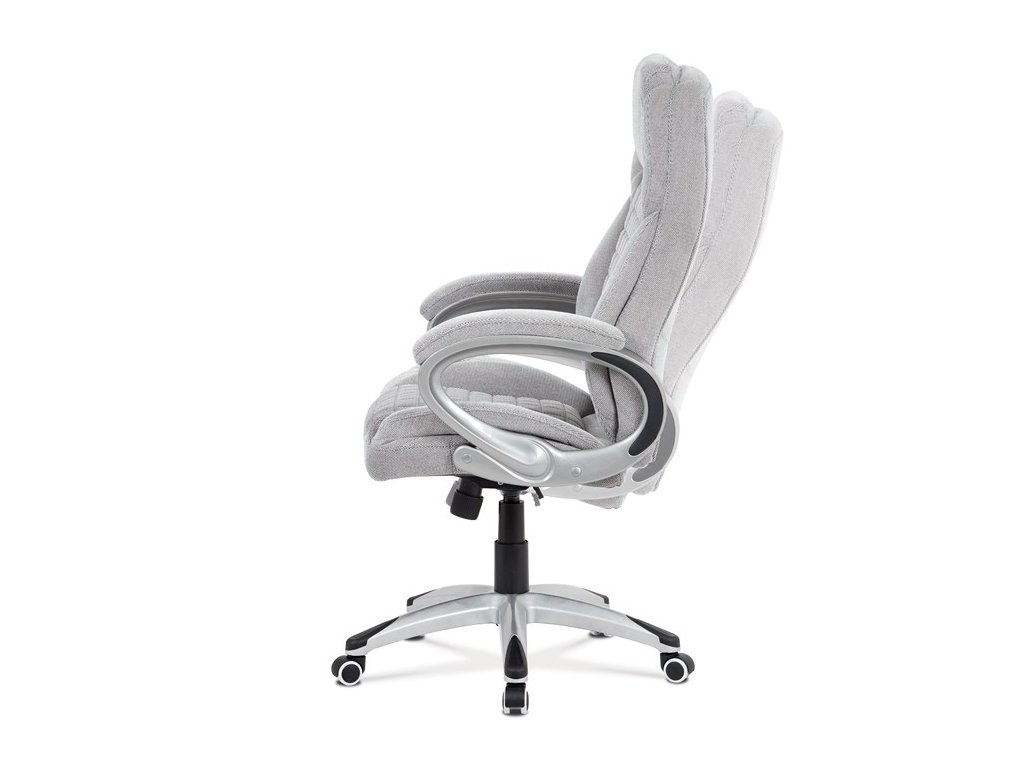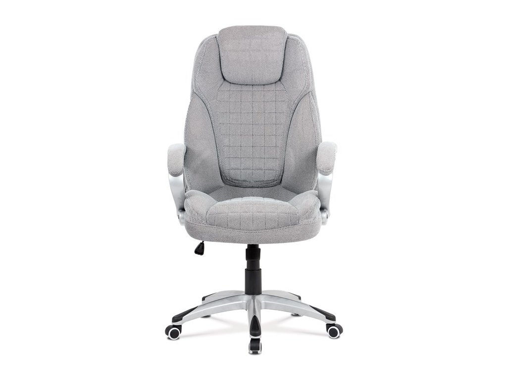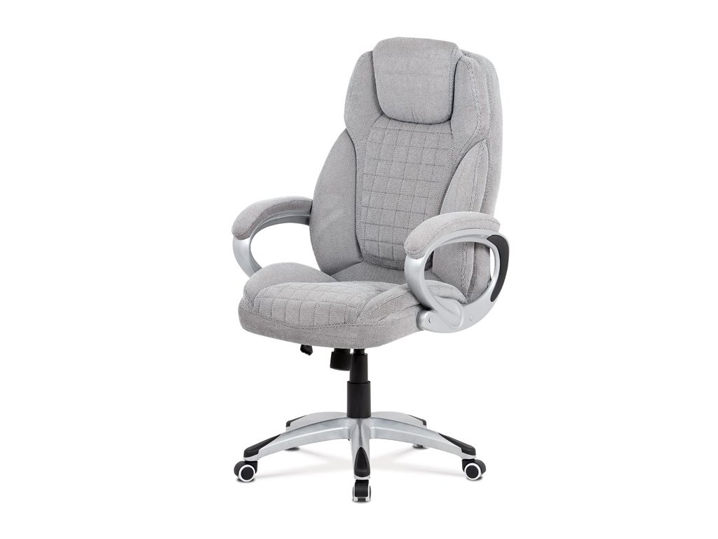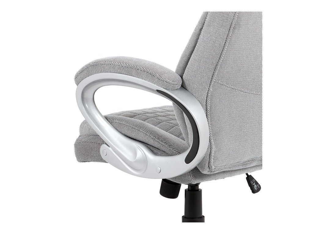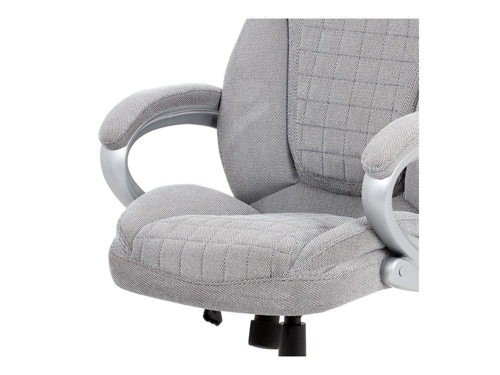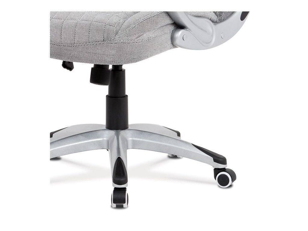 Moderní kancelářská židle potažená pololesklou šedou látkou vzor pepito. Díky ultra pohodlnému sedáku a opěráku s výjimečným polstrováním, které jsou stylově tvarované, s elegantním prošitím a se super měkkým podhlavníkem se budete cítit jako v business class nejlepší letecké společnosti. Ruce si můžete pohodlně opřít o pevné plastové područky šedé barvy s černými plastovými doplňky a polstrováním potaženým extra jemnou látkou. Židle má také i snadno omyvatelný, tvrzený, plastový kříž stříbrné barvy s černými protiskluzovými prvky a plastovými kolečky vhodnými na tvrdé typy podlah (dlažba, parkety, plovoucí podlahy apod.). Je výškově nastavitelná, s houpacím mechanismem a předním šroubem upravujícím tuhost pohupu a její nosnost je až 120 kg.