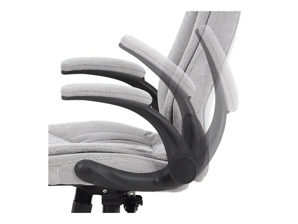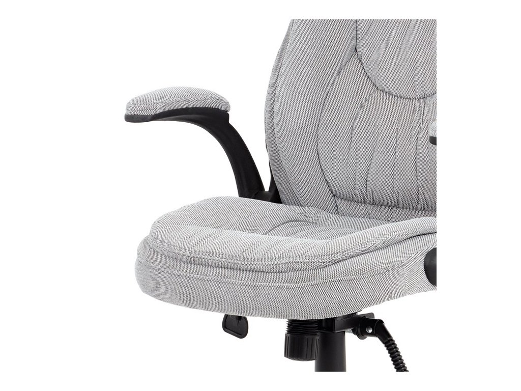 Kancelářská židle v šedé látce nabízí ergonomicky tvarované opěradlo s vyměkčenou vrchní částí pro zvýšený komfort při delším sezení. Odklápěcí čalouněné područky umožňují flexibilní využití a snadné zasunutí židle pod stůl. Synchronní mechanismus zajišťuje plynulé nastavení opěradla v závislosti na pohybu uživatele, což podporuje správné držení těla. Plastový černý kříž je lehký a zároveň stabilní, vybavený kolečky vhodnými pro různé typy podlah. Výškově nastavitelná sedací plocha umožňuje přizpůsobení individuálním potřebám uživatele.