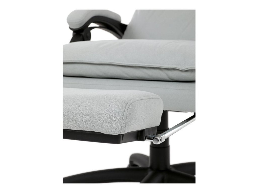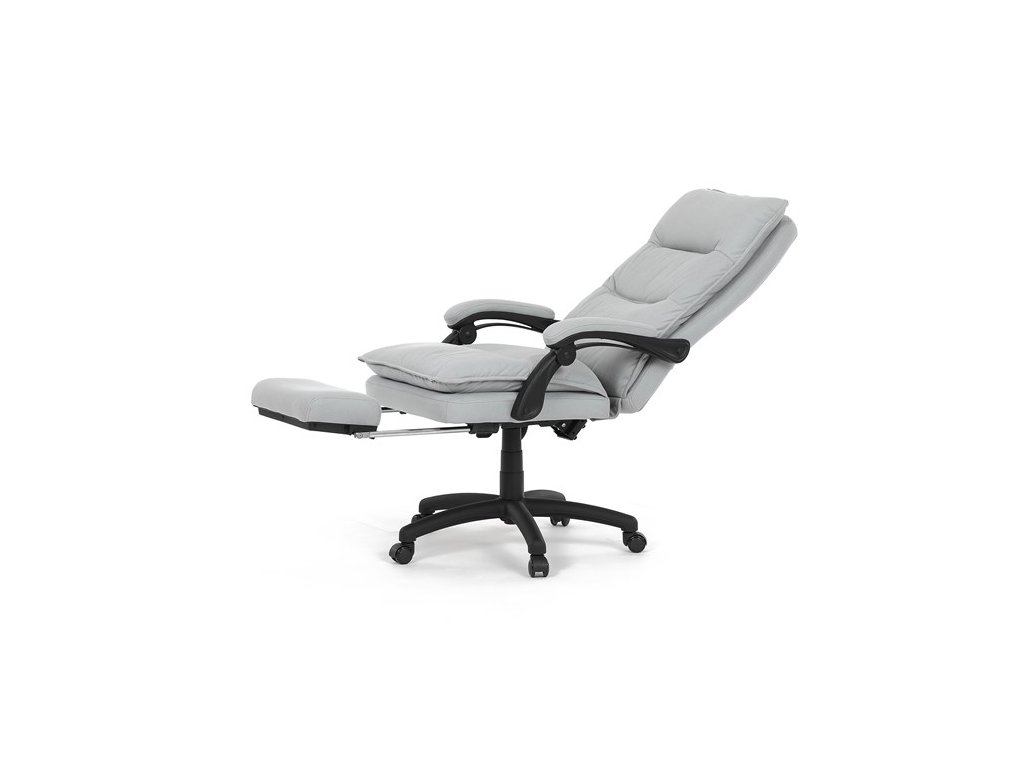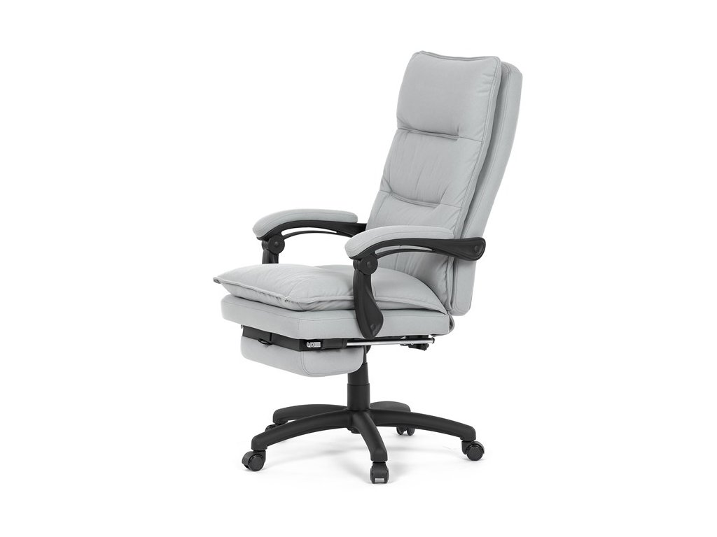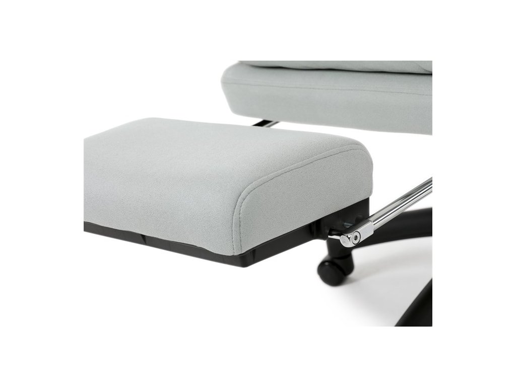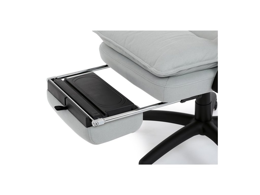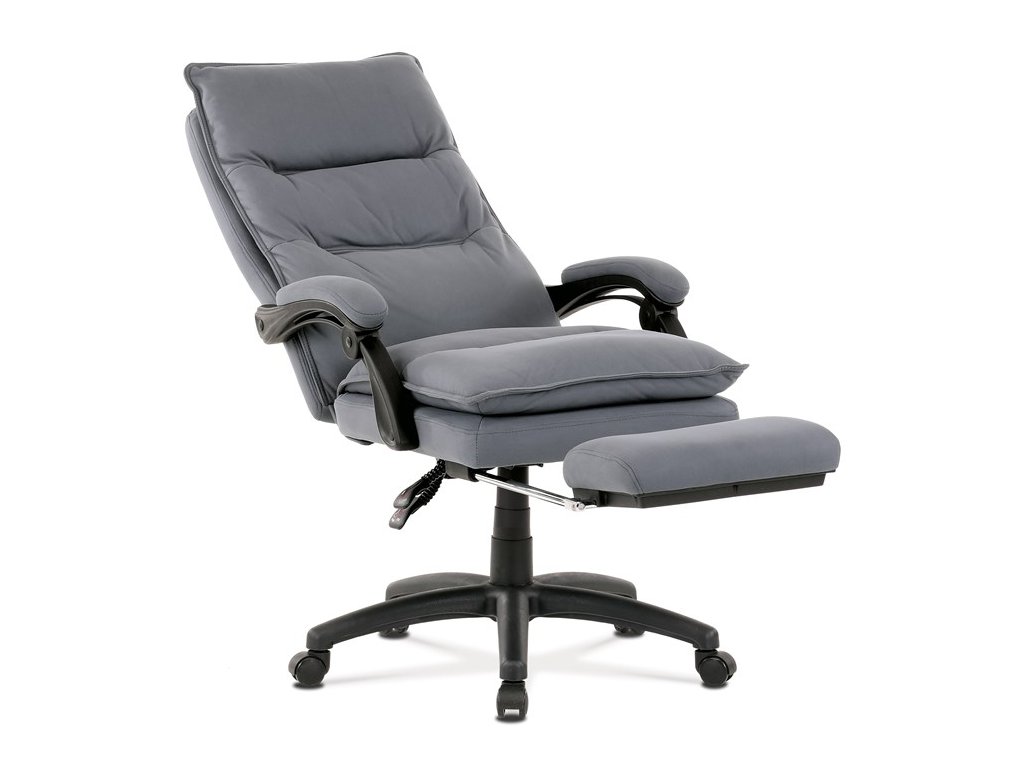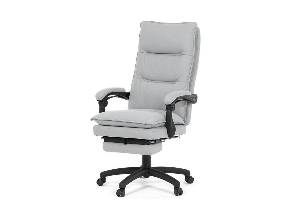 Luxusní kancelářské křeslo z kolekce TOP manager. Jedná se o moderní designové křeslo, navržené pro náročnou kancelářskou práci nebo jen relaxační lenošení. Jemný šedý odstín potahové látky doplní jakýkoli interiér, takže je univerzálním doplňkem do každé kanceláře. Výplň dvojitého sedáku i vysokého opěráku je z velmi kvalitní PU pěny. Křeslo je vybaveno houpacím mechanismem s plynulou aretací. Při vypnutí aretace je možné s opěradlem volně pohupovat. Područky jsou plastové, z vrchní části polstrované. Jedinečnost područek spočívá v synchronní mechanice, která upravuje jejich polohu při polohování opěráku. Vaše ruce budou mít při odpočinku dokonalou a velmi měkkou podporu. Jako TOP vybavení slouží výsuvná a výklopná polstrovaná podnožka. Nosnost židle je až 130 kg. Černá kostra područek a podnoží jí dodává nádech elegance a zajišťuje, že v každém prostředí vynikne jako výrazný kousek.
