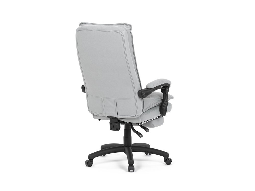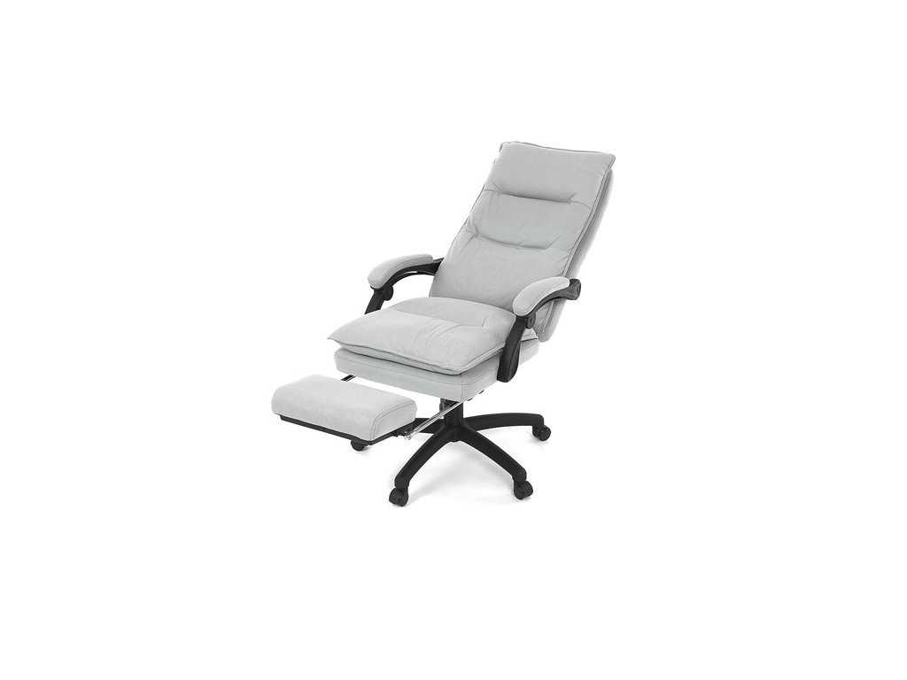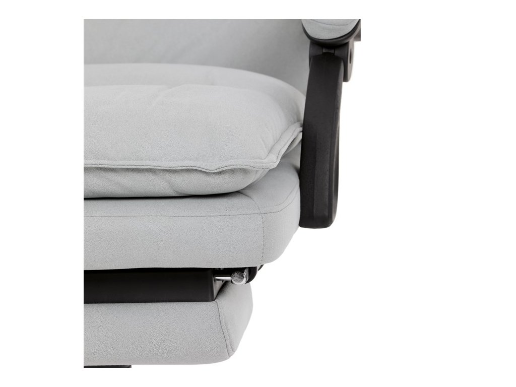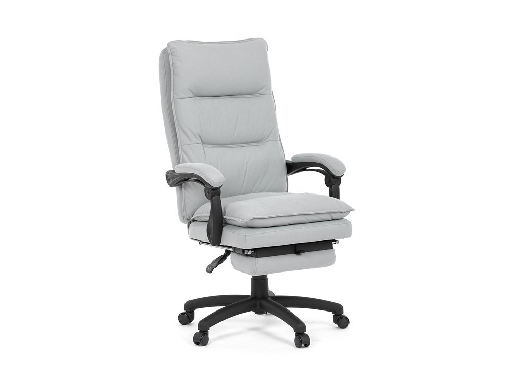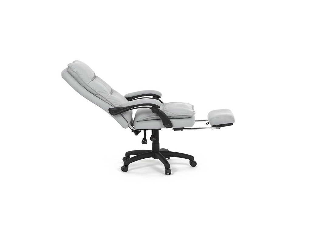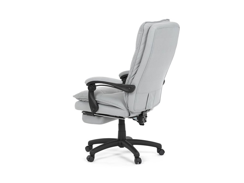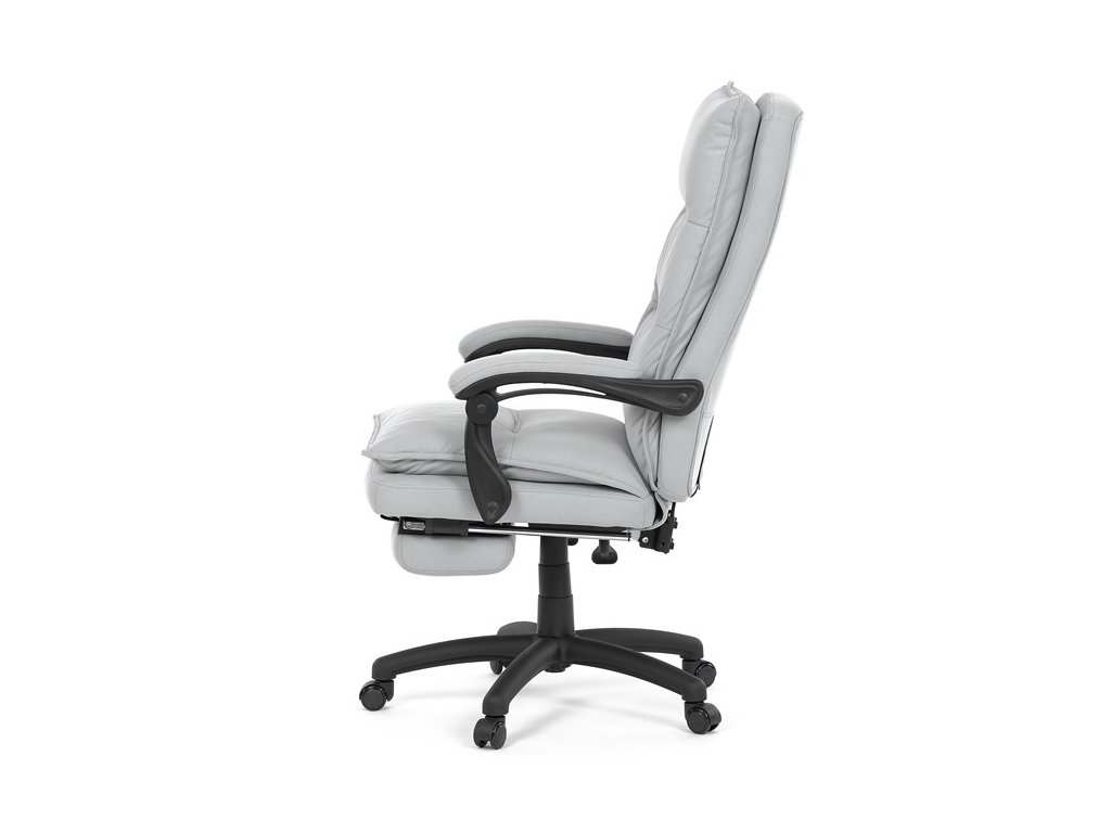 Luxusní kancelářské křeslo z kolekce TOP manager. Jedná se o moderní designové křeslo, navržené pro náročnou kancelářskou práci nebo jen relaxační lenošení. Jemný šedý odstín potahové látky doplní jakýkoli interiér, takže je univerzálním doplňkem do každé kanceláře. Výplň dvojitého sedáku i vysokého opěráku je z velmi kvalitní PU pěny. Křeslo je vybaveno houpacím mechanismem s plynulou aretací. Při vypnutí aretace je možné s opěradlem volně pohupovat. Područky jsou plastové, z vrchní části polstrované. Jedinečnost područek spočívá v synchronní mechanice, která upravuje jejich polohu při polohování opěráku. Vaše ruce budou mít při odpočinku dokonalou a velmi měkkou podporu. Jako TOP vybavení slouží výsuvná a výklopná polstrovaná podnožka. Nosnost židle je až 130 kg. Černá kostra područek a podnoží jí dodává nádech elegance a zajišťuje, že v každém prostředí vynikne jako výrazný kousek.