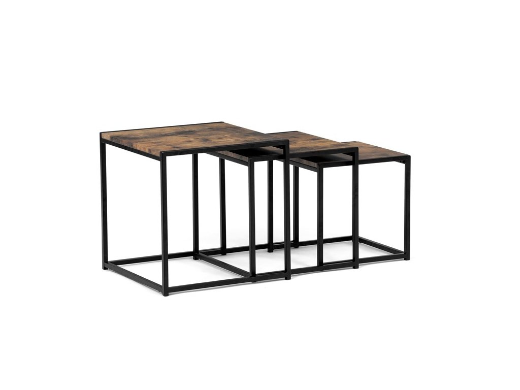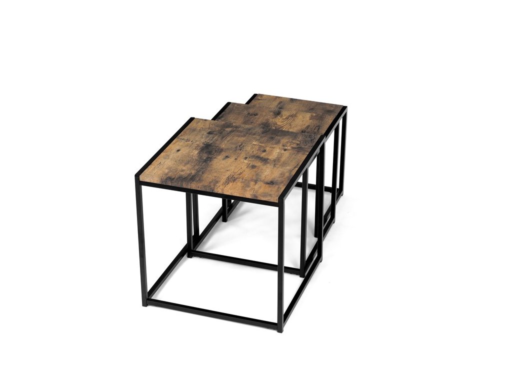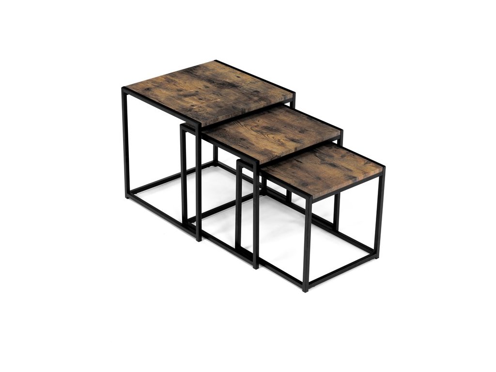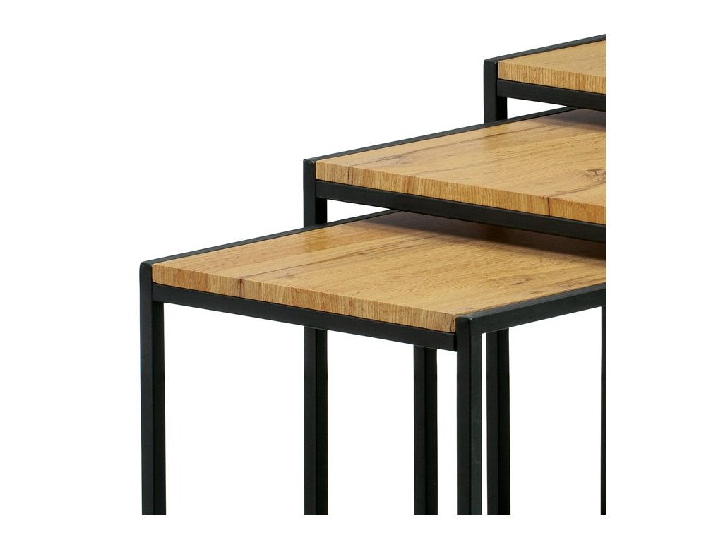 Set tří odkládacích stolků AF-3003 OAK kombinuje pevnou MDF desku s dekorativním povrchem v odstínu divokého dubu a stabilní kovovou podnož v černém laku. Stolky jsou navrženy tak, aby se daly elegantně zasunout jeden pod druhý, což šetří prostor a umožňuje variabilní využití v interiéru. Minimalistický design s tenkými kovovými rámy podtrhuje moderní industriální styl a přírodní dekor desek přináší do prostoru teplý a přirozený vzhled. Každý stolek je vhodný pro odkládání drobných předmětů, květin nebo jako doplněk k sedací soupravě. Rozměry jednotlivých stolů umožňují snadnou manipulaci a jejich kvalitní zpracování zaručuje dlouhou životnost.