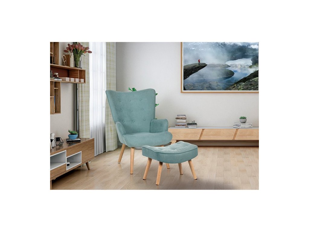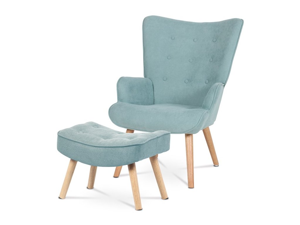 Křeslo ušák s podnožkou v světle modrém provedení nabízí pohodlné posezení s výrazným retro nádechem. Potah je z příjemné látky, která zajišťuje komfort a snadnou údržbu, zatímco pevné nohy z masivního kaučukovníku dodávají stabilitu a dlouhou životnost. Vyvýšené opěradlo s charakteristickými křídly a prošíváním s knoflíky poskytuje oporu pro záda i hlavu, což zvyšuje relaxační efekt. Součástí je také taburet se stejným potahem a konstrukcí, který umožňuje pohodlné opření nohou. Křeslo je vhodné do obývacích pokojů, čítáren nebo relaxačních koutů, kde vynikne jeho design i funkčnost.