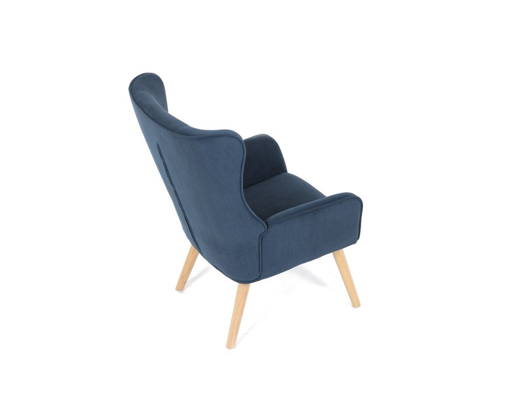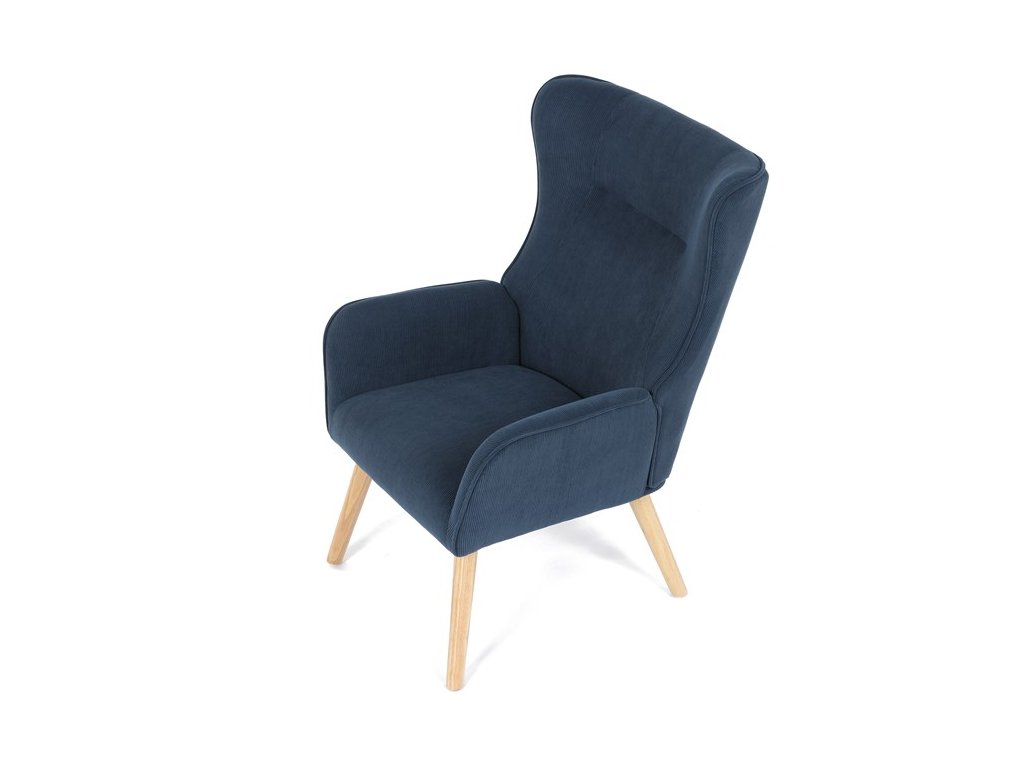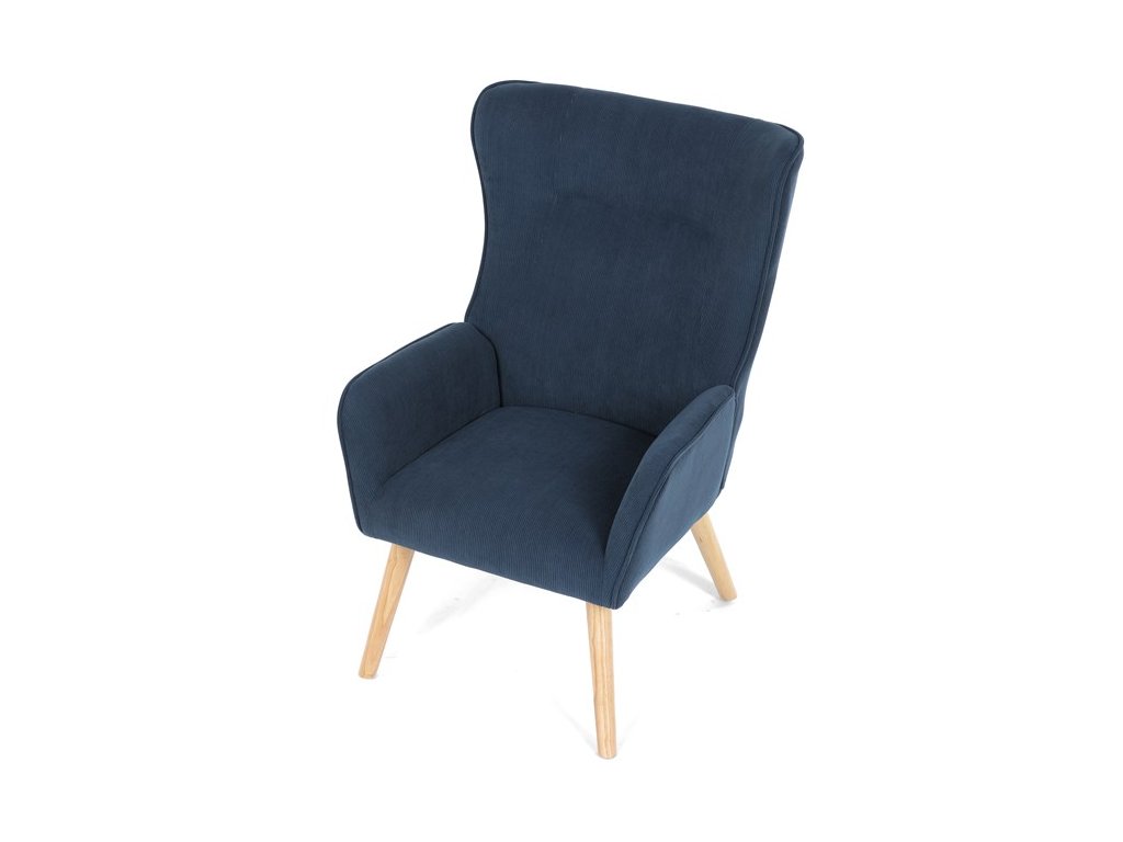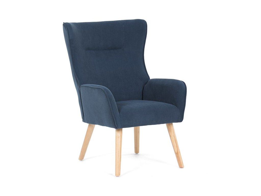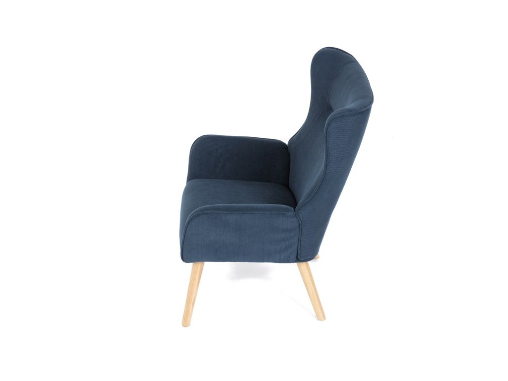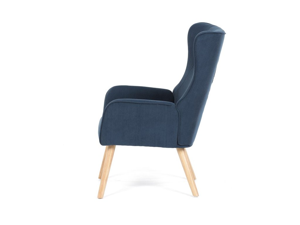 Křeslo typu ušák s potahem z modré manšestrové látky nabízí pohodlné sezení s výrazným vizuálním efektem díky jemné textuře manšestru. Sedák a opěradlo jsou vyplněné měkkou výplní, která zajišťuje komfort při delším posezení. Masivní nohy z kaučukovníku poskytují stabilní a pevnou oporu, přičemž jejich přírodní odstín kontrastuje s tmavě modrým potahem. Ergonomický tvar opěradla s mírně zvýšenými bočnicemi podporuje správnou polohu těla. Křeslo je určeno pro interiéry, kde vynikne jeho kombinace tradičního stylu a kvalitního materiálového provedení.