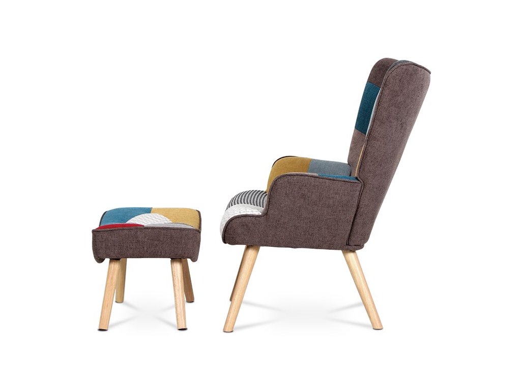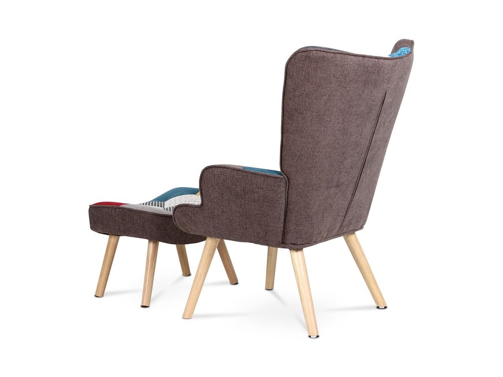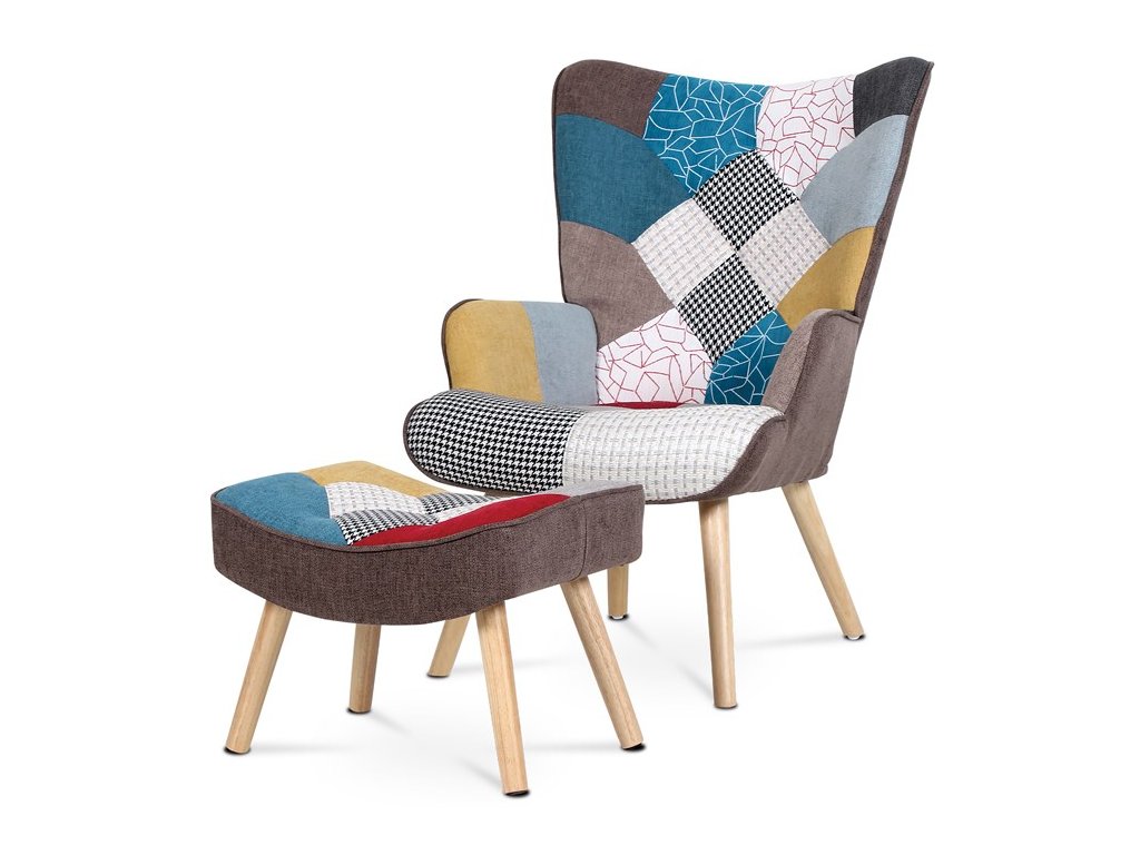 Křeslo ušák s podnožkou vyniká výrazným patchwork potahem z kvalitní látky, který kombinuje vícebarevné vzory a dodává interiéru osobitý charakter. Masivní nohy z kaučukovníku zajišťují stabilitu a dlouhou životnost, přičemž jejich přírodní odstín ladí s barevností čalounění. Ergonomicky tvarované opěradlo s vysokými bočními křídly poskytuje pohodlnou oporu pro záda i hlavu, což podporuje relaxaci. Součástí je také samostatný taburet s odpovídajícím designem, který umožňuje pohodlné podložení nohou. Křeslo je určeno pro použití v obývacích pokojích či relaxačních zónách, kde oceníte kombinaci komfortu a stylového provedení.