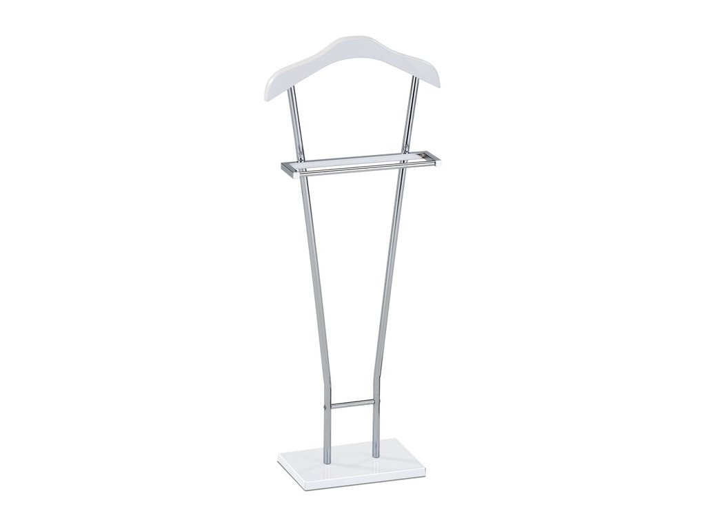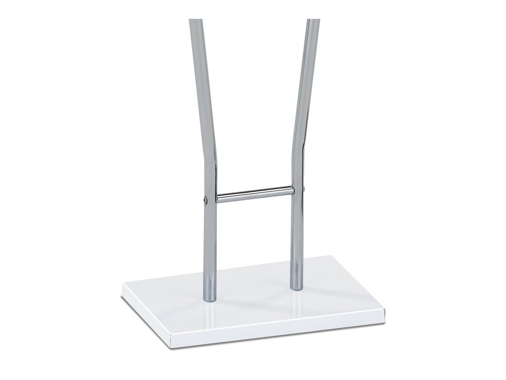 Praktický němý sluha v moderním designu. Konstrukce je kombinací kovových trubek s kovovou podestou a masivního ramene. Povrchová úprava je v bílém matném laku a chromu. Výška 110 cm Vám umožní zavěšení oblečení i doplňků bez pomačkání. Nosnost stojanu je až 6 kg, hmotnost necelé 4 kg. Proto je jednoduše přenositelný a lze ho umístit podle momentální potřeby i nálady. Stylem a jednoduchostí se hodí do jakéhokoli interiéru. Využití je nepřeberné, záleží jen na Vás.