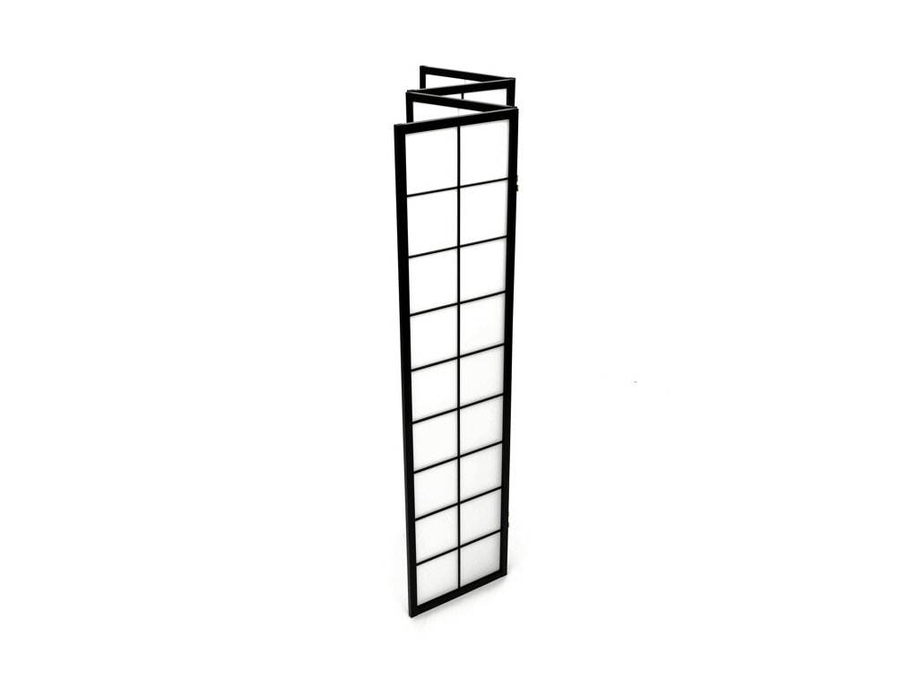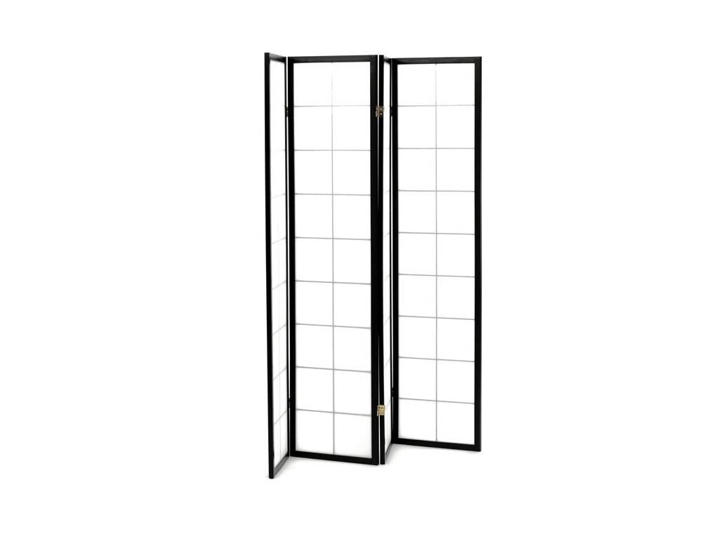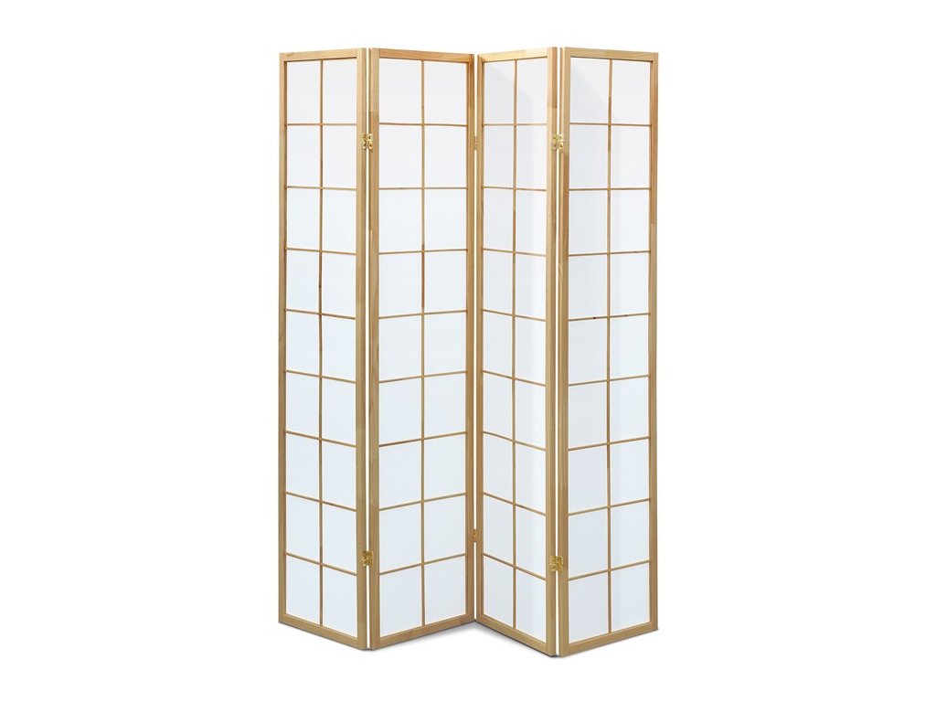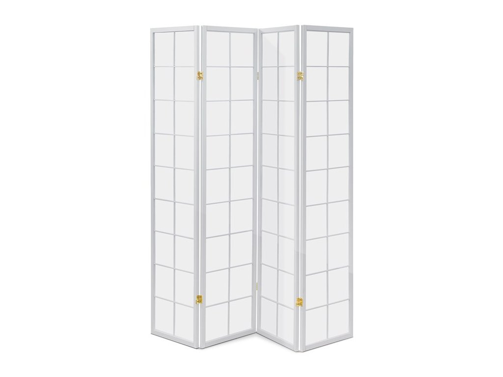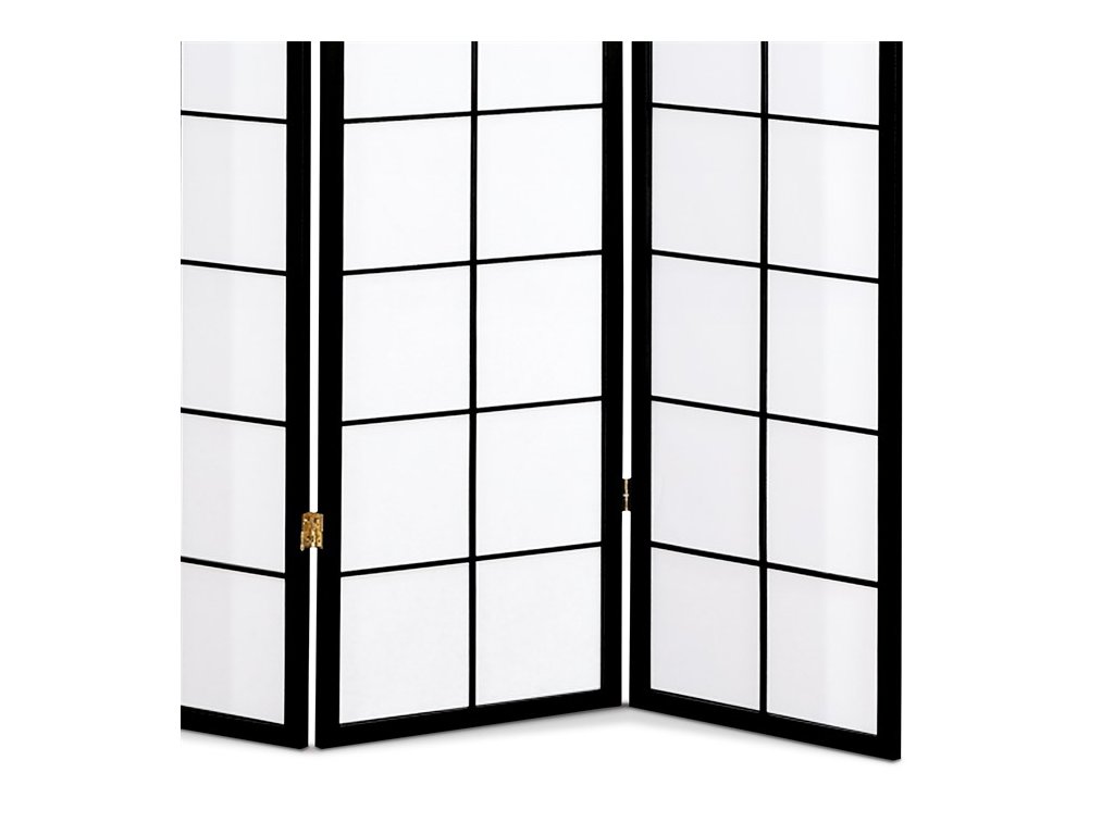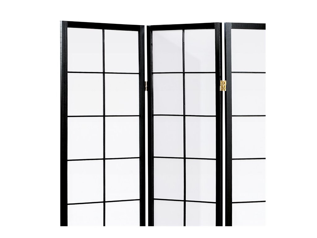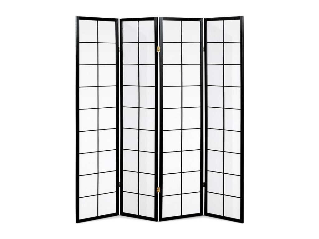 4dílný volně stojící paraván s konstrukcí z masivního smrkového dřeva v černé barvě a výplní z bílé netkané textilie. Plní nejen funkci okrasnou, ale také praktickou. Lze jej použít jako zástěnu nebo diskrétní i optickou dělící příčku nejen v bytě, ale i v komerčních prostorách. Díky skládací konstrukci a celkové nízké hmotnosti jej lze bez problémů přemísťovat a manipulovat s ním. Kombinace dřeva a netkané textilie působí vzdušným dojmem, stylově lze paraván umístit do jakkoli zařízeného interiéru. V každém si najde zasloužené místo. Výška paravánu je 178 cm, šíře jednoho dílu 43,5 cm, celková plná šíře je 176 cm. Tloušťka stěny jsou 2 cm. Stěny paravánu jsou k sobě připevněny kovovými pomosazenými panty. Celková hmotnost je 6,5 kg.