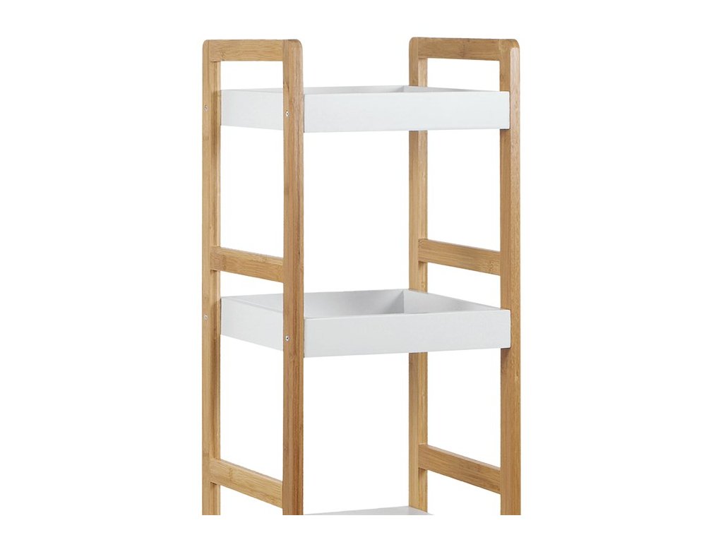Regál s třemi policemi kombinuje pevnost masivního bambusu s bílým matným lakem MDF desek, což vytváří stabilní a zároveň esteticky příjemný kus nábytku. Bambusové bočnice v přírodním odstínu dodávají regálu přirozený vzhled a zajišťují pevnou oporu pro jednotlivé police. Dvě horní police jsou opatřeny zvýšenými okraji, které zabraňují sklouznutí uložených předmětů, zatímco spodní police je plochá a nabízí další úložný prostor. Díky nosnosti 9 kg na polici je regál vhodný pro lehčí dekorace, knihy či drobné předměty v interiéru. Kompaktní rozměry a jednoduchý design umožňují snadné umístění do různých prostorů, kde oceníte kombinaci funkčnosti a přírodního stylu.