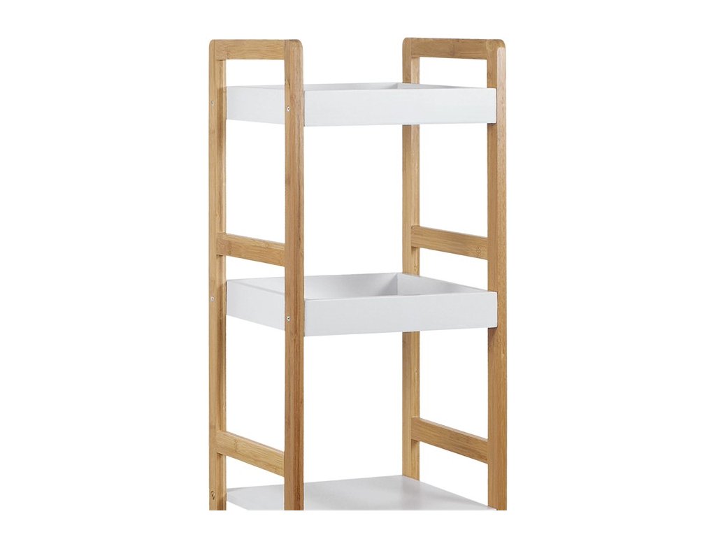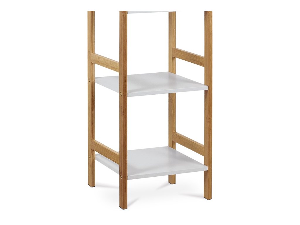 Regál s čtyřmi policemi kombinuje pevný rám z masivního bambusu v přírodním odstínu s policemi z MDF desek opatřených bílým matným lakem. Tento materiálový mix zajišťuje stabilitu a zároveň moderní vzhled vhodný do různých interiérů. Police jsou navrženy tak, aby unesly zatížení až 12 kg, což umožňuje bezpečné uložení dekorací, knih nebo drobných předmětů. Otevřená konstrukce regálu podporuje snadný přístup a přehlednost uložených věcí. Kompaktní rozměry a decentní barevné provedení umožňují univerzální využití v domácnostech i kancelářích.