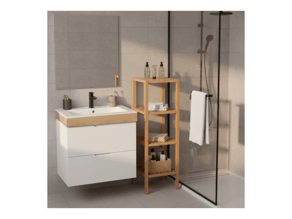 Regál z masivního bambusu nabízí čtyři prostorné police v přírodním odstínu, které jsou ideální pro organizaci a vystavení různých předmětů. Pevný rám a police z bambusového dřeva jsou navrženy pro dlouhou životnost a snadnou údržbu, přičemž přírodní textura materiálu dodává nábytku přirozený vzhled. Otevřená konstrukce umožňuje dobré větrání uložených věcí a zároveň usnadňuje přístup. Nosnost každé police je 12 kg, což zajišťuje stabilitu i při umístění těžších předmětů. Kompaktní rozměry regálu umožňují jeho využití v různých typech interiérů, od koupelen po obývací pokoje.