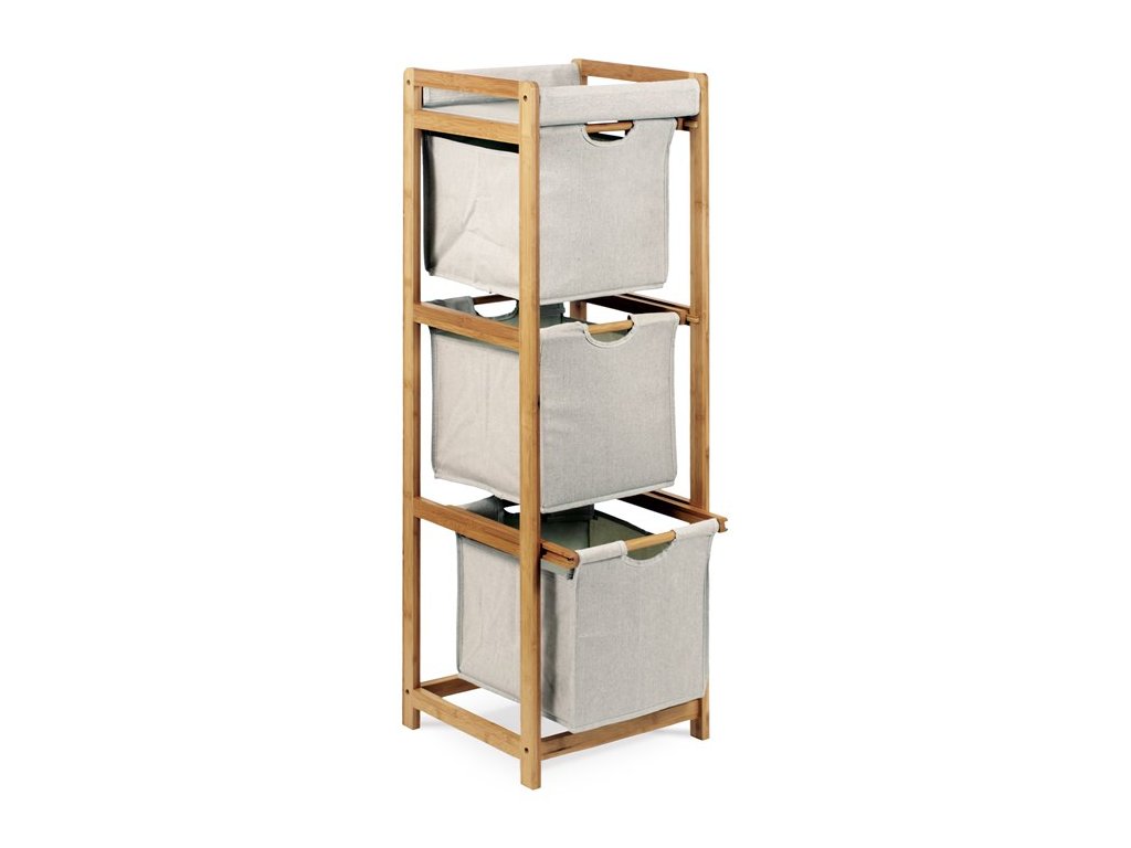 Multifunkční regál se třemi zásuvkami / boxy. Nosná konstrukce je vyrobena z masivního bambusu, lakovaného kvalitním trasparentním lakem. Bambus jako takový opdpuzuje vodu a touto povrchovou úpravou dosahuje velmi dobré voděodolnosti. Výsuvné boxy jsou vyrobeny ze středně hrubé látky v šedém odstínu se závěsným rámem z bambusu.Regál vhodný do koupelen, ale i do předsíní či místností, kde upotřebíte úložné prostory.Látkové boxy jsou prodyšné, jejich nosnost je až 3 kg, celková 9 kg. Ideálně regál k plné spokojenosti využijete k uložení ručníků, osušek nebo i části oblečení, popř. dalších věcí, dle potřeby.