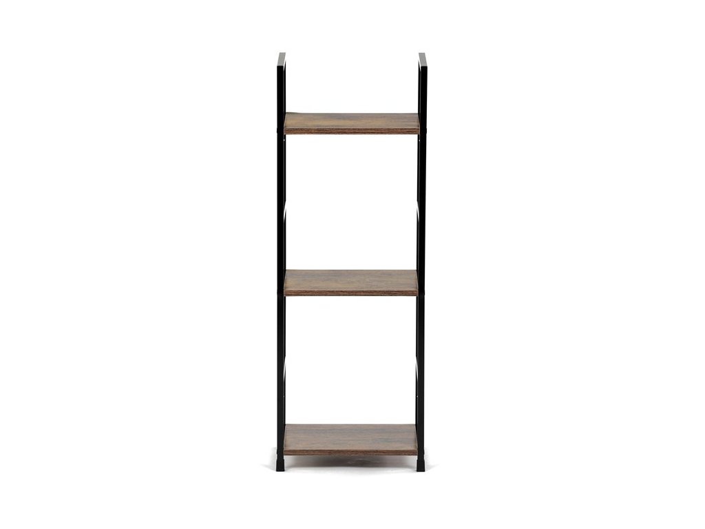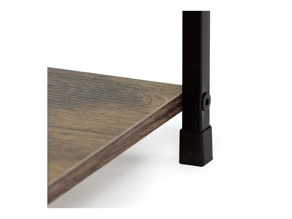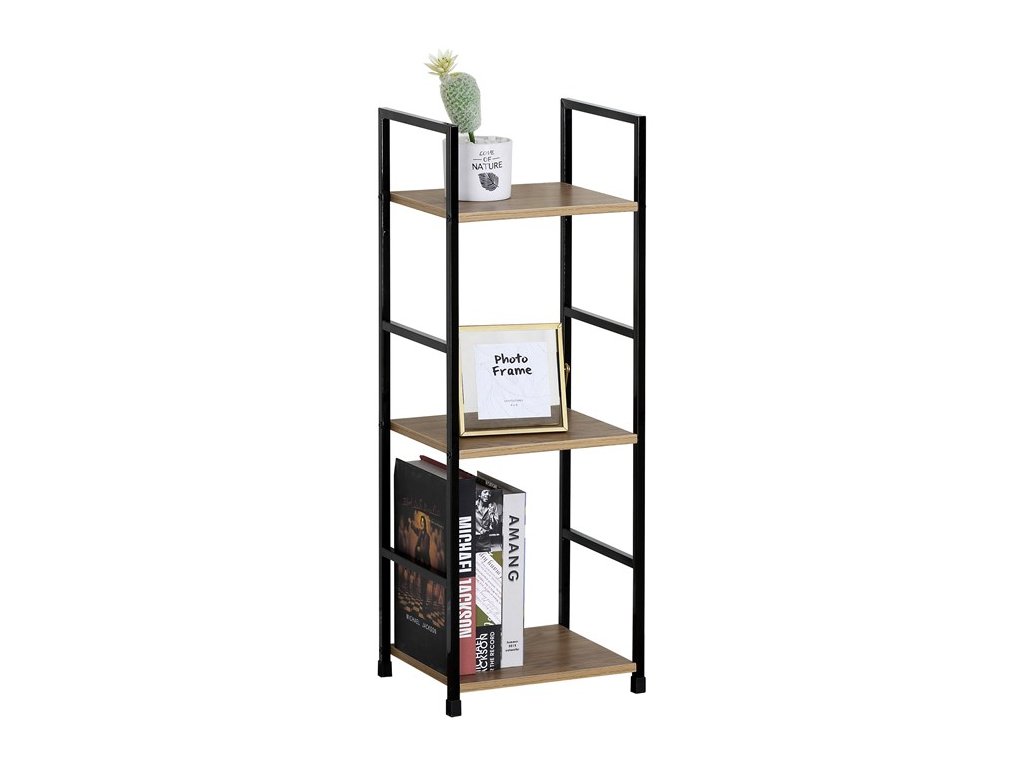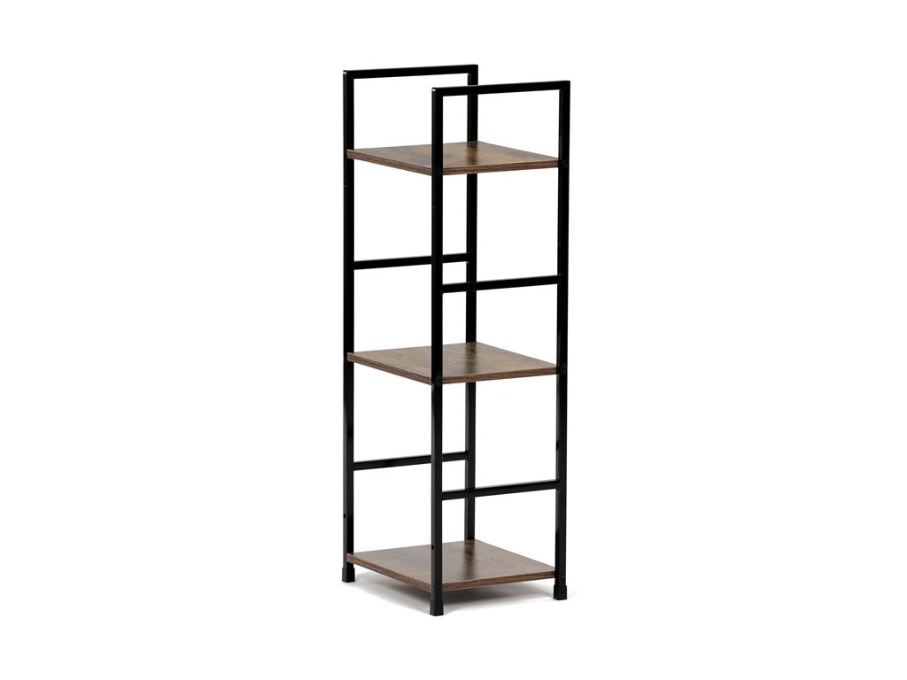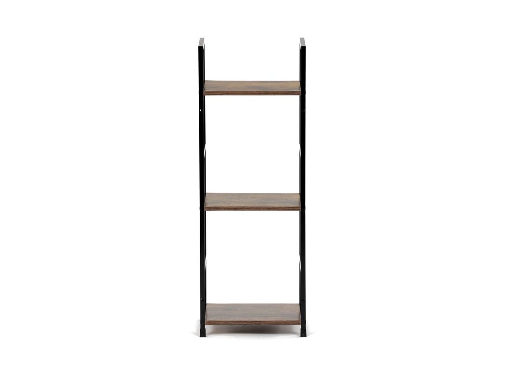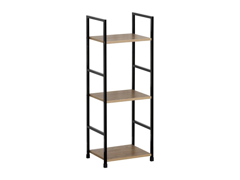 Odlehčený policový regál. Kostra vyrobena z kovových hranatých profilů černé barvy. Na police je použita MDF deska s povrchovou úpravou 3D folie v textuře dubu. Balení obsahuje sadu umožňující připevnění ke stěně.