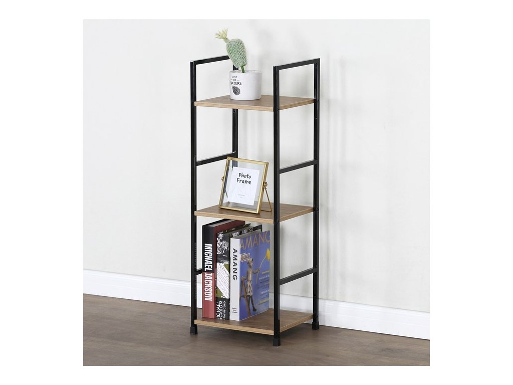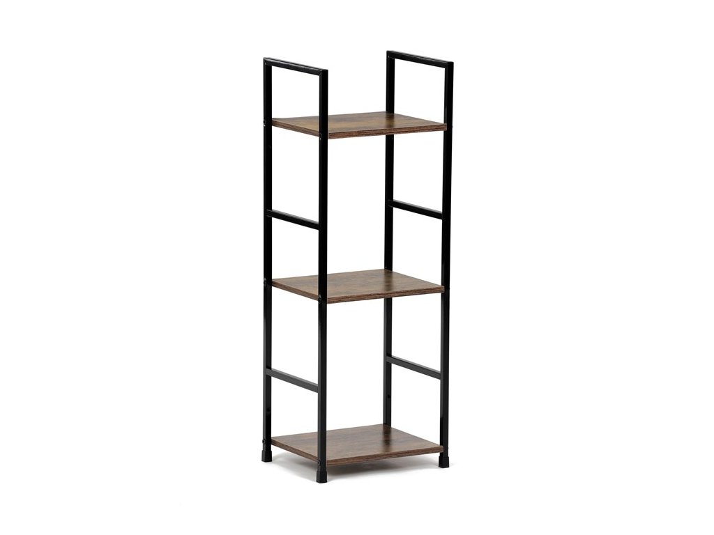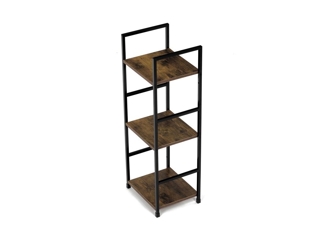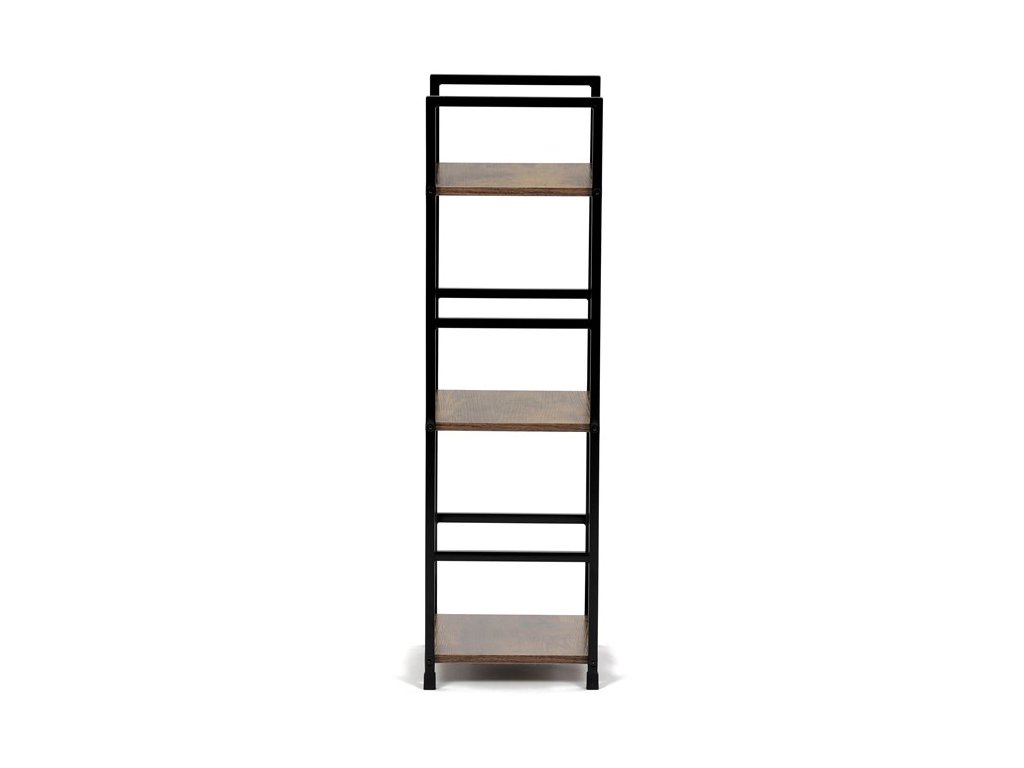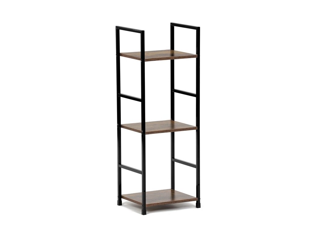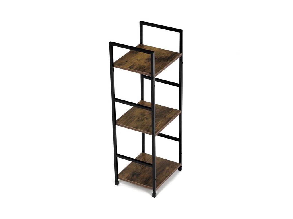 Odlehčený policový regál. Kostra vyrobena z kovových hranatých profilů černé barvy. Na police je použita MDF deska s povrchovou úpravou 3D folie v textuře dubu. Balení obsahuje sadu umožňující připevnění ke stěně.