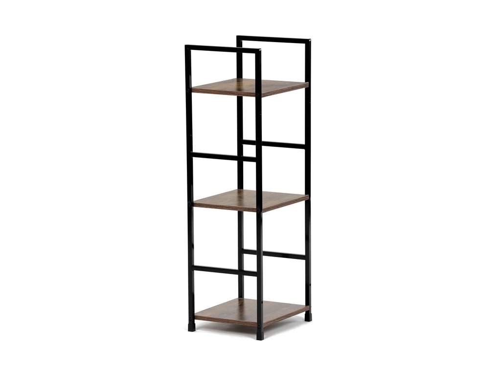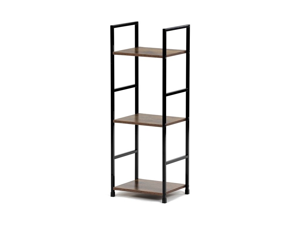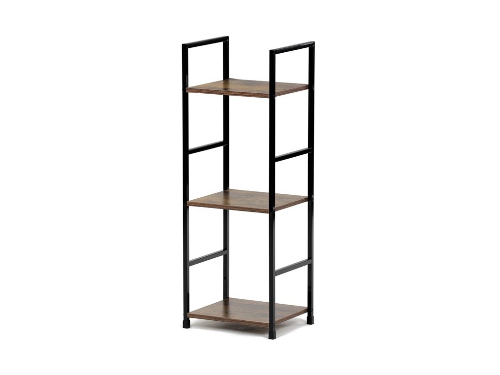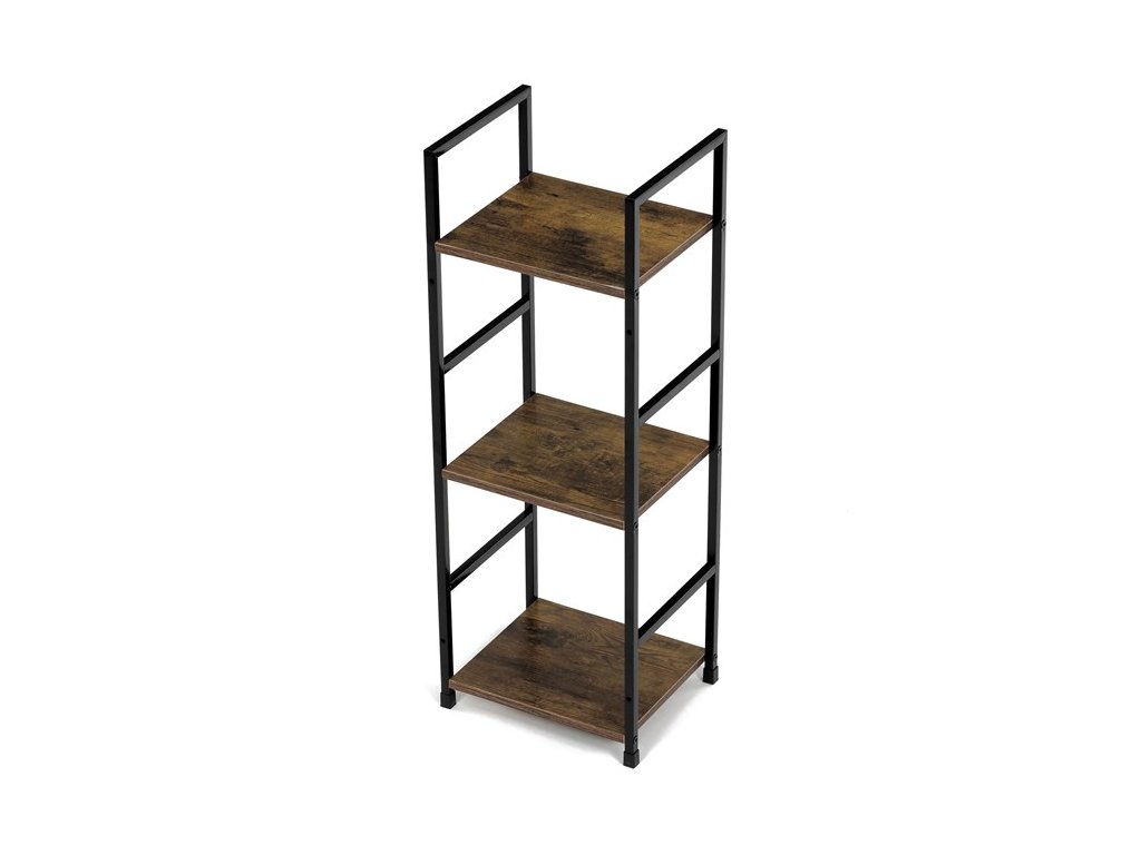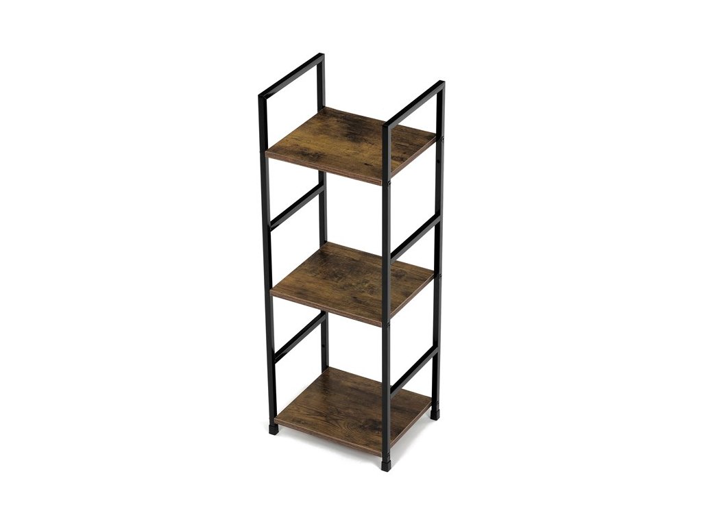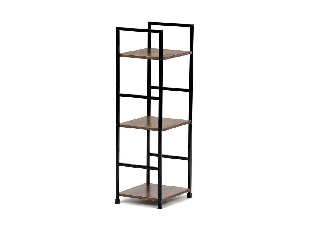 Odlehčený policový regál. Kostra vyrobena z kovových hranatých profilů černé barvy. Na police je použita MDF deska s povrchovou úpravou 3D folie v textuře dubu. Balení obsahuje sadu umožňující připevnění ke stěně.