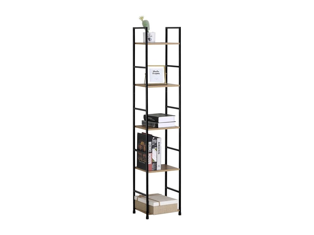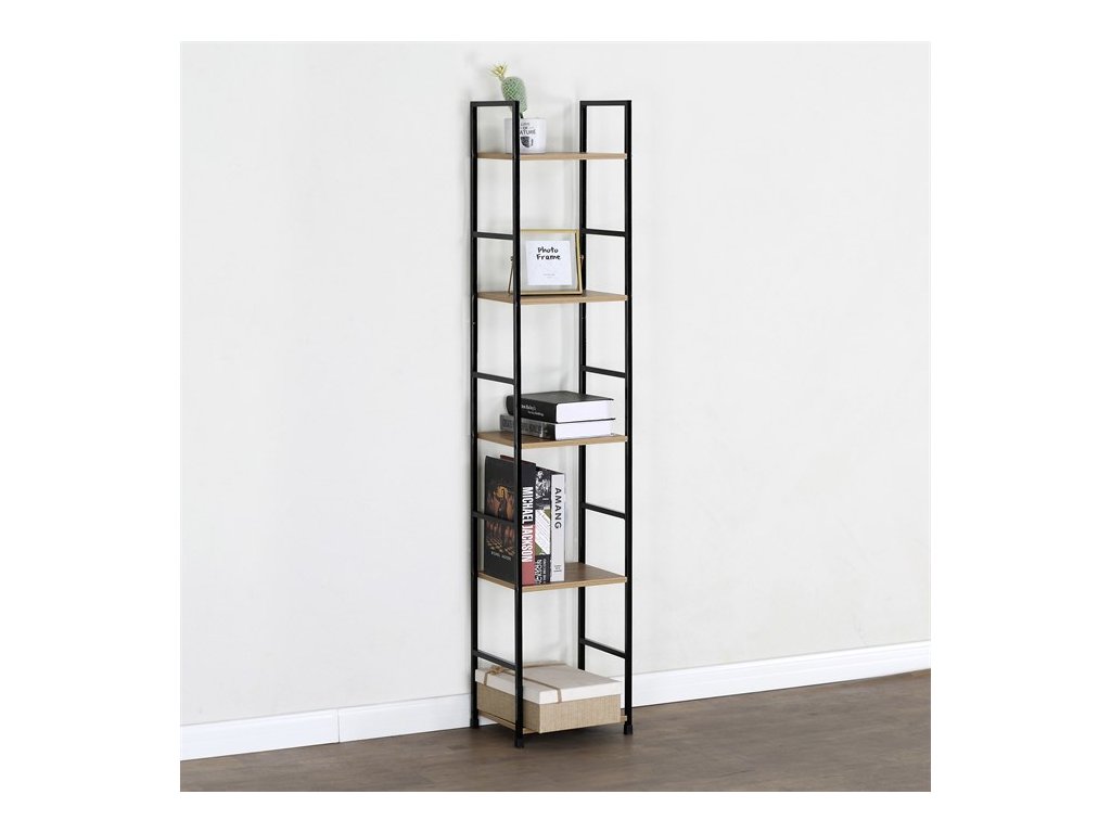 Odlehčený policový regál. Kostra vyrobena z kovových hranatých profilů černé barvy. Na police je použita MDF deska s povrchovou úpravou 3D folie v textuře dubu. Balení obsahuje sadu umožňující připevnění ke stěně.