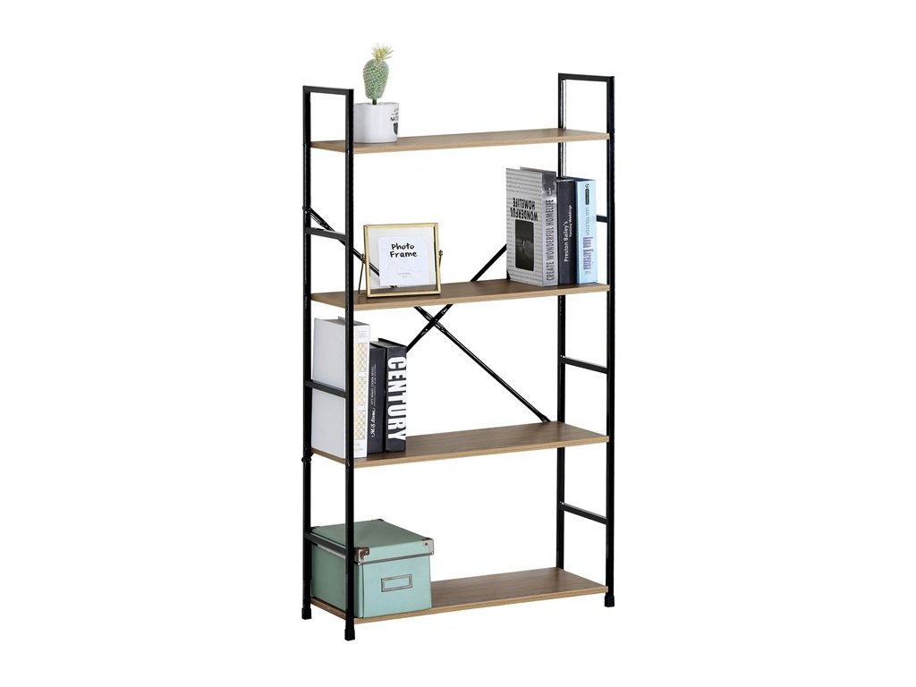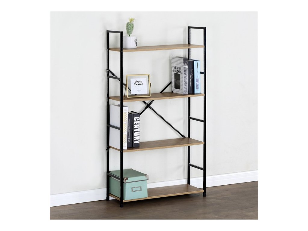 Odlehčený policový regál. Kostra vyrobena z kovových hranatých profilů černé barvy. Na police je použita MDF deska s povrchovou úpravou 3D folie v textuře dubu. Pro lepší stabilitu je na zadní straně kovová výztuha ve tvaru písmene X. Balení obsahuje sadu umožňující připevnění ke stěně.