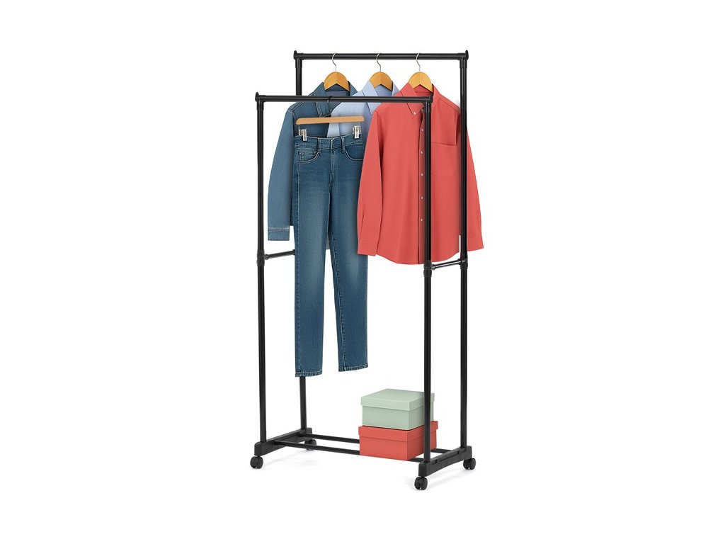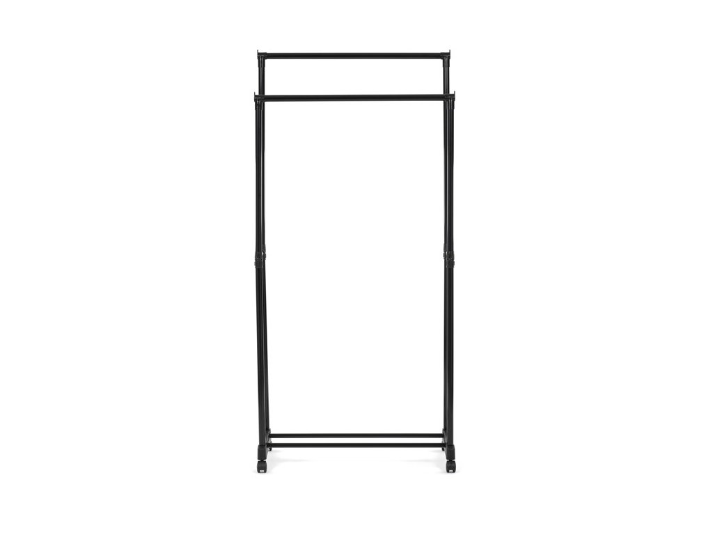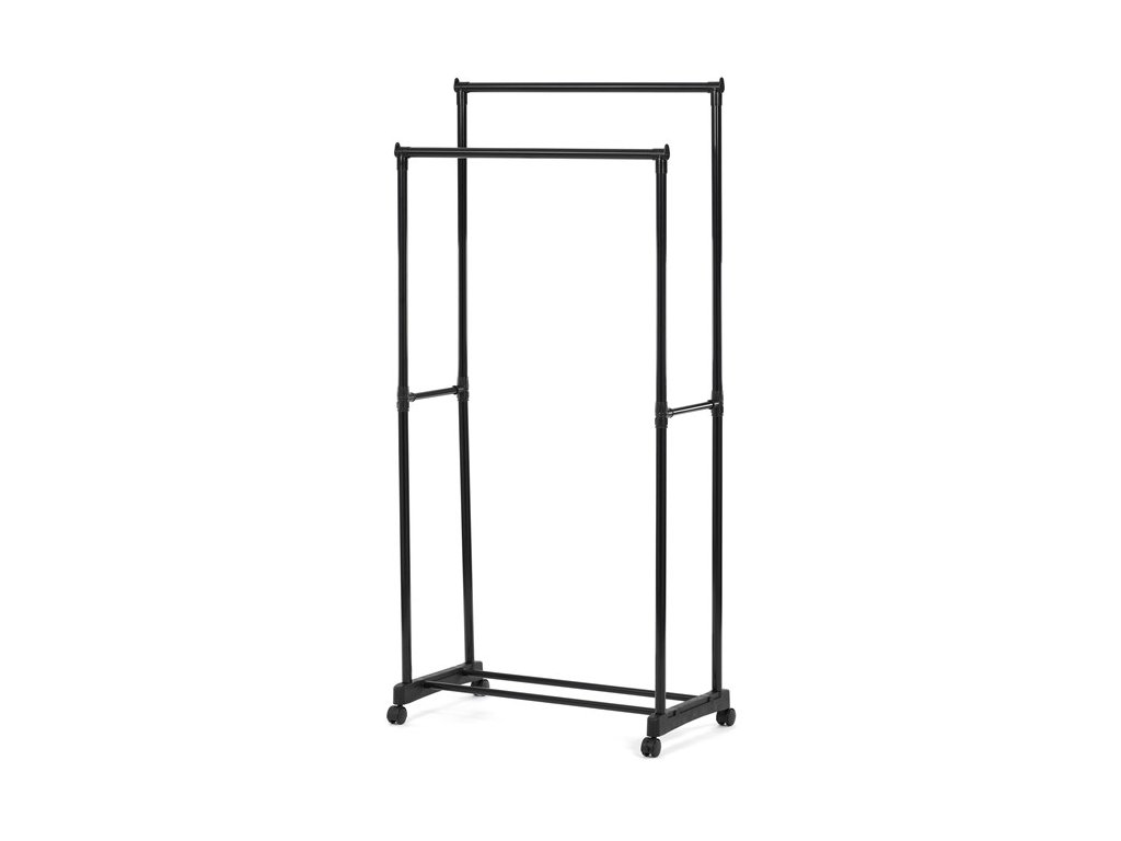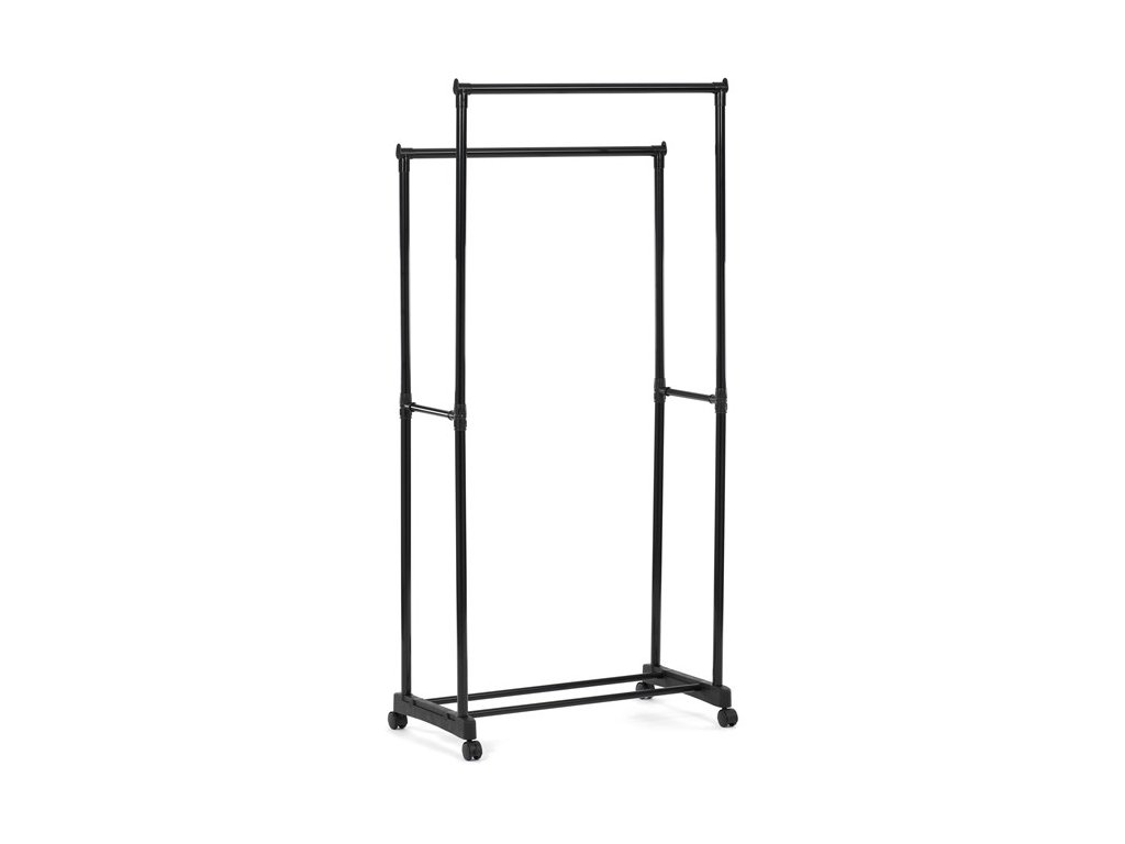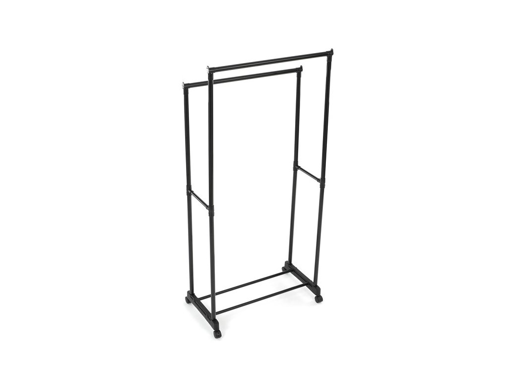 Praktický stojan na šaty značky Autronic je ideálním řešením pro přehledné uspořádání oblečení a doplňků. Černá kovová konstrukce nabízí odolnost a moderní vzhled, který snadno zapadne do jakéhokoli interiéru. Stojan disponuje dvěma tyčemi na zavěšení oděvů a dolní policí pro boty či tašky. Díky kolečkům je snadno přemístitelný a nabízí flexibilitu při jeho využití. Nastavitelná výška umožňuje přizpůsobení vašim potřebám, což z něj činí ideální doplněk do šatny, ložnice nebo předsíně.