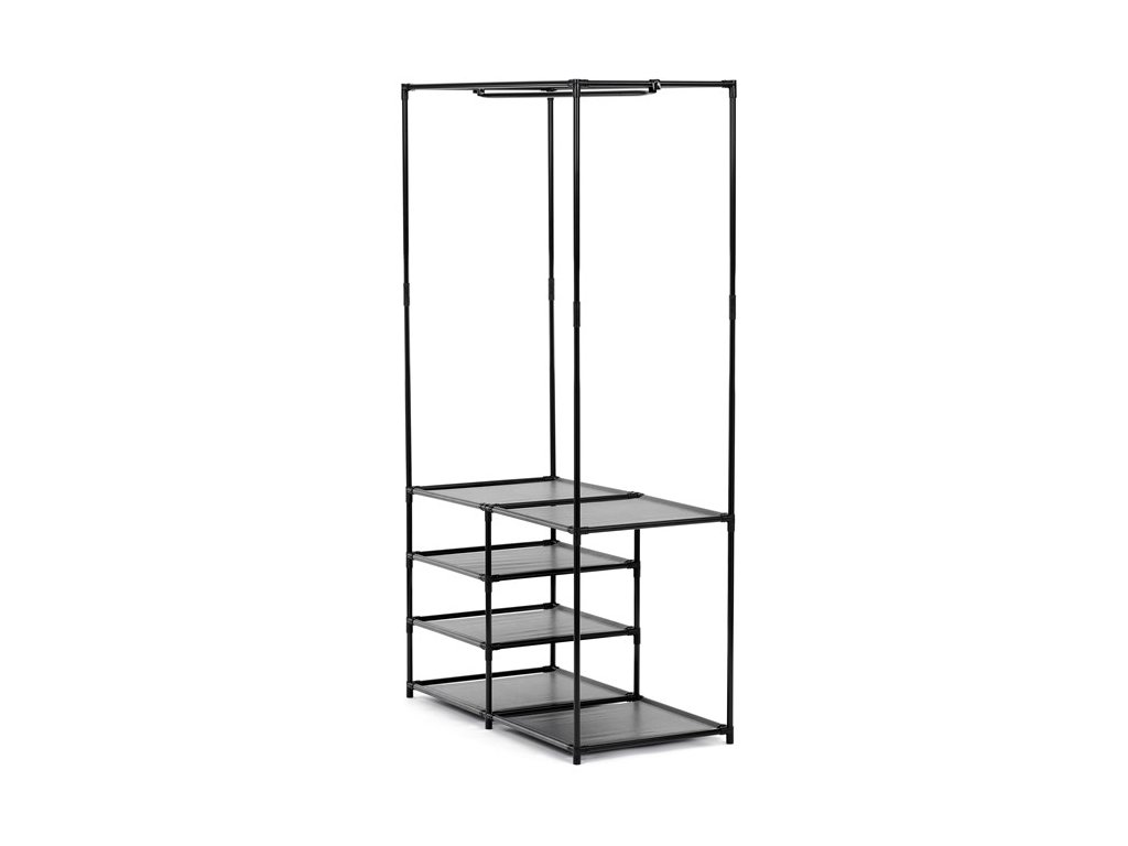 Moderní stojan na šaty značky Autronic spojuje praktičnost s elegantním designem. Stabilní černá kovová konstrukce nabízí nejen prostor pro zavěšení oděvů, ale také čtyři police pro uložení krabic, bot nebo doplňků. Díky otevřenému provedení je vše snadno přístupné a přehledné, což z něj činí ideální doplněk do šatny, ložnice nebo předsíně. Minimalistický styl snadno zapadne do různých typů interiérů a pomáhá vytvořit praktické a organizované prostředí. Skvělá volba pro každodenní použití.