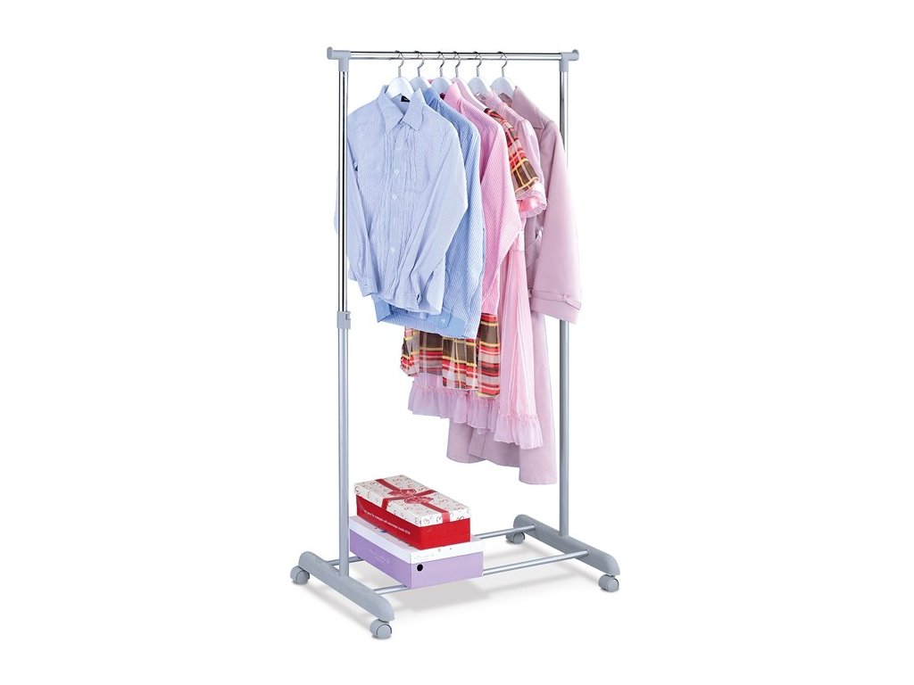 Jednoramenný stojan na šaty v šedém provedení kombinuje kovovou chromovanou tyč s plastovými prvky, což zajišťuje pevnost a stabilitu při zachování lehkosti. Výška stojanu je nastavitelná, což umožňuje přizpůsobení různým délkám oděvů. Spodní odkladač poskytuje praktický prostor pro uložení krabic nebo bot, čímž zvyšuje funkčnost a usnadňuje organizaci prostoru. Stojan je osazen kolečky pro snadnou manipulaci a přesun v interiéru. Je ideální pro dočasné i dlouhodobé zavěšení oděvů v domácnostech, obchodech či ateliérech.