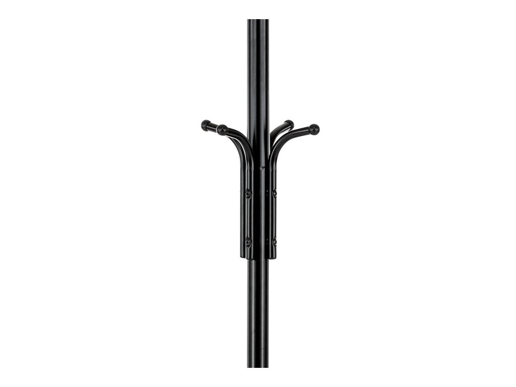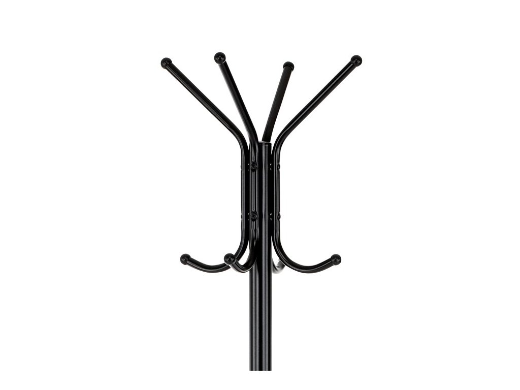 Stojanový věšák s výškou 182 cm je vyroben z pevného kovu s matnou černou povrchovou úpravou, která zajišťuje odolnost proti poškození a snadnou údržbu. Věšák nabízí celkem deset háčků rozmístěných ve dvou úrovních, což umožňuje efektivní zavěšení kabátů, klobouků či tašek. Stabilní kulatá základna přispívá k bezpečnému postavení a nosnost 10 kg odpovídá běžným nárokům na zavěšení více kusů oblečení. Díky jednoduchému a funkčnímu designu se hodí do kanceláří, vstupních hal i domácností.